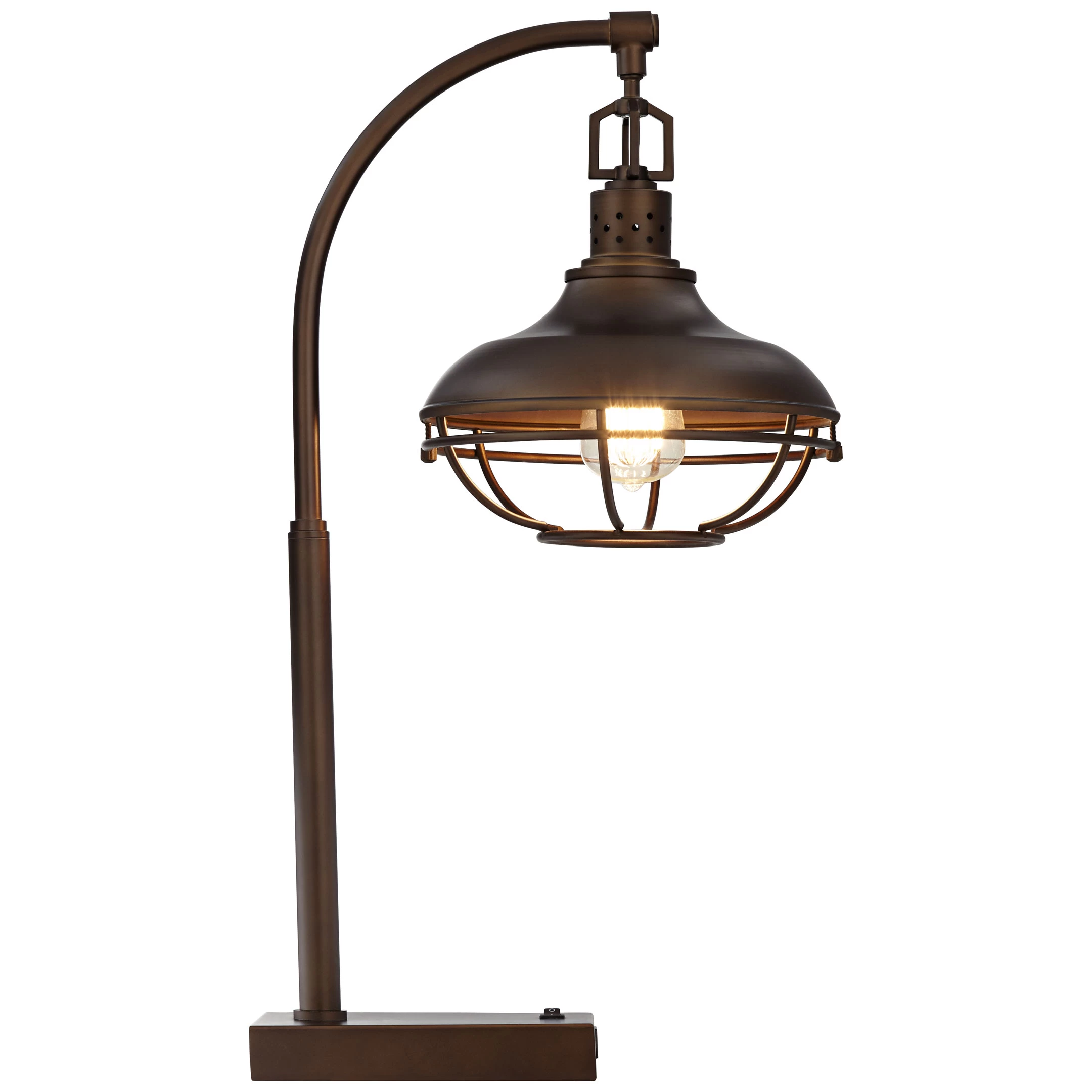 The Millennial Table Lamp features a curved metal frame with a lantern-inspired cage shade to create an industrial feel. A bronze finish gives the piece a timeless feel, and a USB port on the base provides modern convenience. On/off switch located on base.