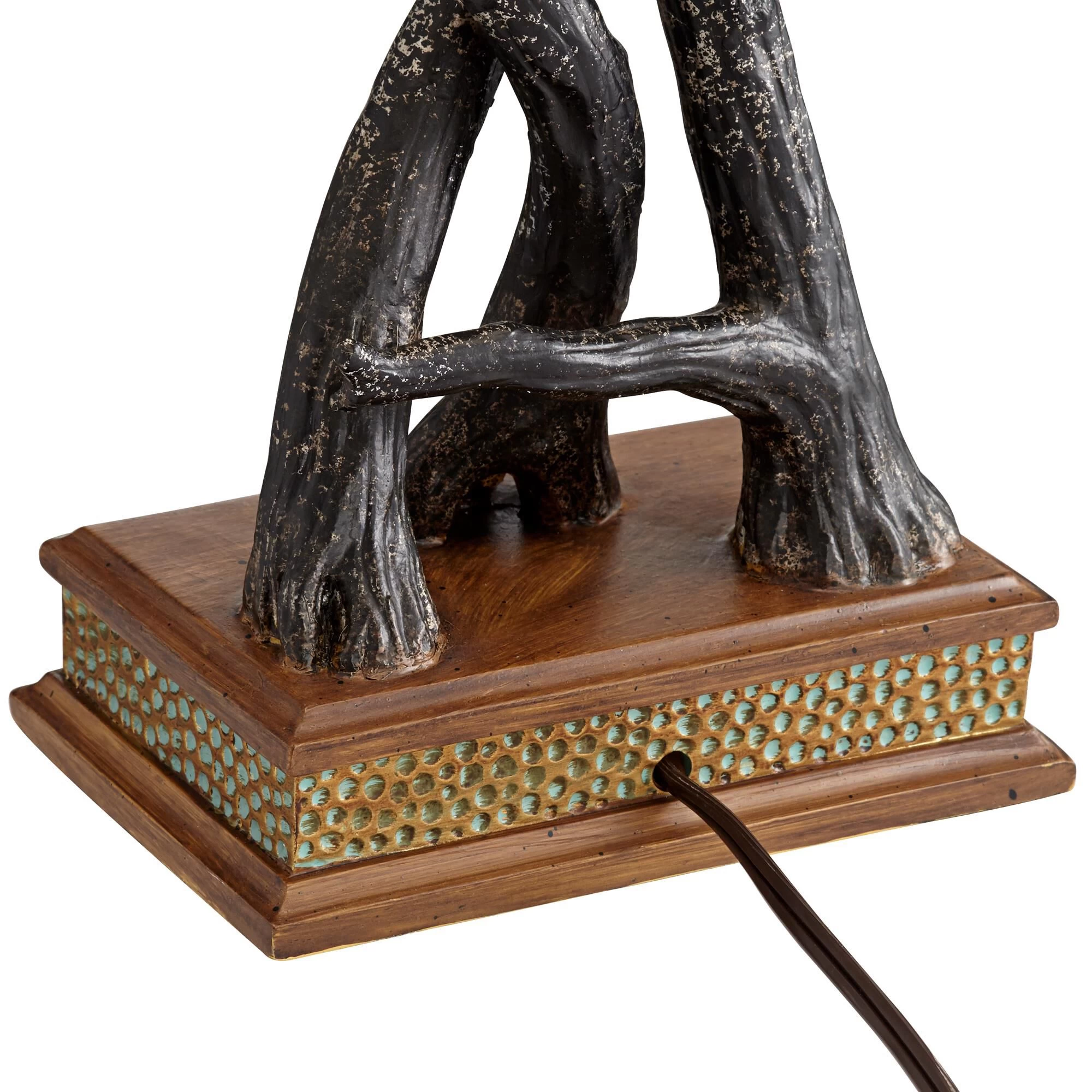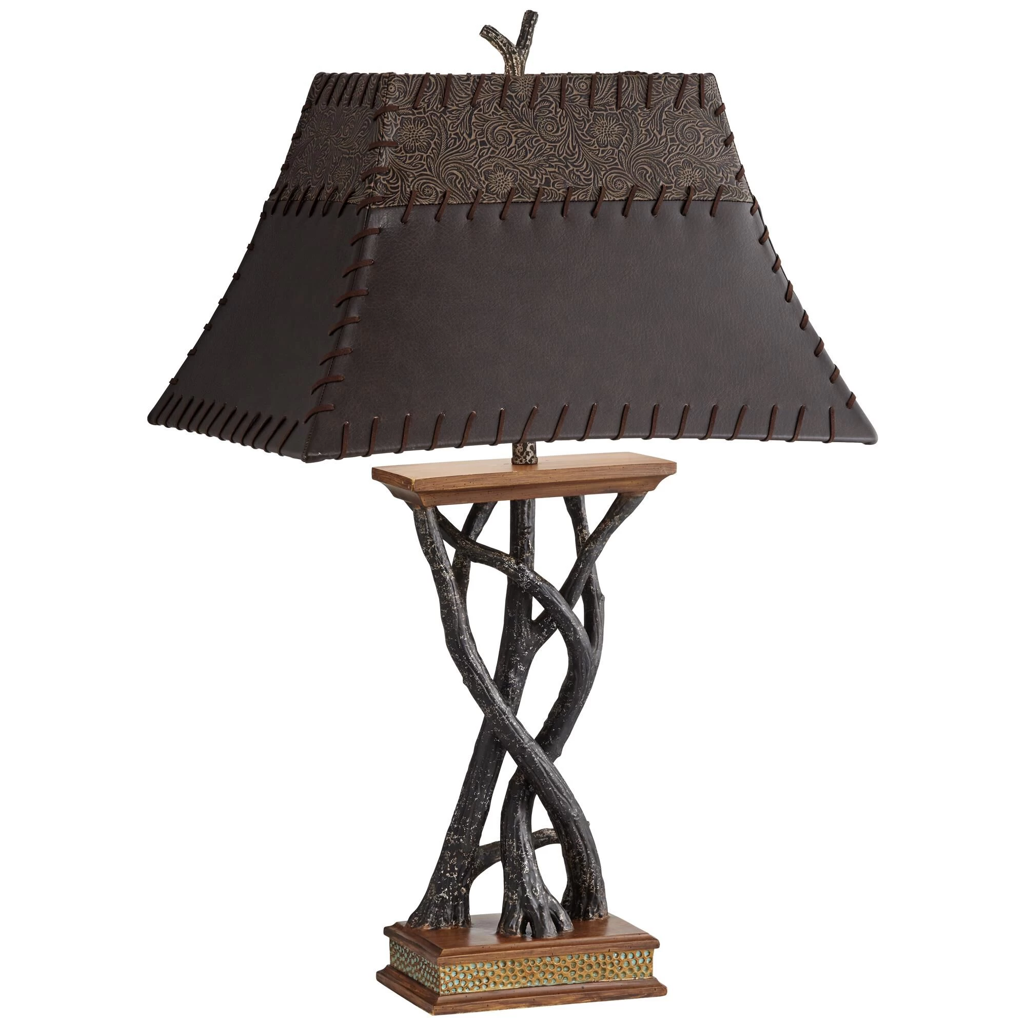 An eye-catching addition to a rustic inspired home, this dark fruitwood finish resin table lamp is made to stand out. Its tree branch-inspired base and faux leather shade add a dramatic accent to living room decor. The sculptural design is sure to decorate a room in style.