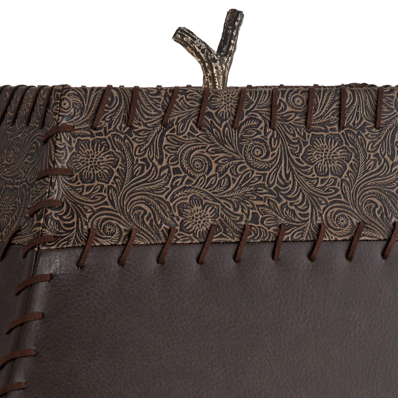 The Montana Reflection Table will make a dramatic statement in a rustic-inspired interior. The faux leather shade features exposed stitching and a floral pattern on the upper portion. The branching faux wood base is finished in a Dark Fruitwood finish for a natural accent. On/off switch located on socket.