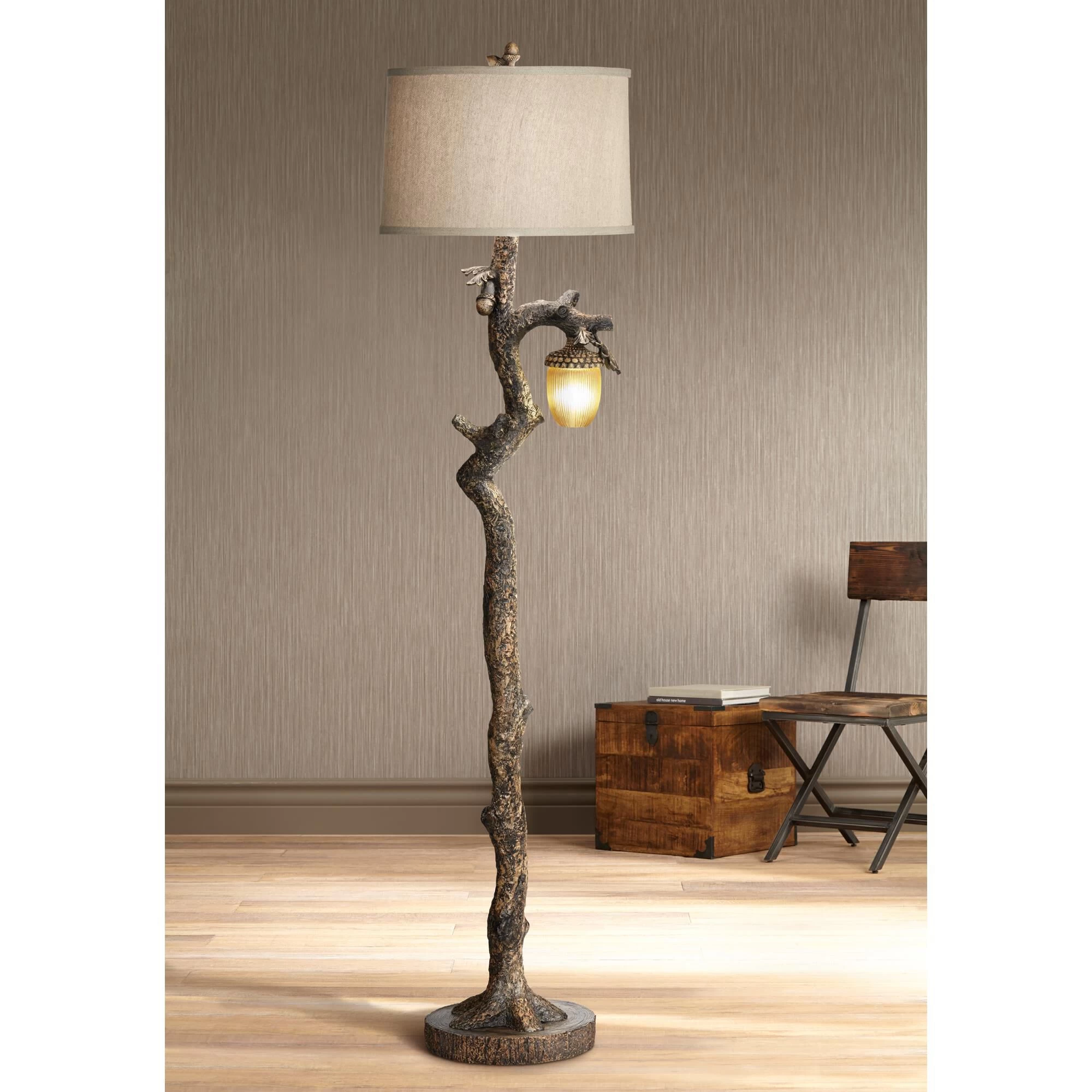 An acorn-inspired lantern nightlight hangs from the realistic branch of this rustic lodge floor lamp. Crafted to imitate a knurled tree trunk, the lamp is ideal for a mountain cabin or themed den or living area. Richly textured and finished, the floor lamp is capped with a warm burlap drum shade for welcoming ambiance.