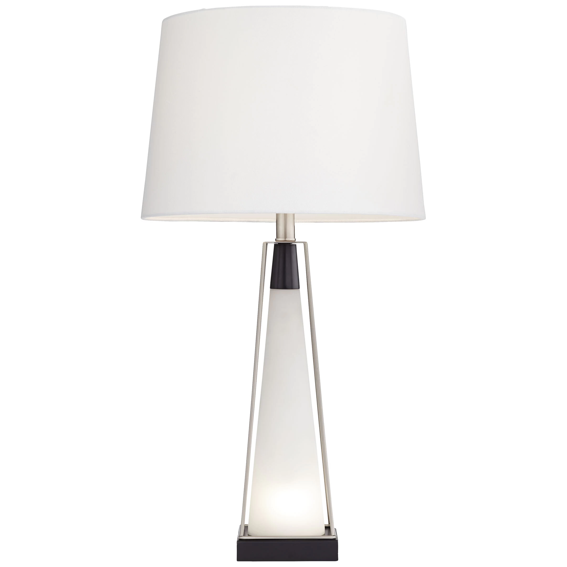 Cool and contemporary, the Nina Table Lamp features a tapering, conical silhouette with a linen shade on top. A built-in nightlight housed within the glass body makes this piece perfect for a bedside table.
