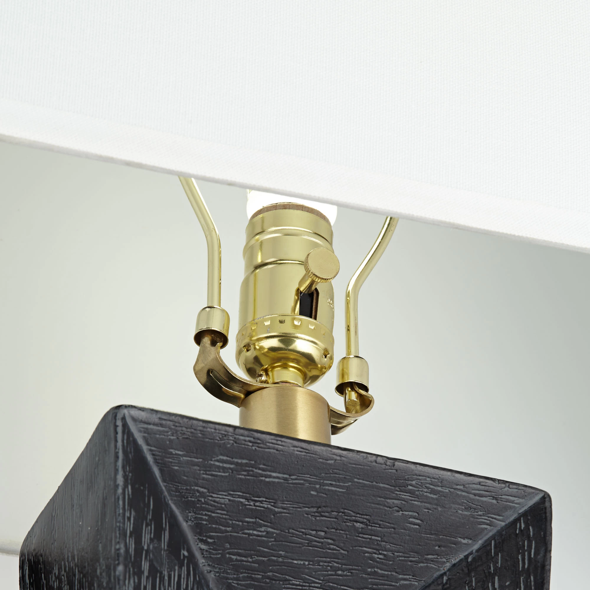 The Norah Table Lamp’s distinctive silhouette is sure to make a statement in a contemporary interior. The resin base features a faux cerused wood finish and a rectangular cut out to create a light, open feel. A white linen shade and Brass metal accents add a sophisticated touch. A USB charging port on the base provides convenient access to power for charging a phone or other devices, and an on/off switch is installed on the socket.