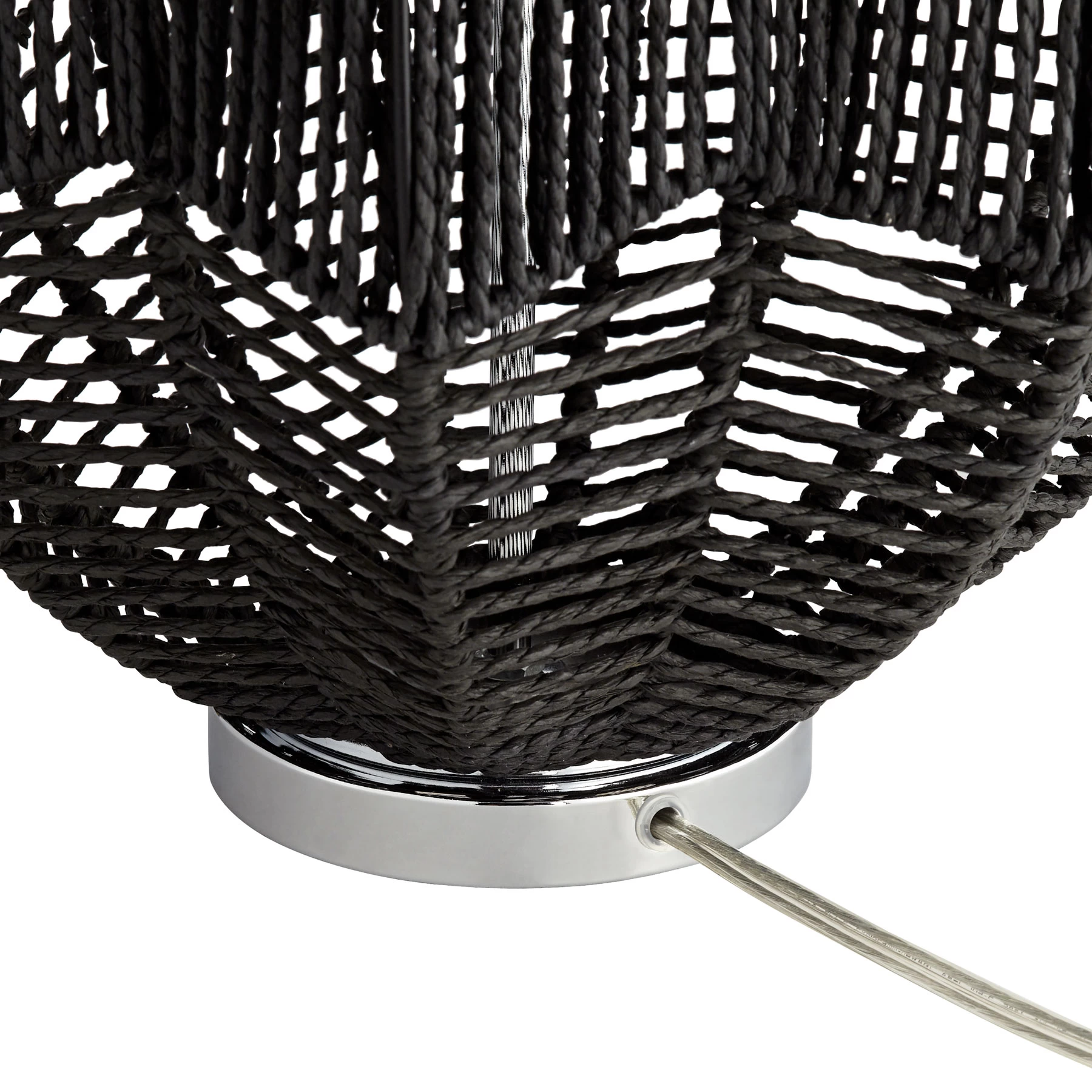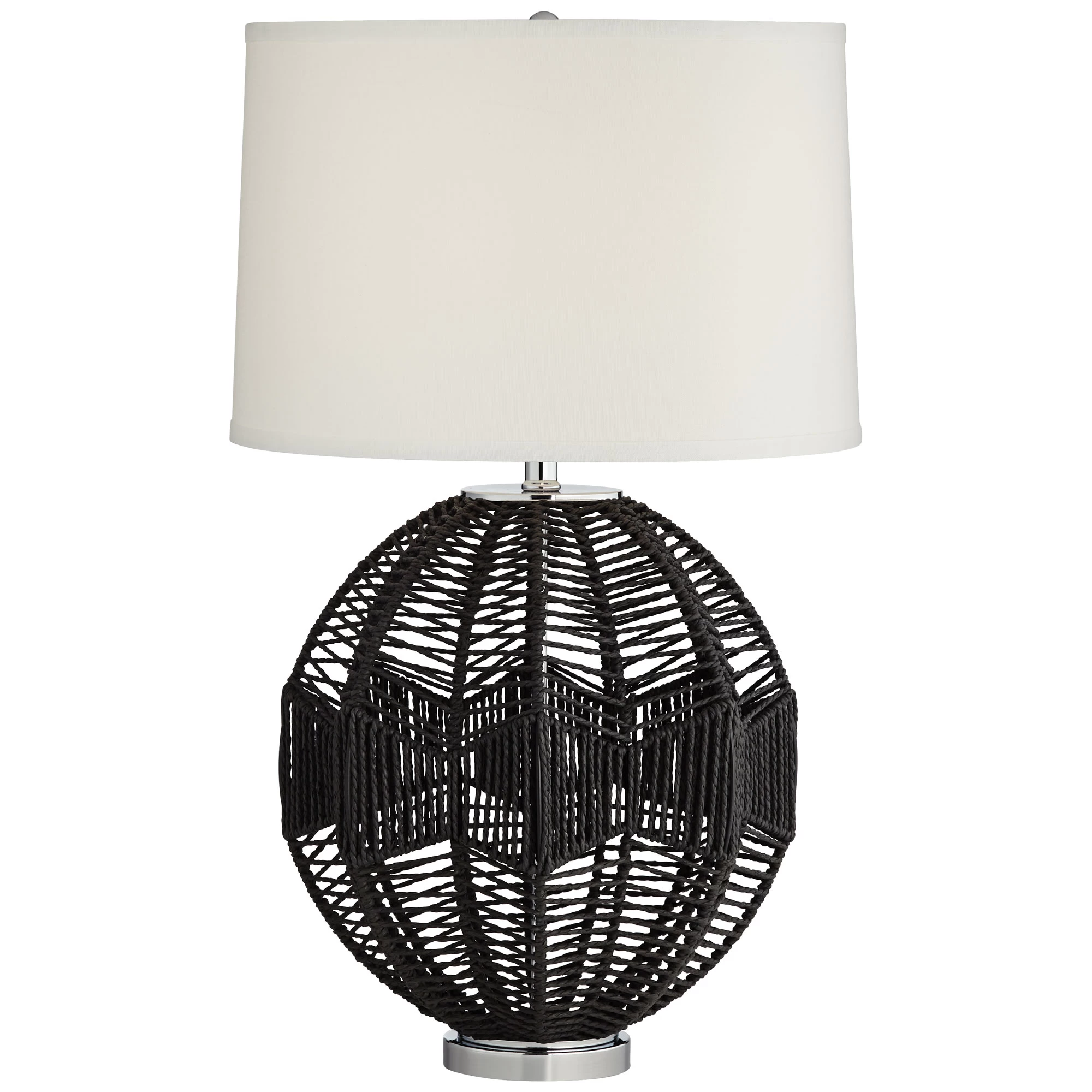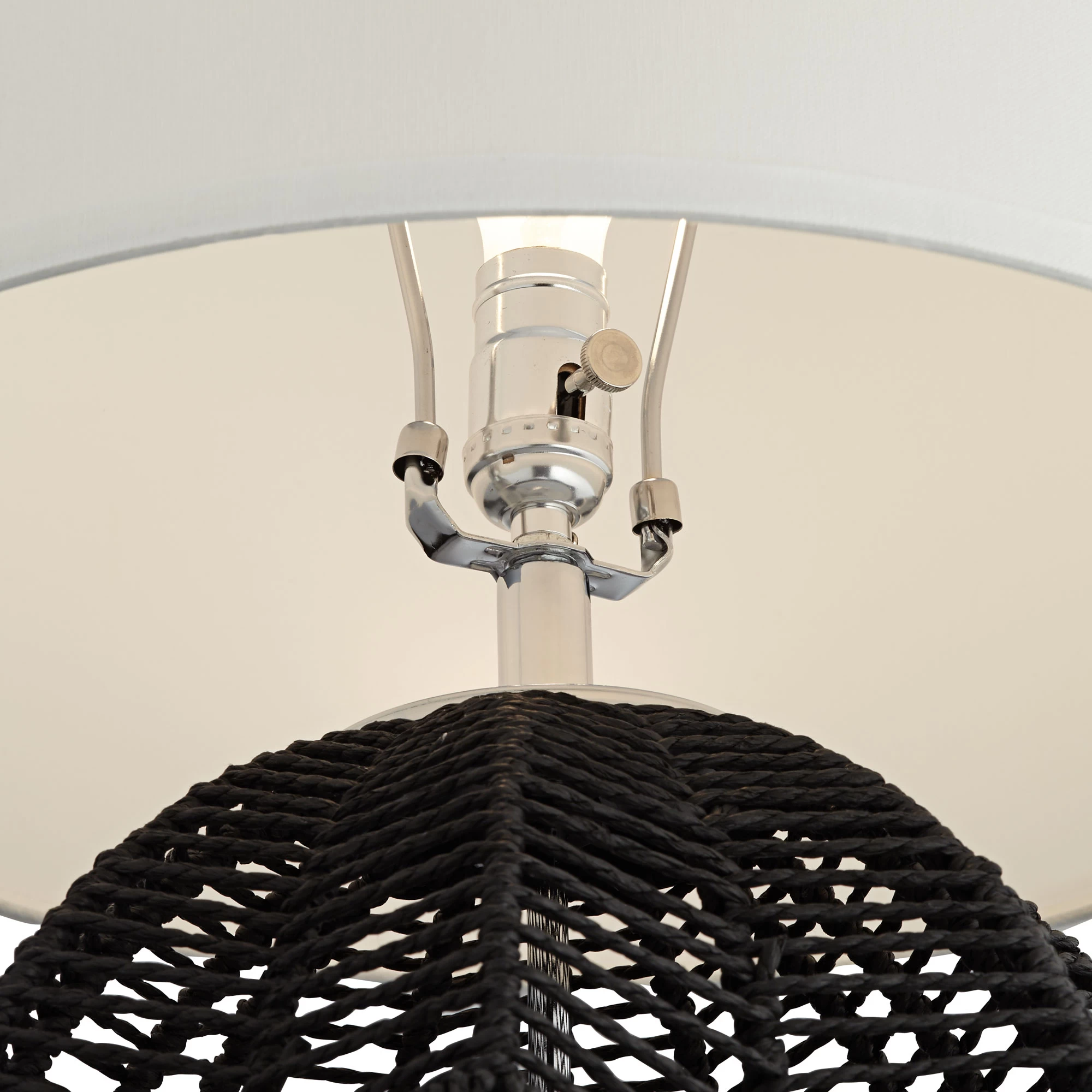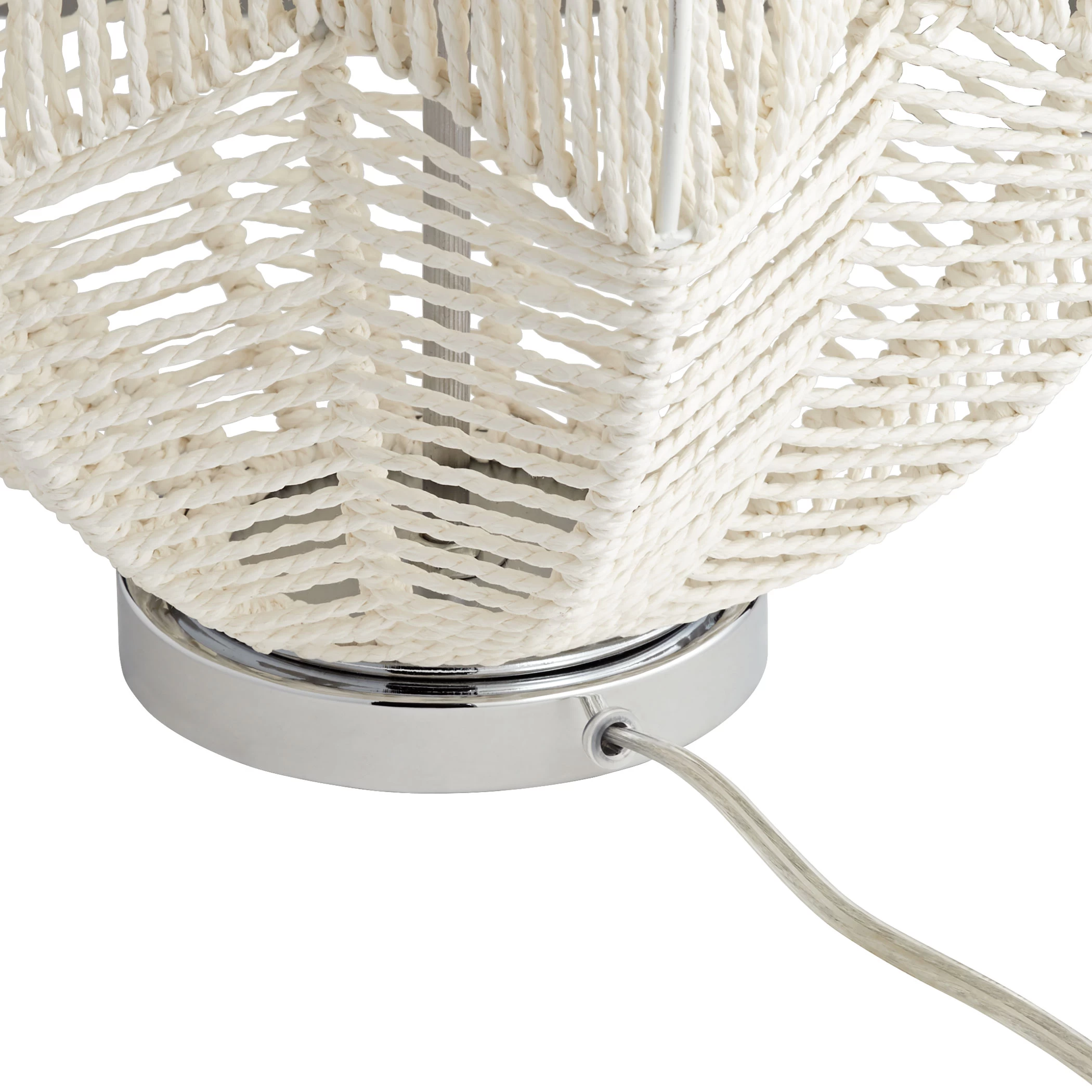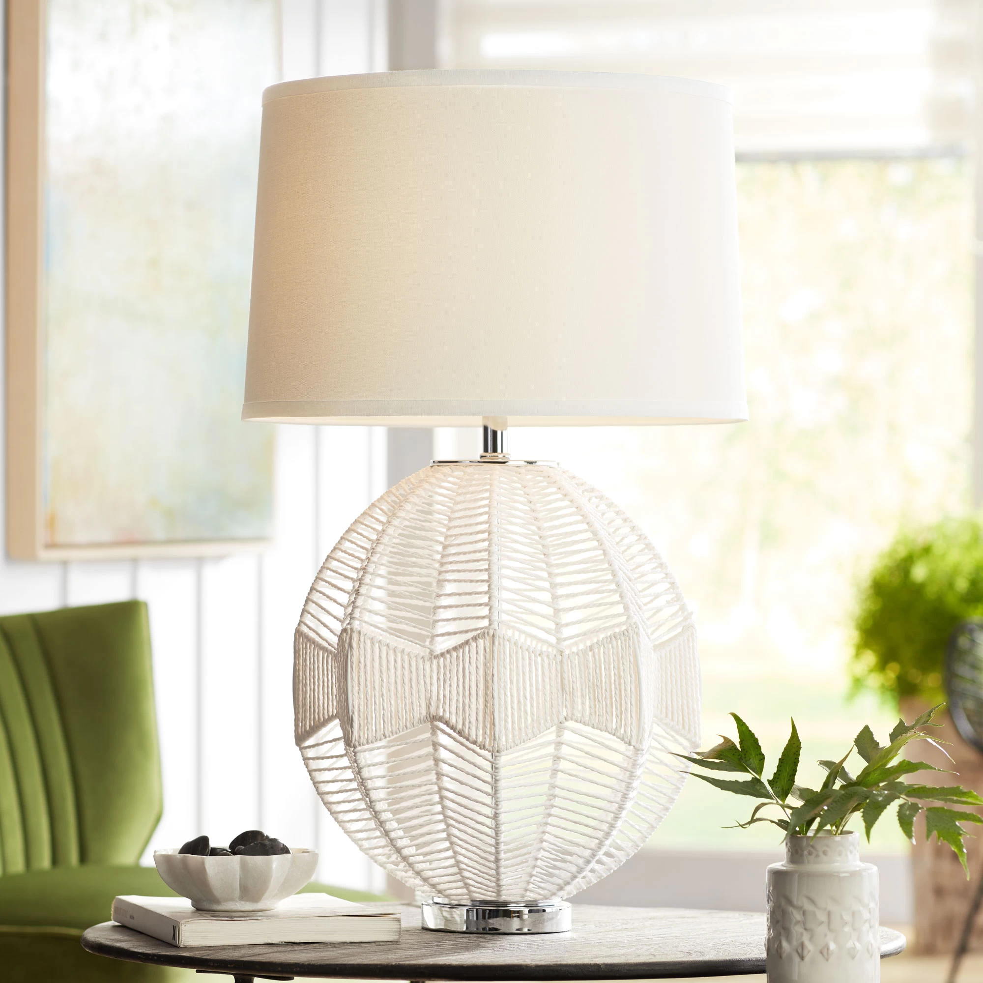 The North Shore Table Lamp offers a coastal aesthetic with a string body in a rounded geometric shape for a simple and organic appearance. The design is topped with an off-white linen drum shade. On/off switch installed on socket.