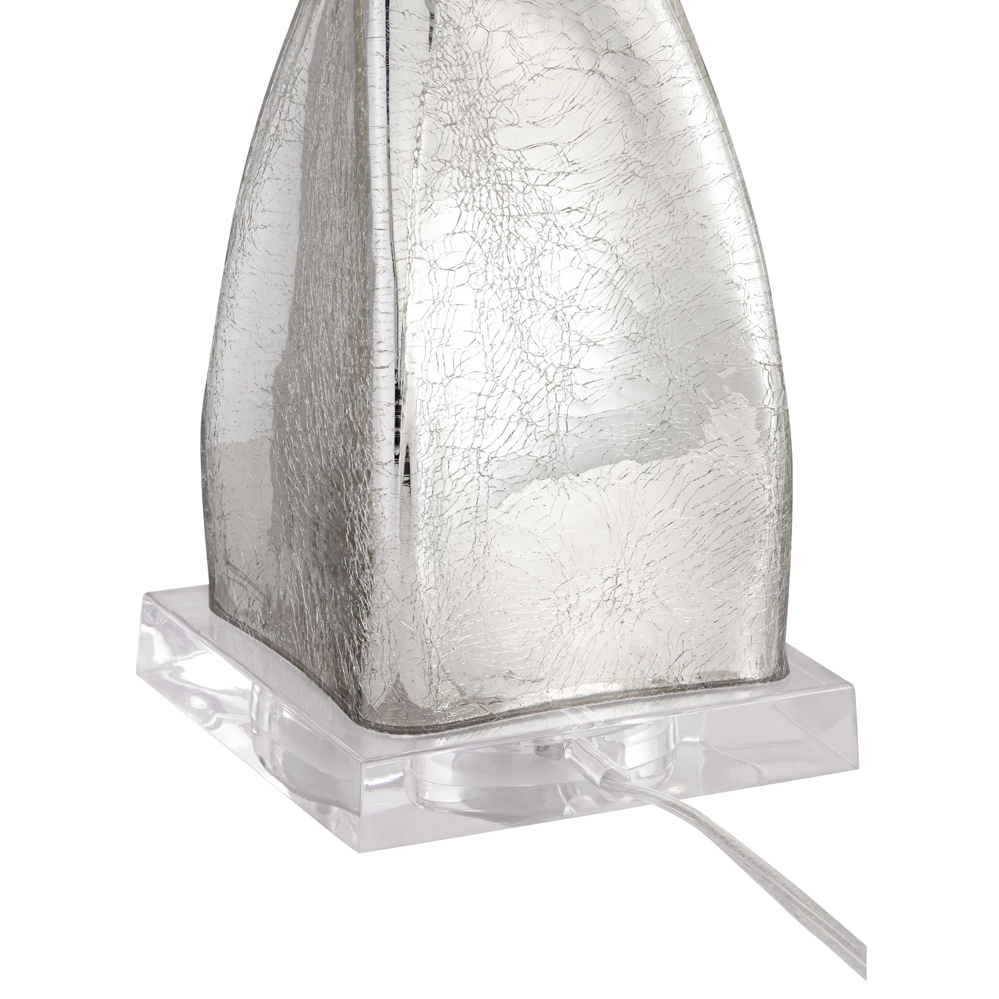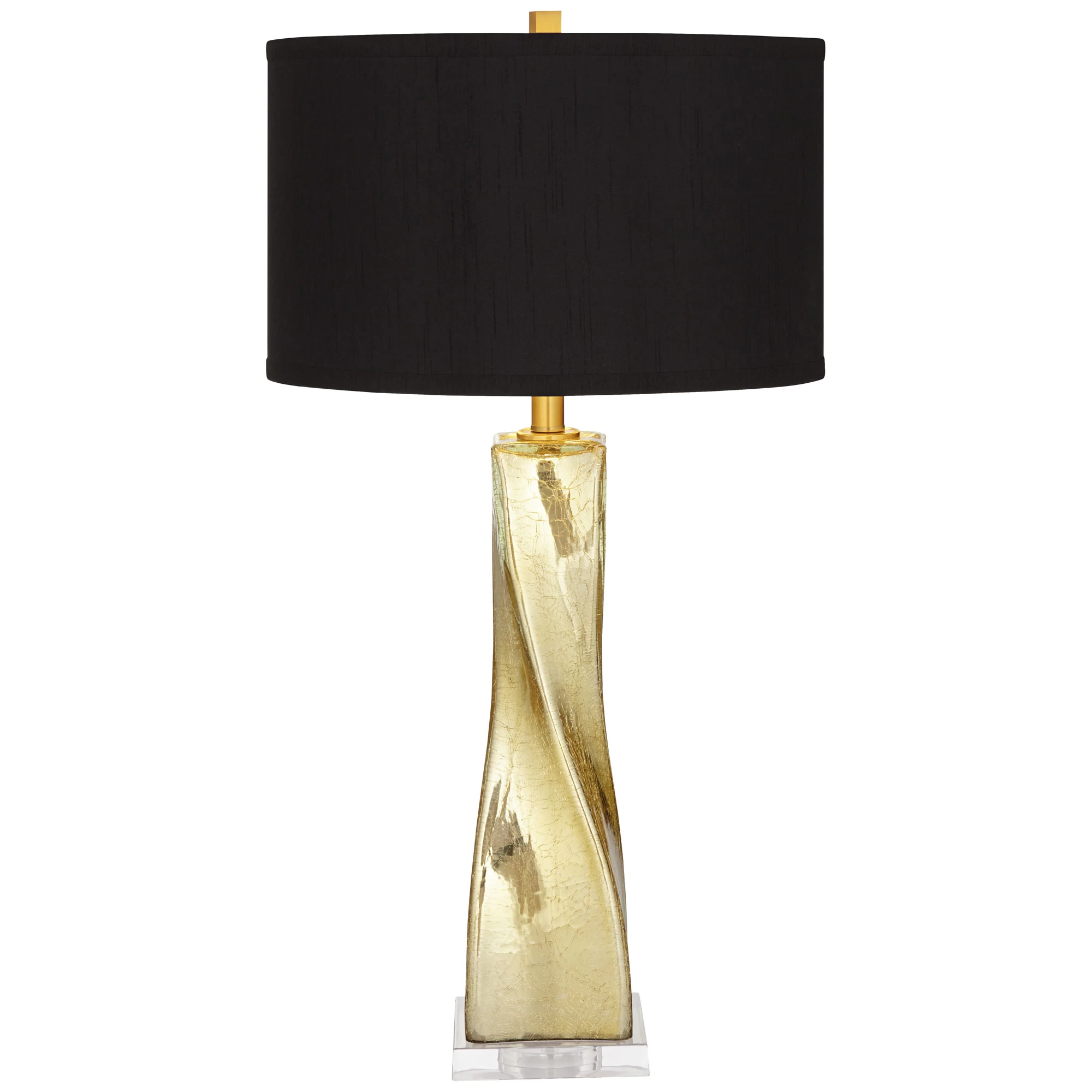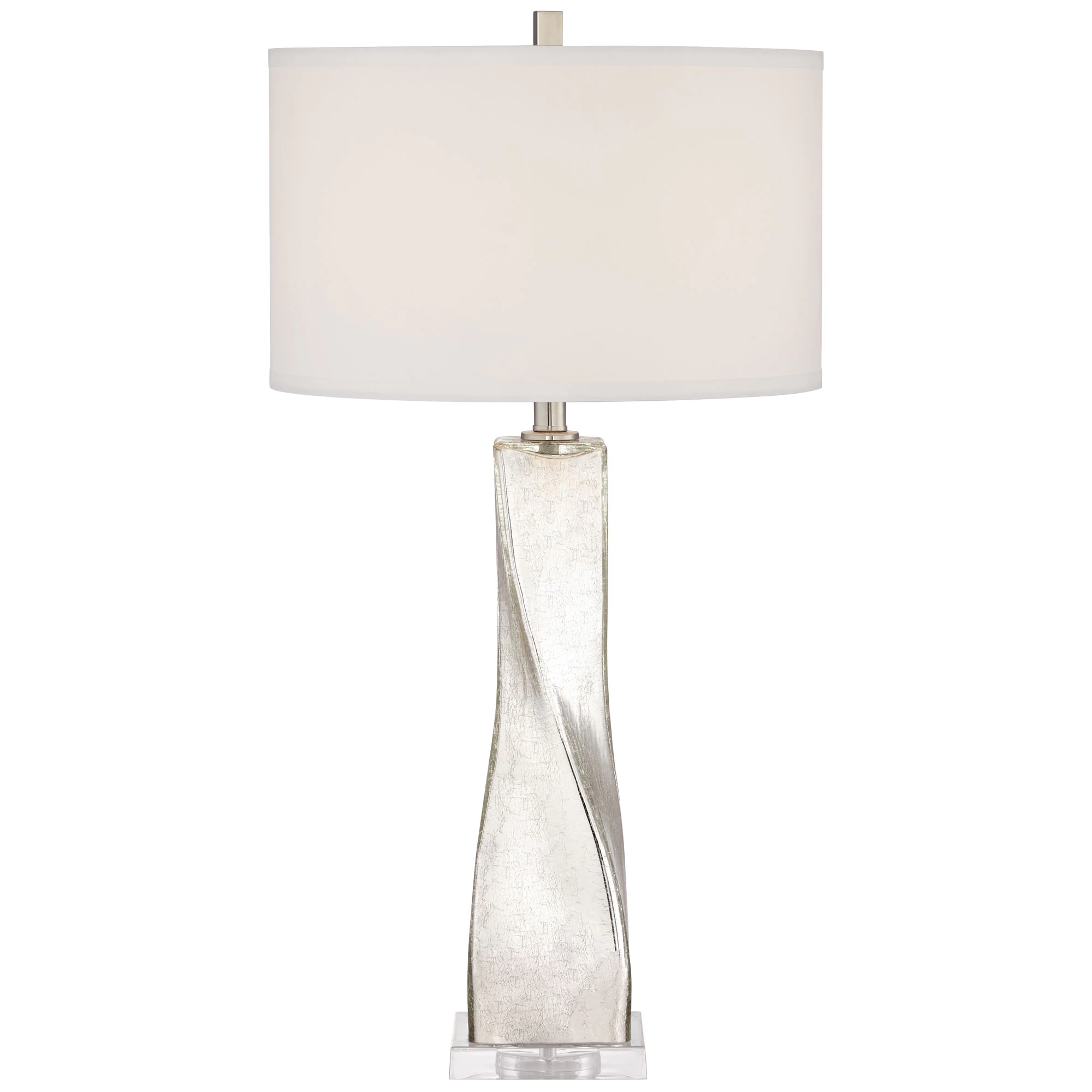 The Orin Table Lamp features a twisted glass base in a crackled metallic finish on top of an acrylic foot. Its glamorous look is completed by a faux silk drum shade and matching metal finial. A rotary on/off switch is installed on the socket.