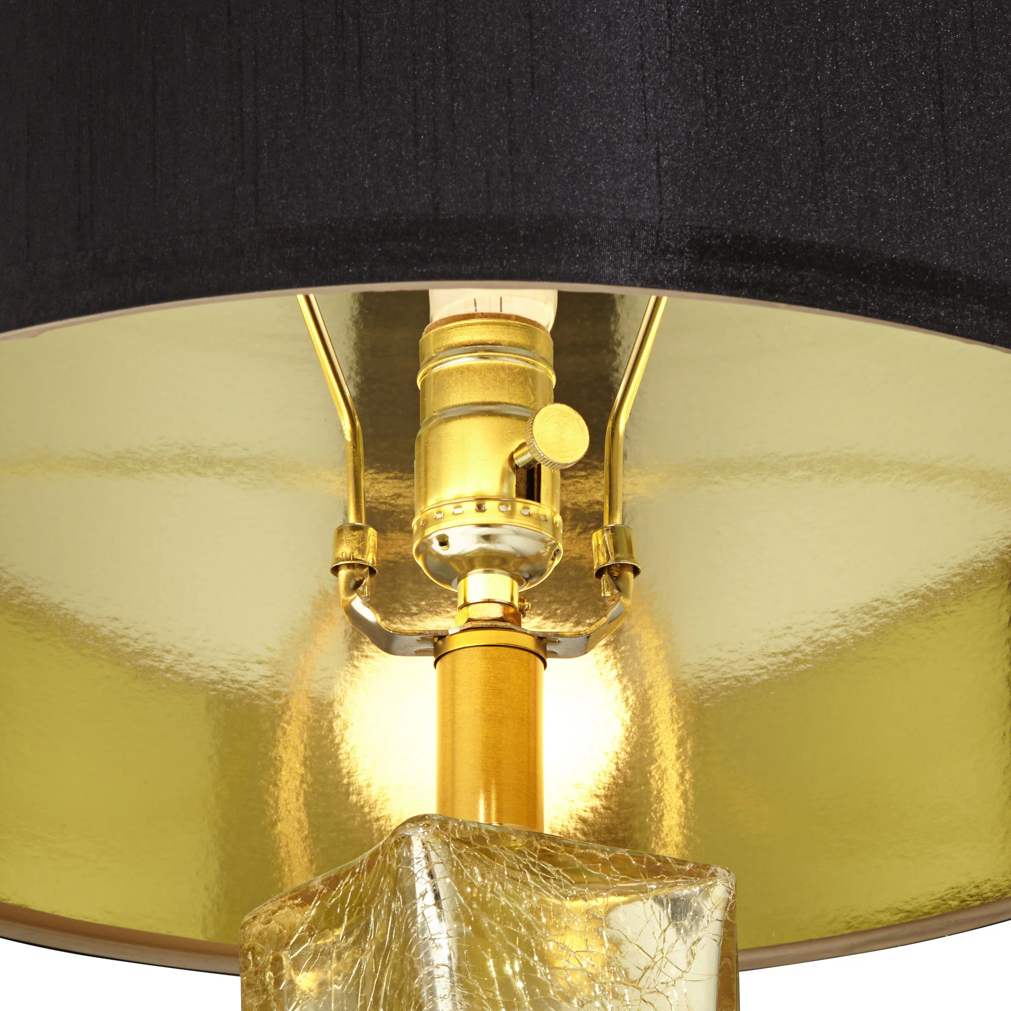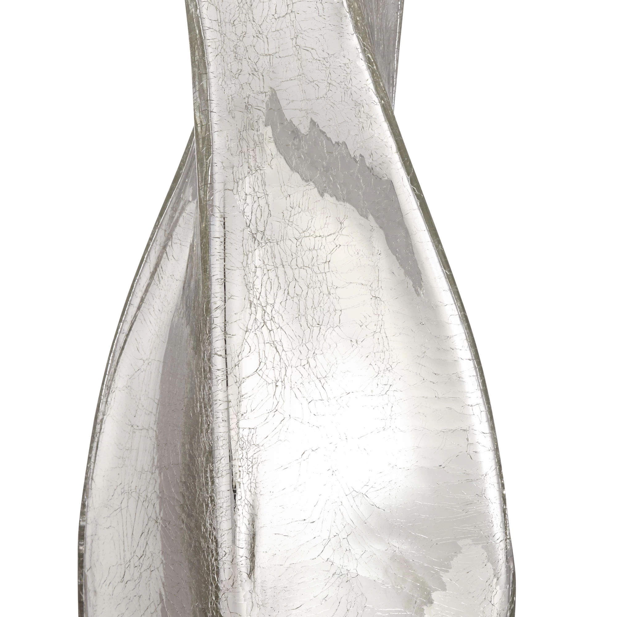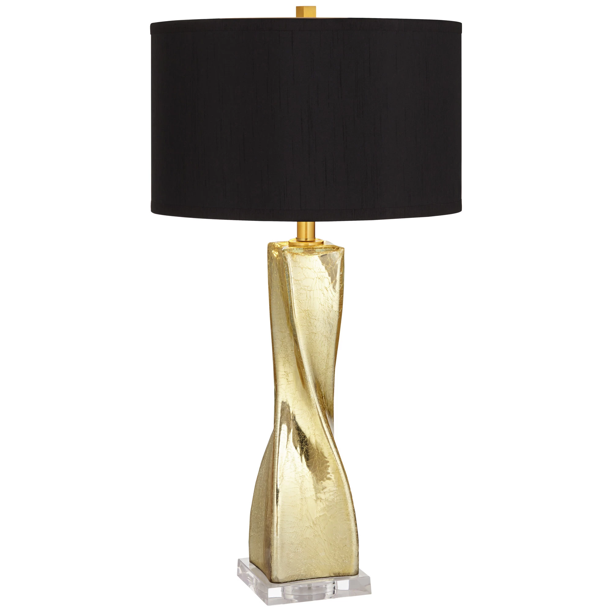 The Orin Table Lamp features a twisted glass base in a crackled metallic finish on top of an acrylic foot. Its glamorous look is completed by a faux silk drum shade and matching metal finial. A rotary on/off switch is installed on the socket.
