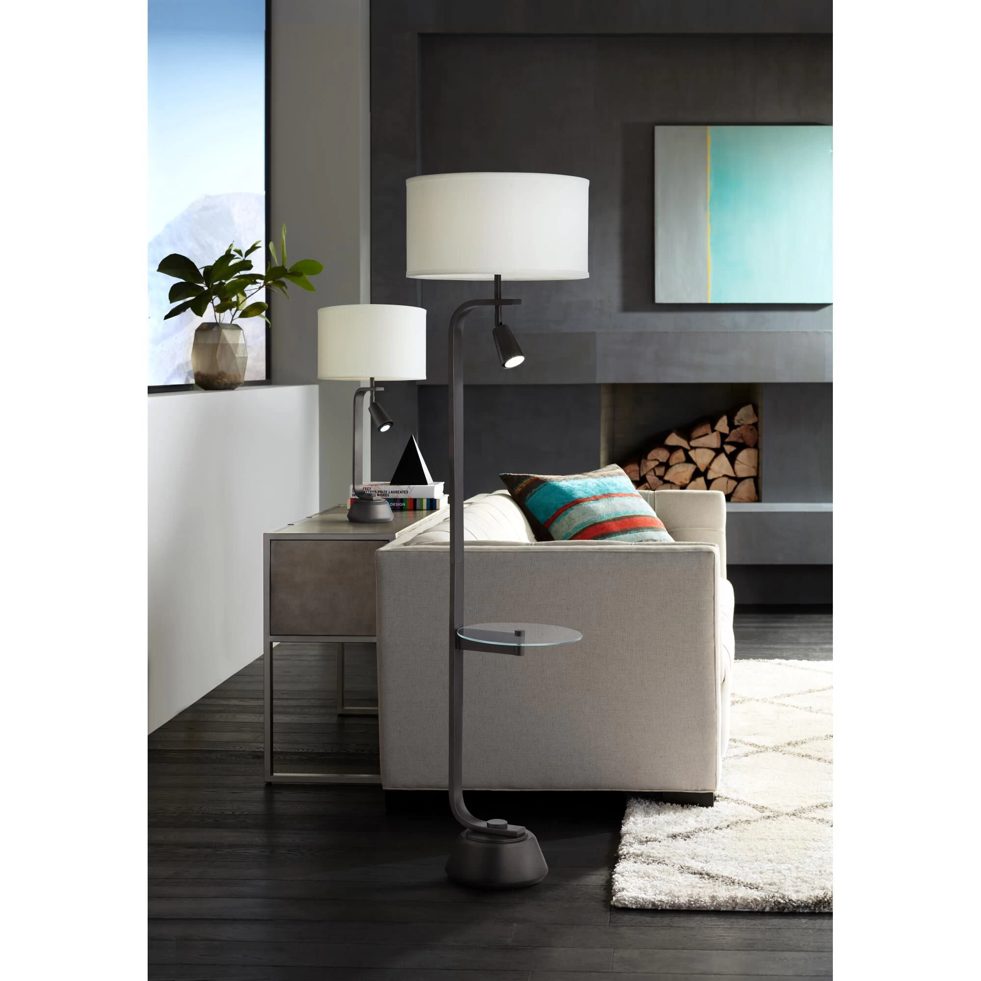 Complete with a dedicated task light and a functional tabletop surface, this floor lamp is perfect for a reading space or study area. This transitional design comes in a dark gun metal finish over a metal body, and is topped by a linen drum shade.