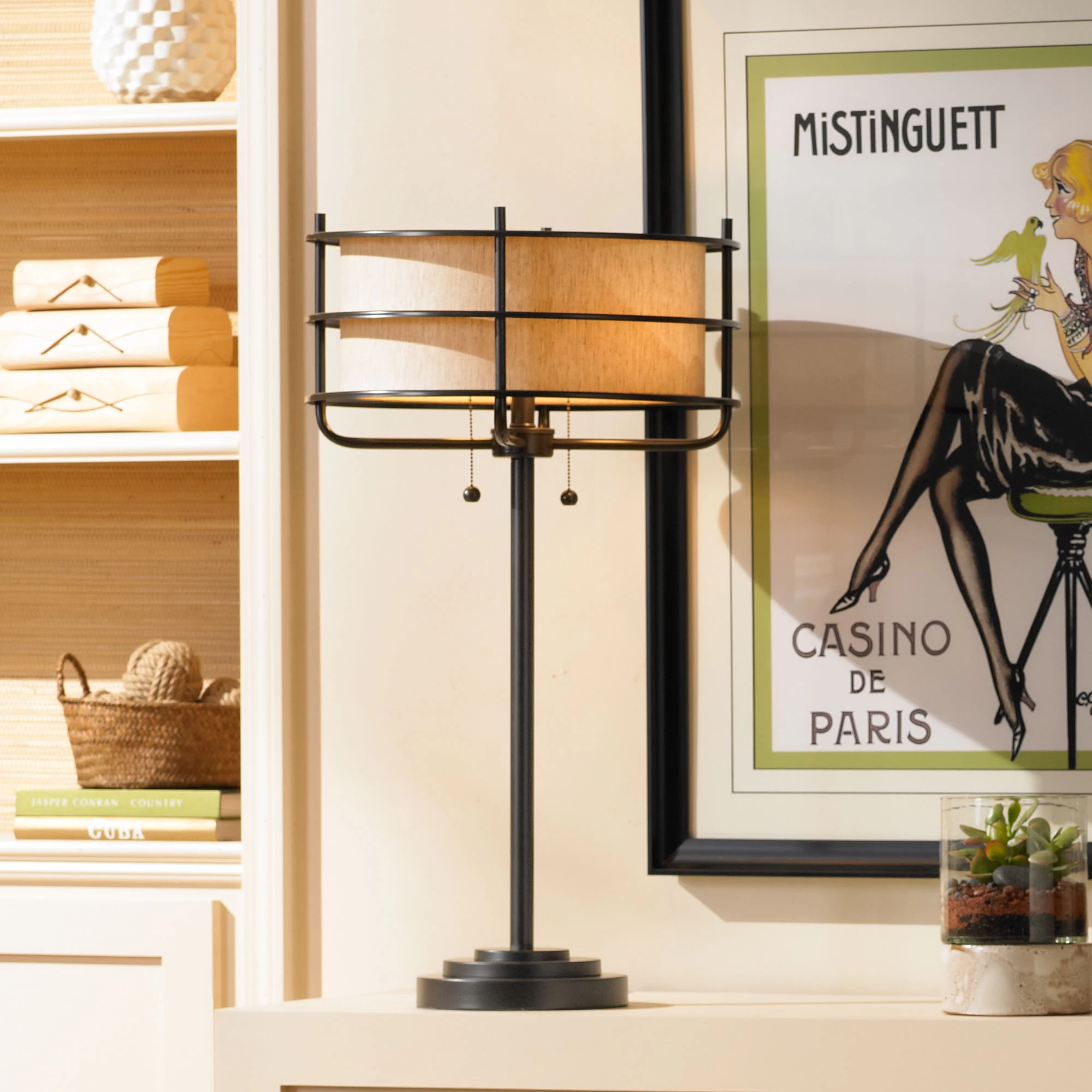 Add an industrial edge to your space with the Ovation Table Lamp. The Bronze finish emphasizes the frame’s bold lines for a striking look, which is further highlighted by a contrasting beige linen shade. On/off pull-chains on the socket allow each bulb to be operated independently.