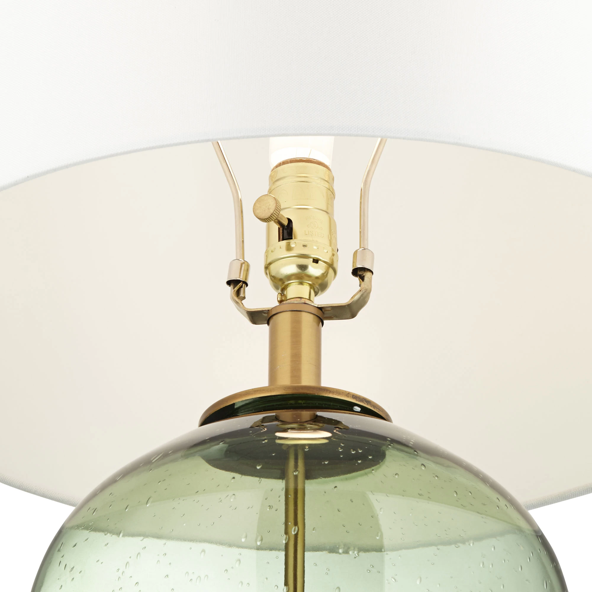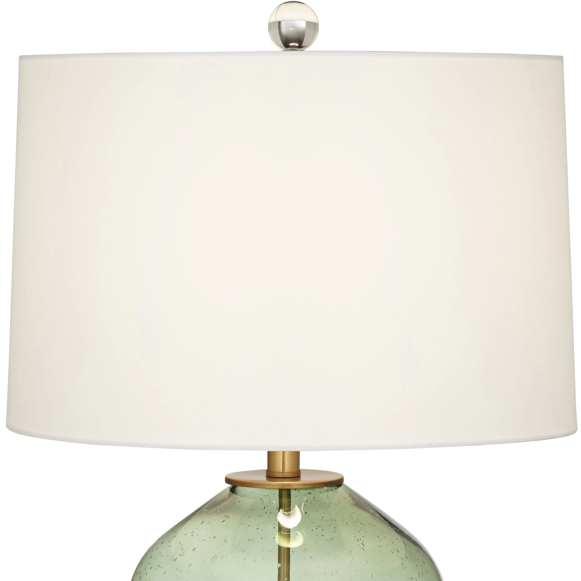 The Pavo Table Lamp features a clean lined design and cool color palette, making it an ideal match for a variety of interior styles. A seeded glass base available in two colors is topped with a white linen drum shade and clear glass ball finial. On/off switch on socket.