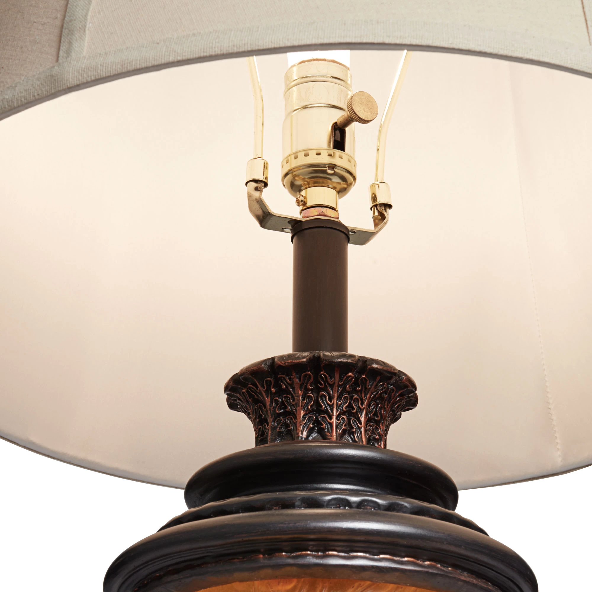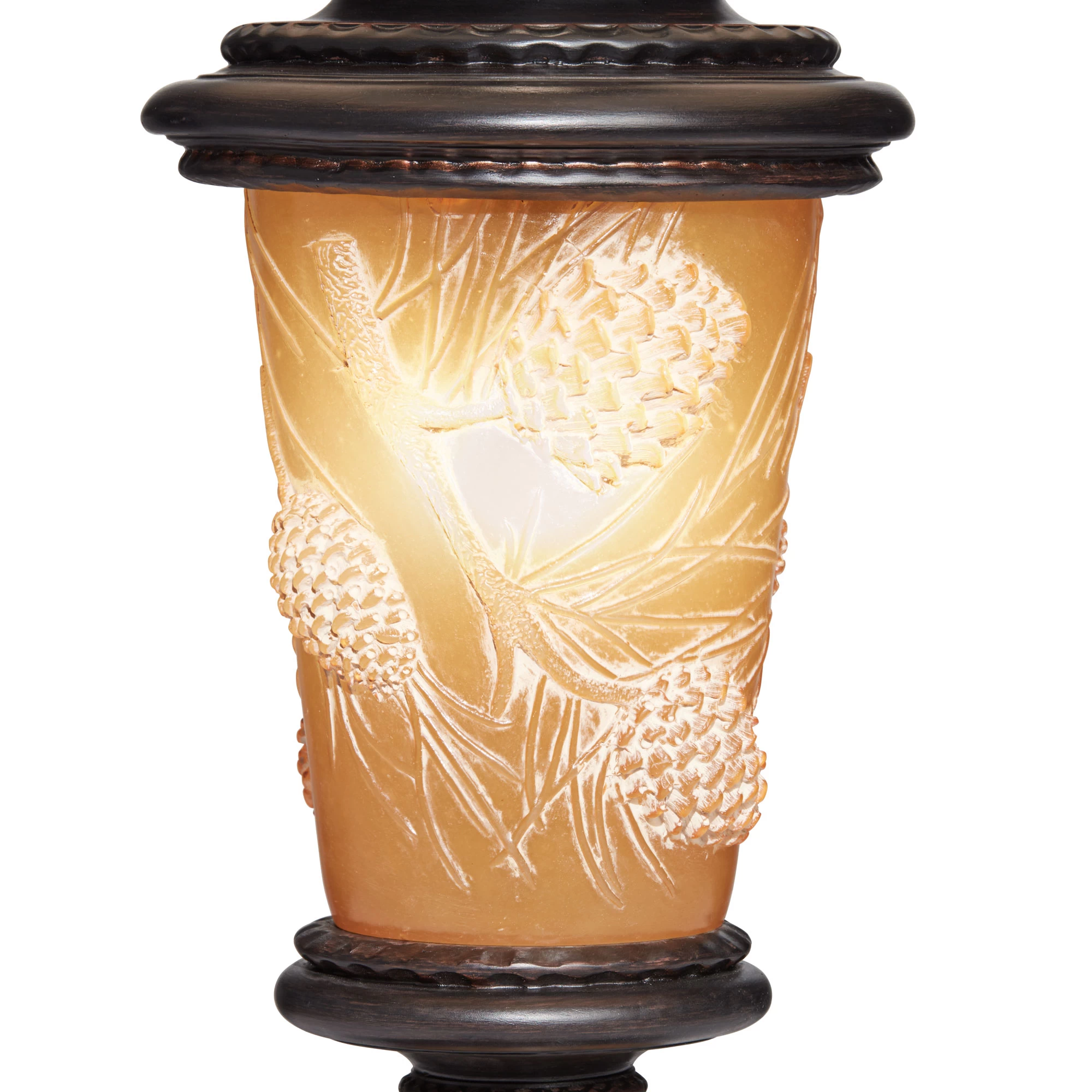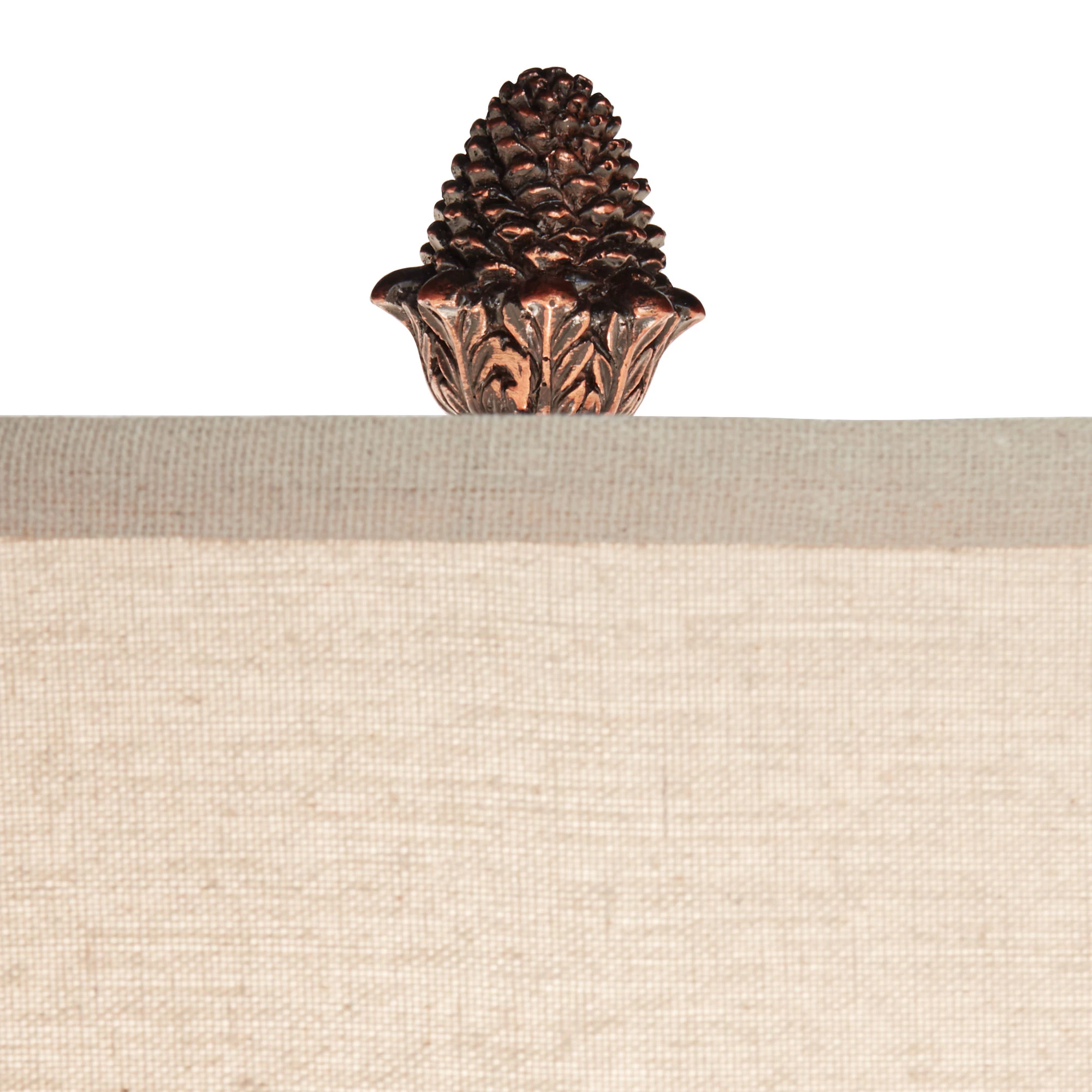 The Pine Cone Glow Table Lamp is a charming choice for a rustic den or living room. An ornately decorated body supports a nightlight tucked within an amber shade with pine cone accents. A beige linen bell shade tops the piece to create traditional ambiance. On/off switch located on socket.