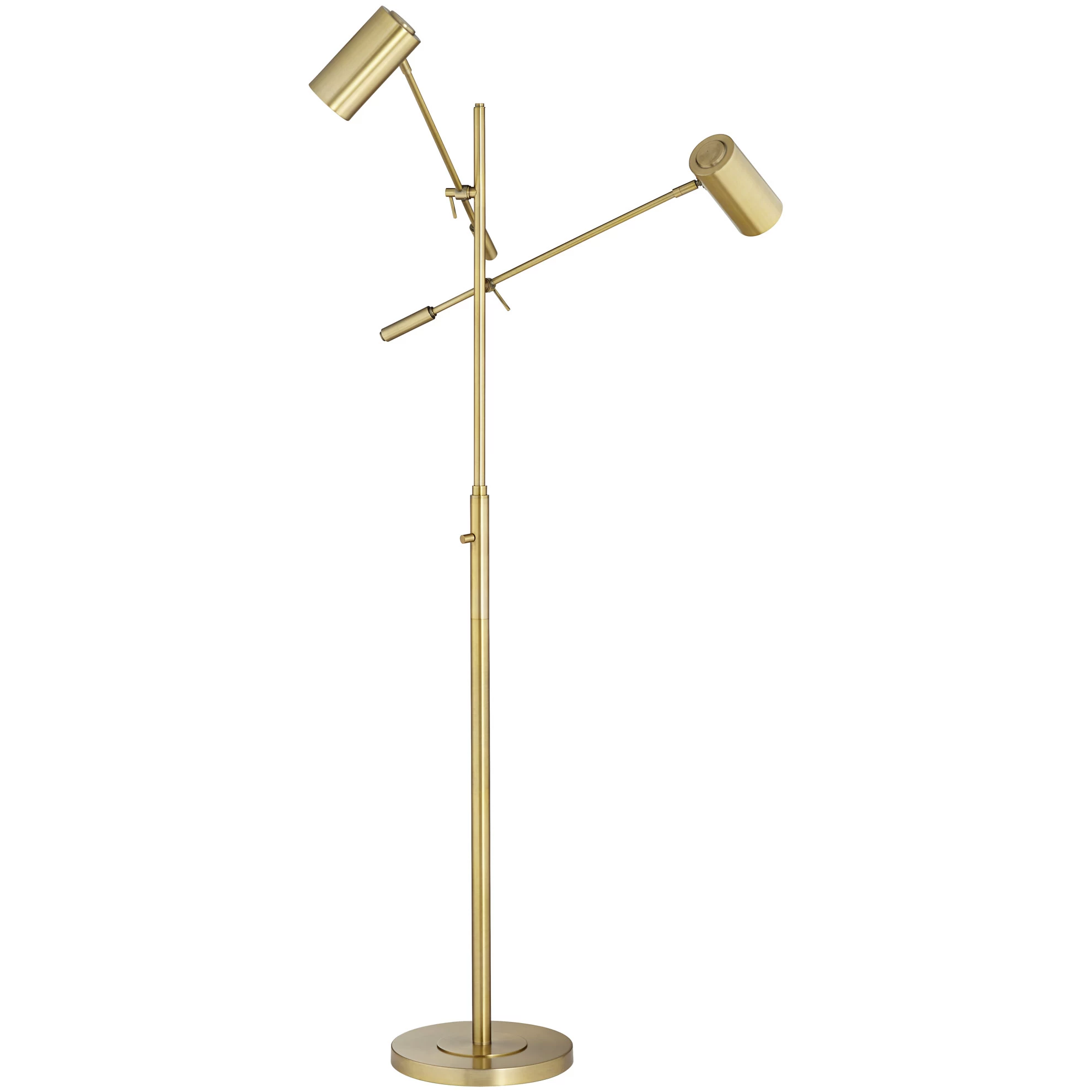 The Porto Floor Lamp features a two light swing arm frame in a warm Antique Brass finish. Adjustable arms allow the lamps to be aimed wherever light is needed, and a dimmer switch installed on the pole controls the brightness. A slim body makes this lamp a great fit in an office or living area where additional light is needed.