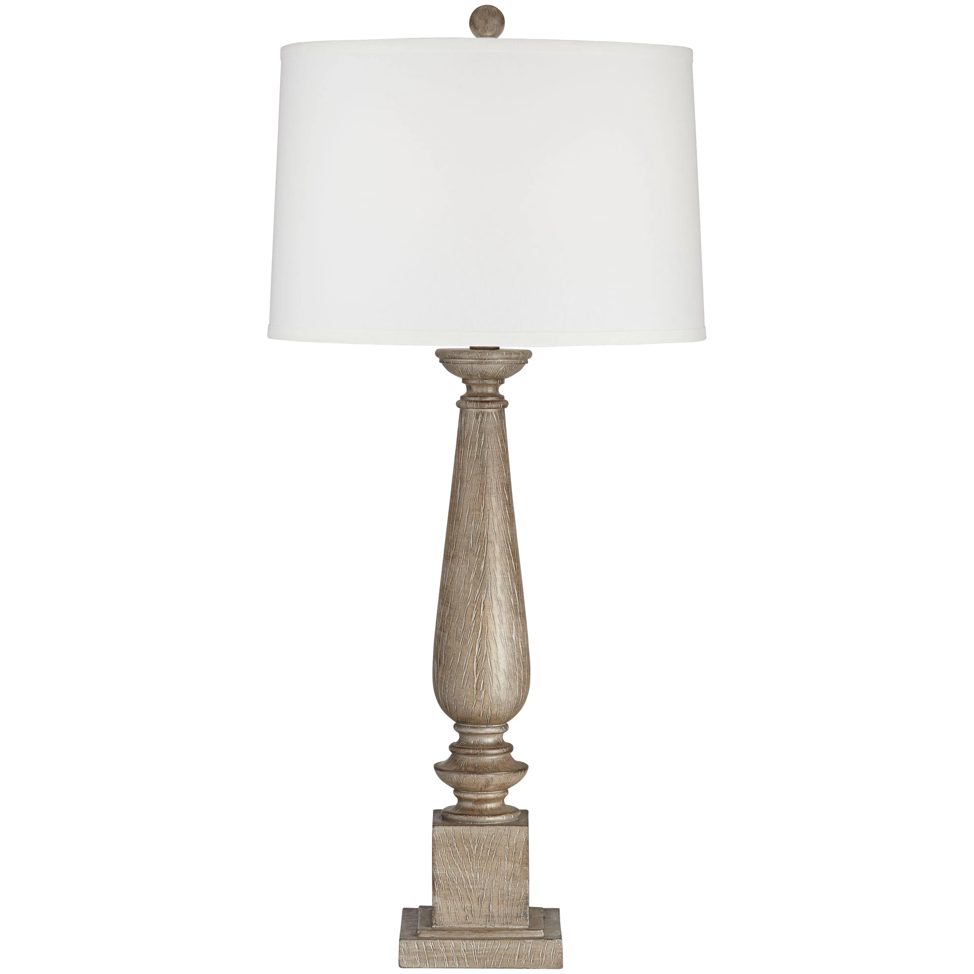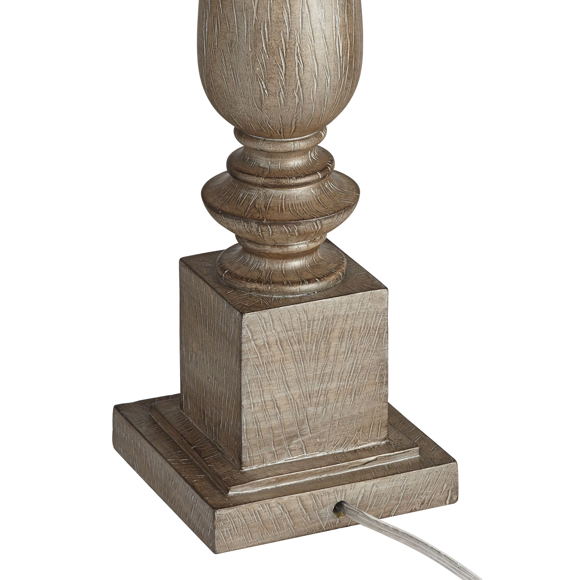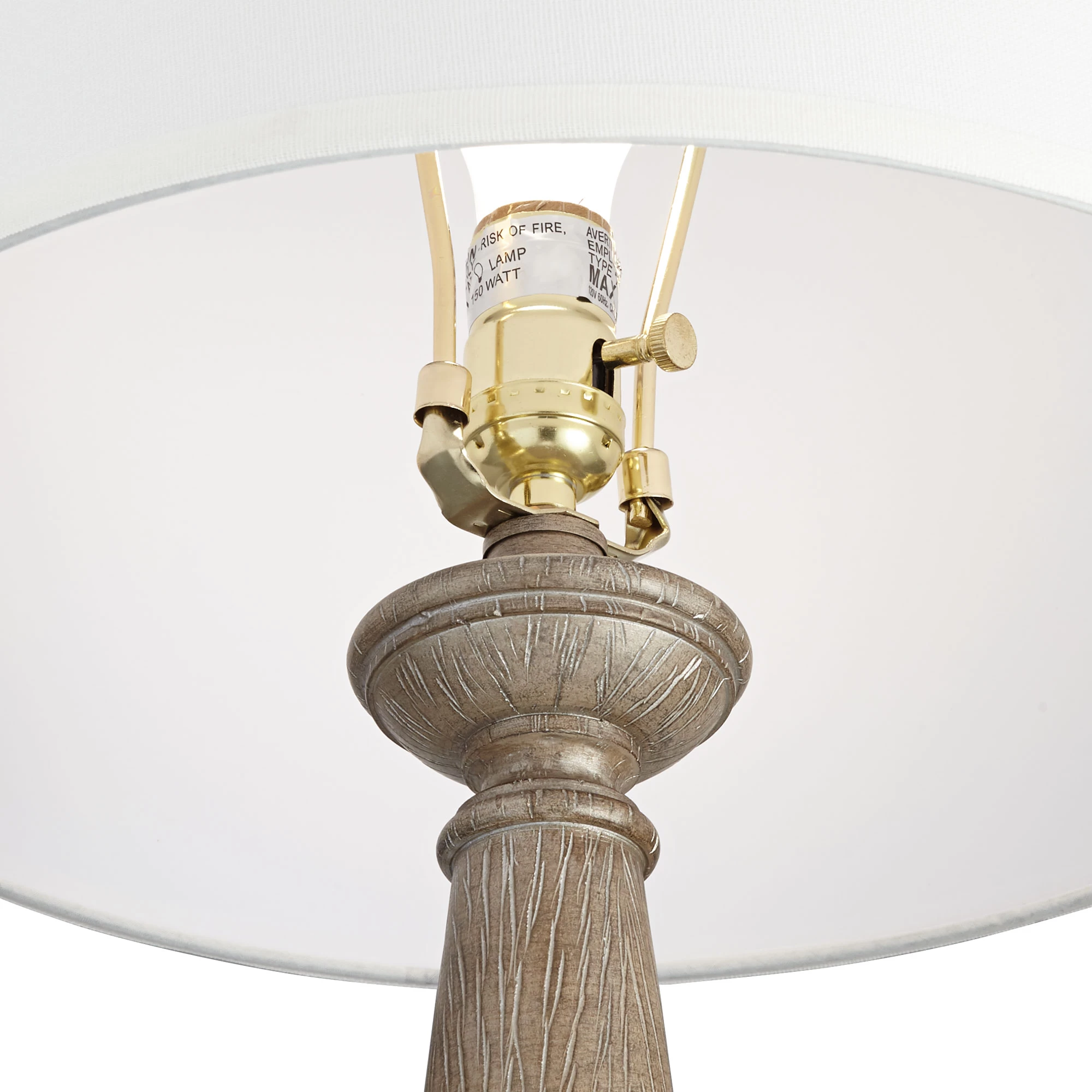 A tasteful turned base makes the Preston Table Lamp an elegant addition to a traditional space. The warm taupe faux wood finish complements the white linen drum shade with a natural accent. On/off switch located on socket.
