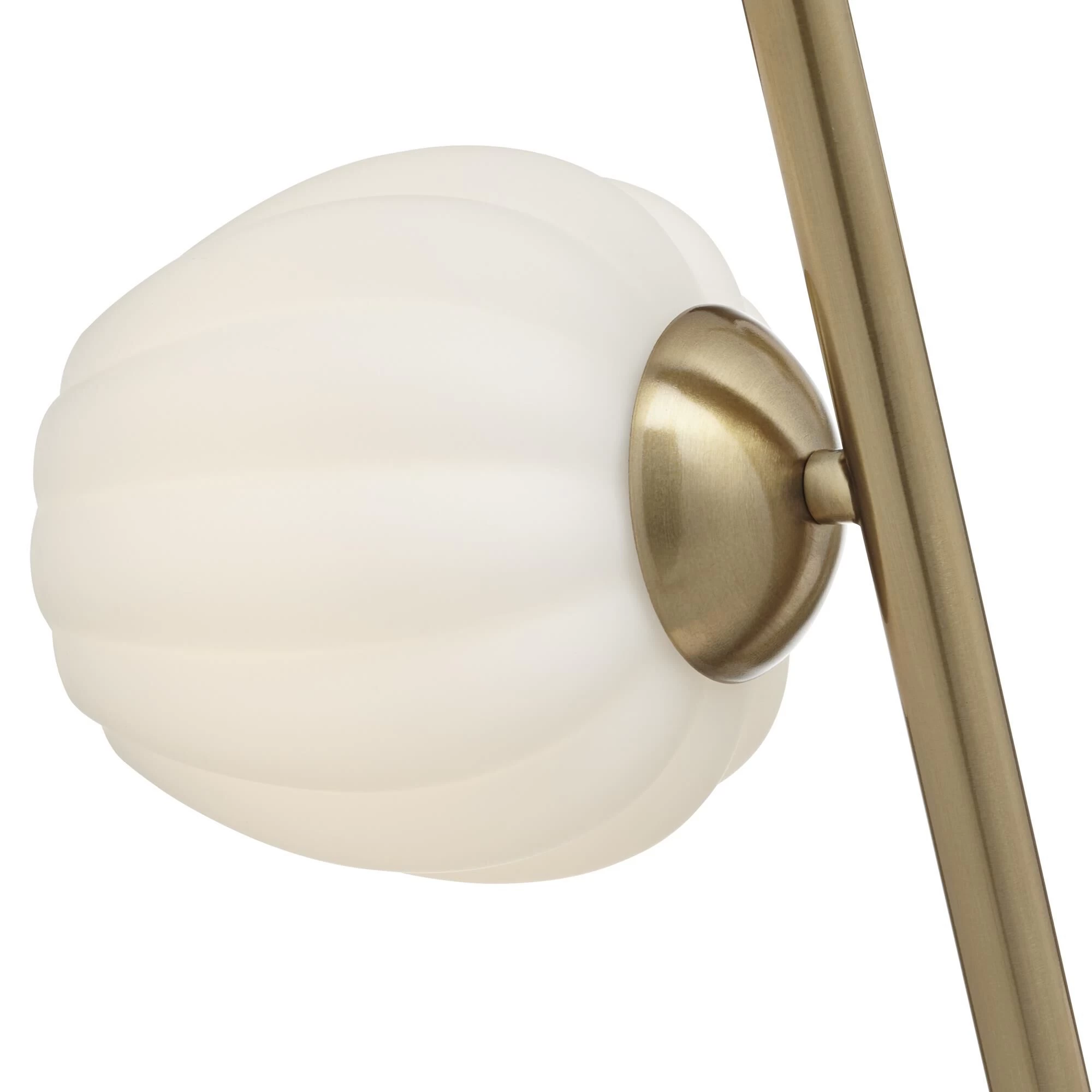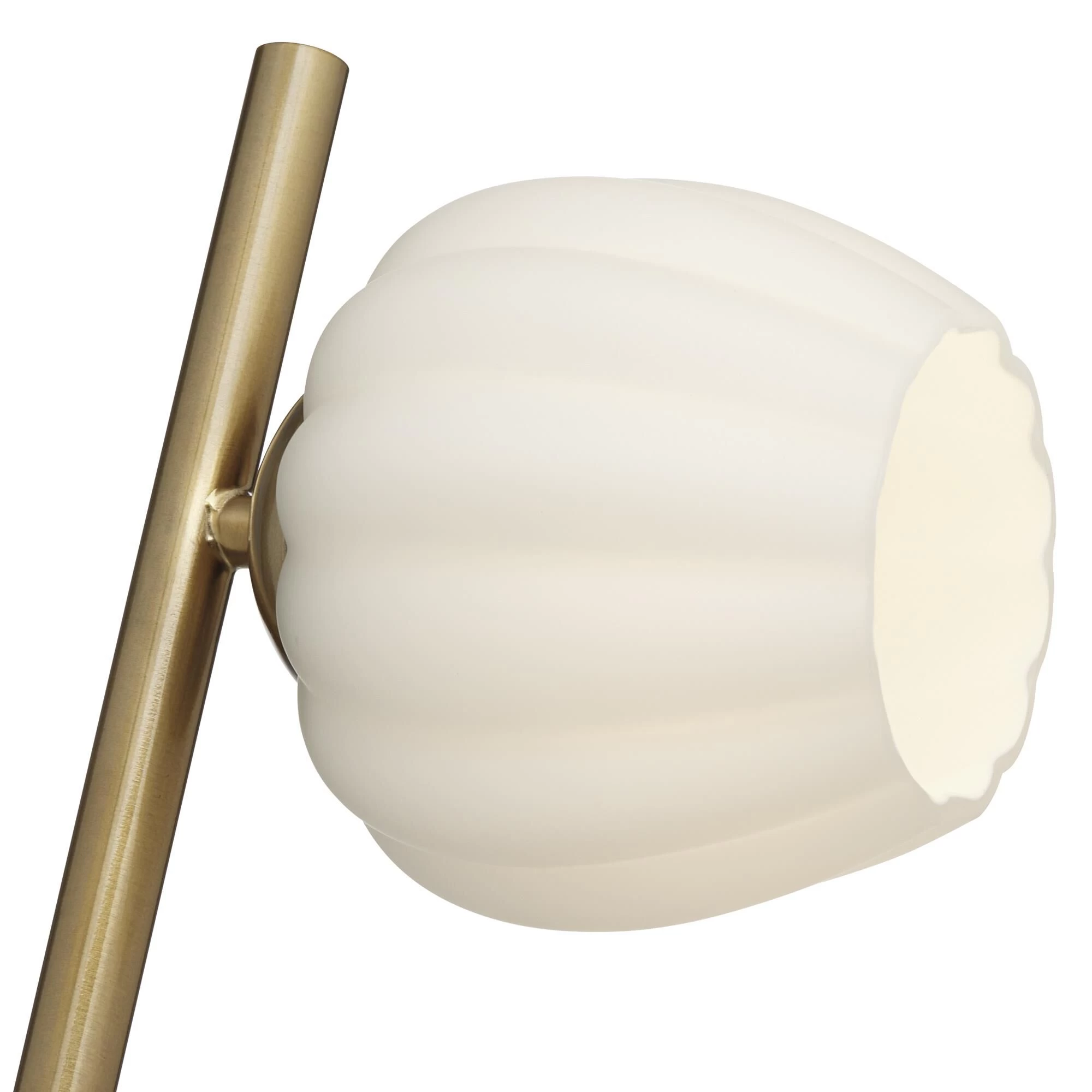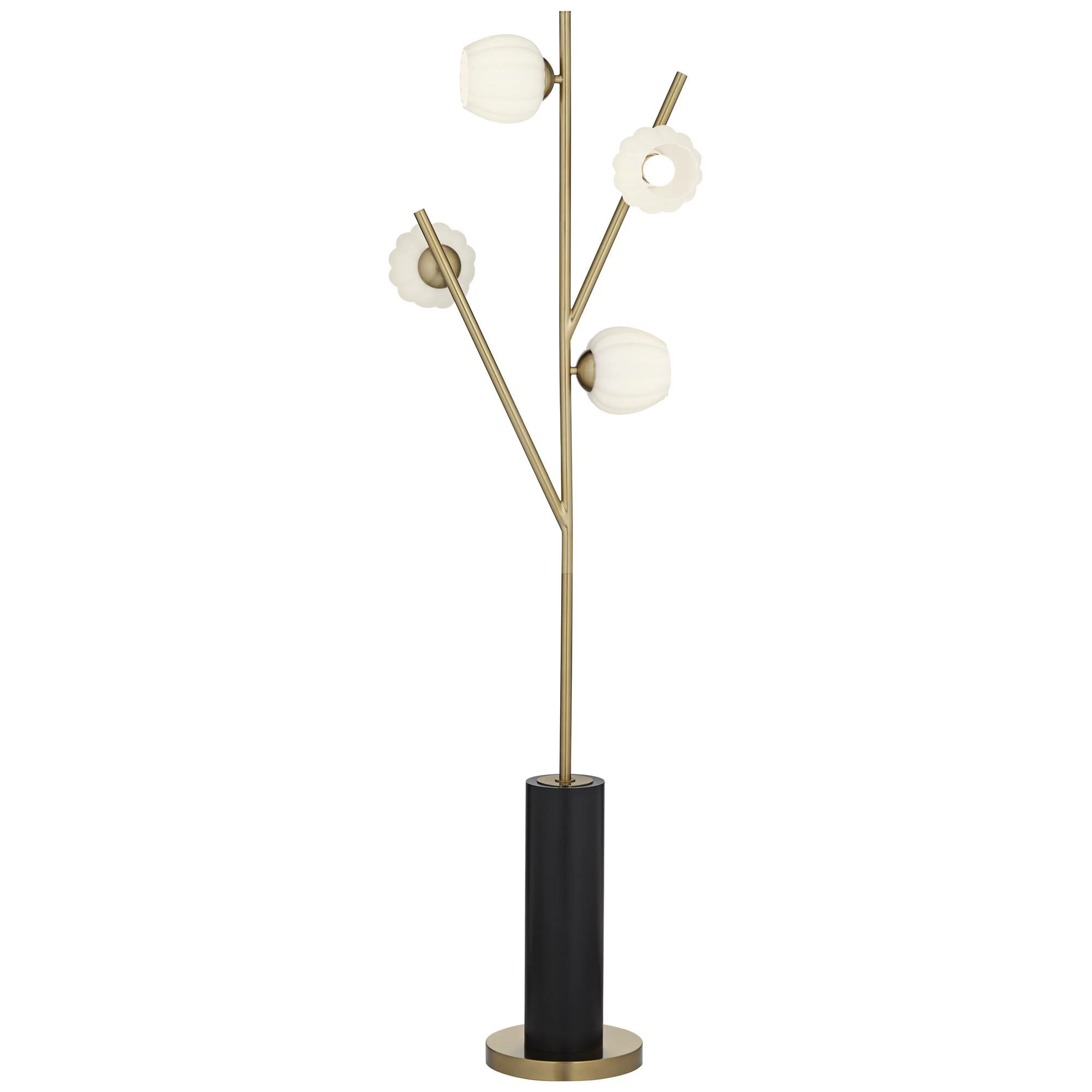 Vintage influences blossom across the warm gold branches of this lively four-light floor lamp. Designed with retro-inspired touches elegantly presented in the warm gold and scalloped white glass shades, this multi-directional floor lamp makes a charming addition to sleek modern interiors. A black metal base grounds this captivating floor lamp whimsical upper half.