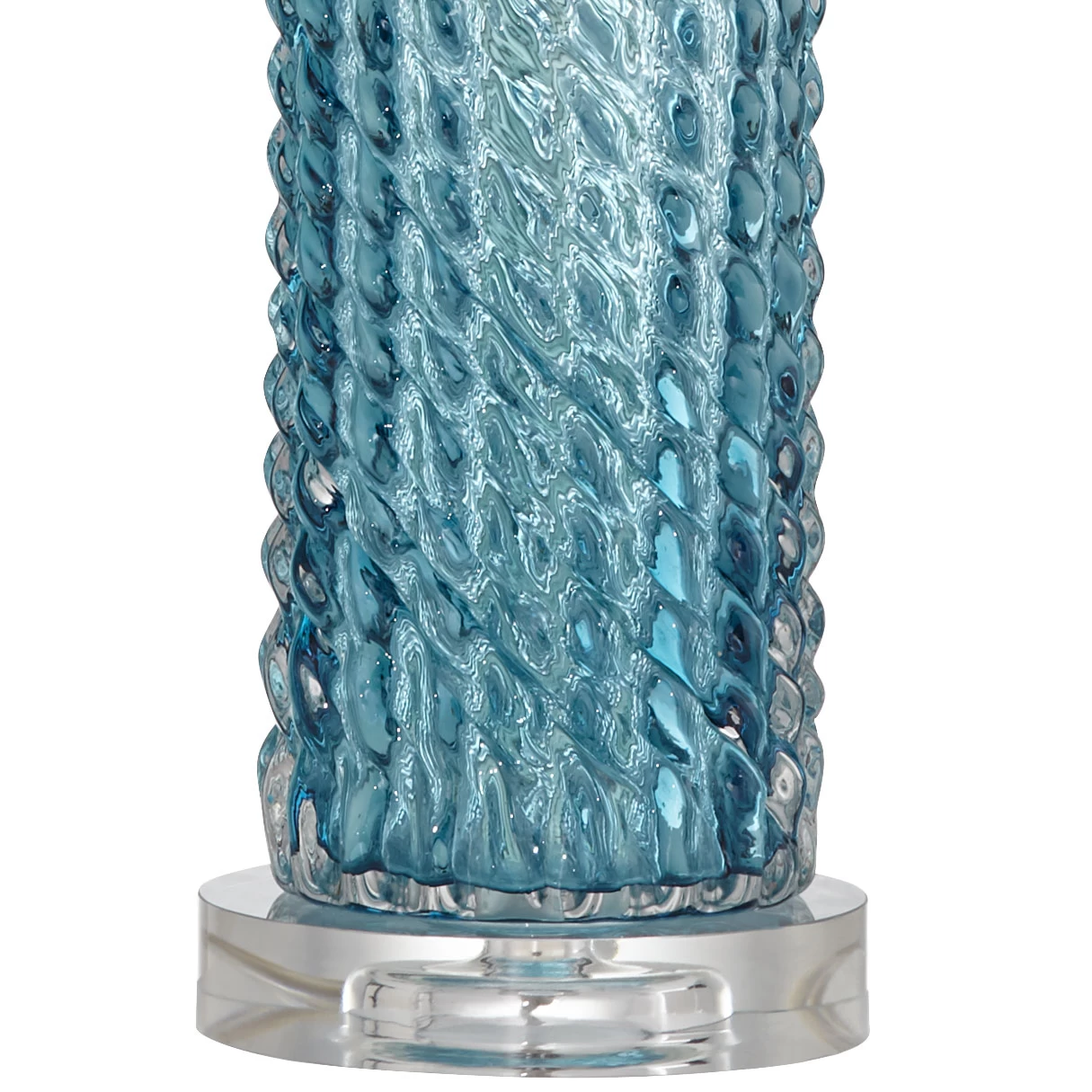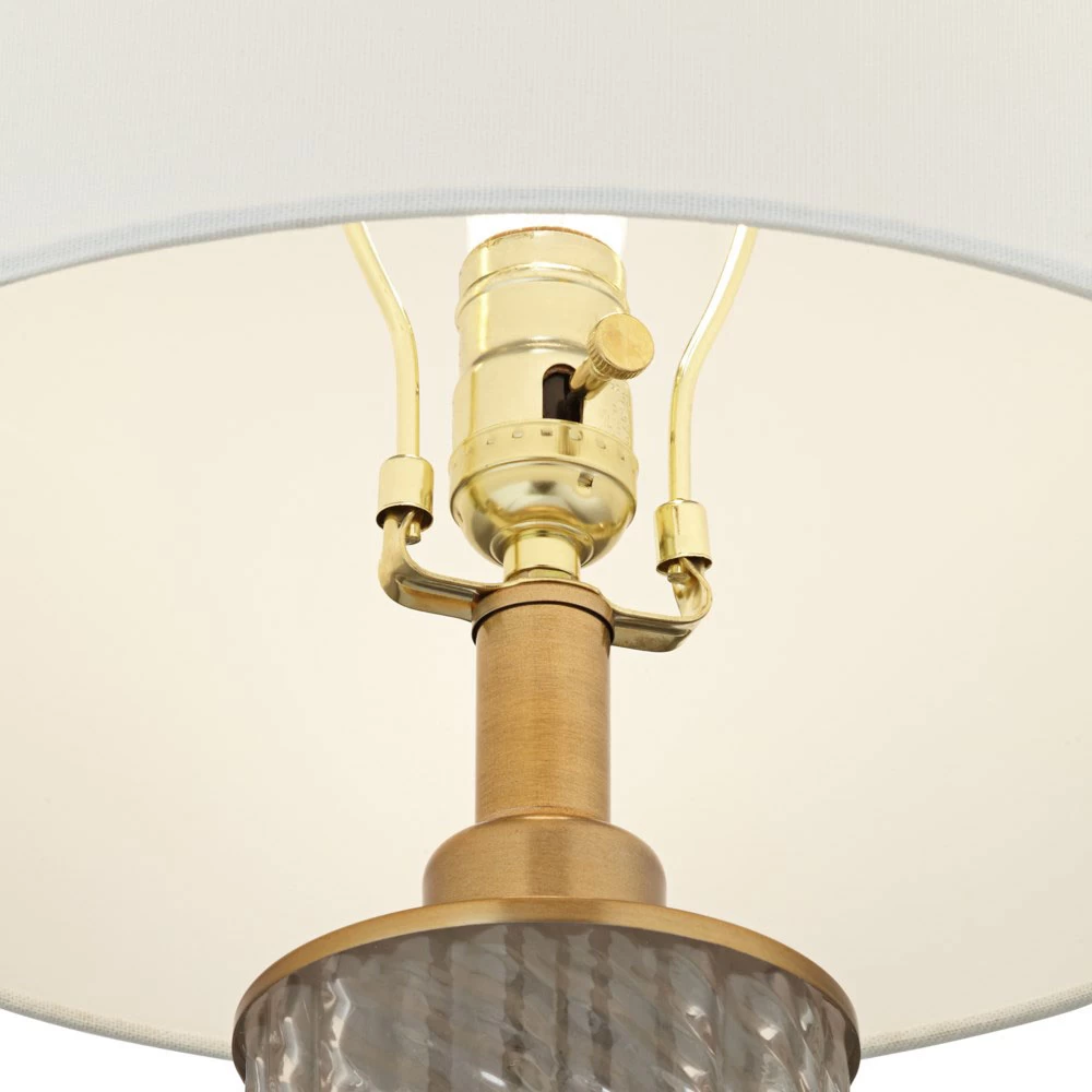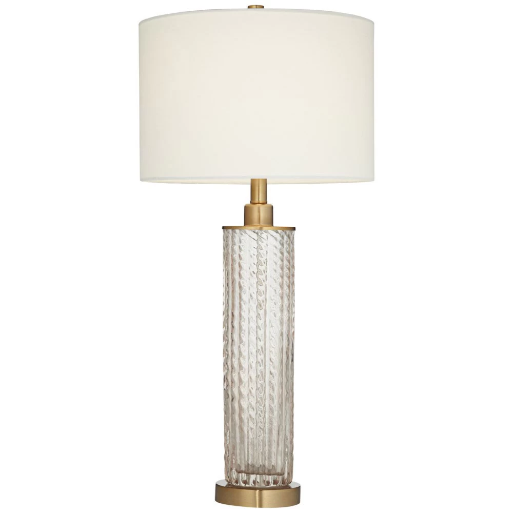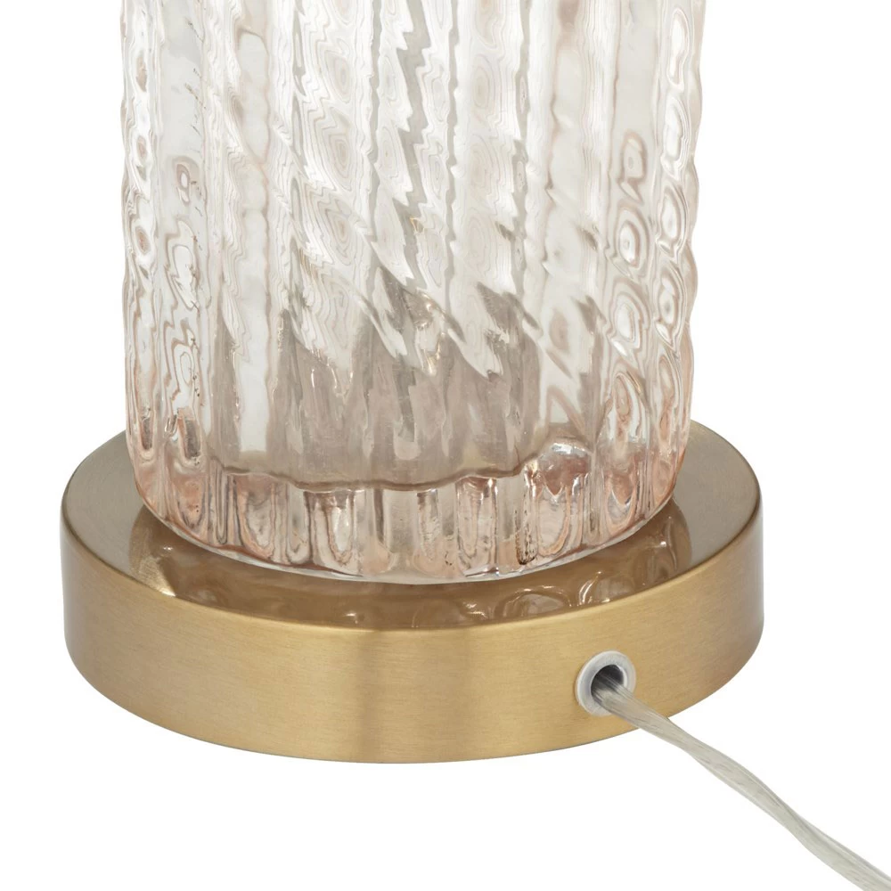 The Renzo Table Lamp Set includes a pair of lamps with cylindrical textured glass bases. A pink blush tint and Gold finished accents bring warmth and elegance, and a white linen drum shade completes the look. On/off switch on socket.