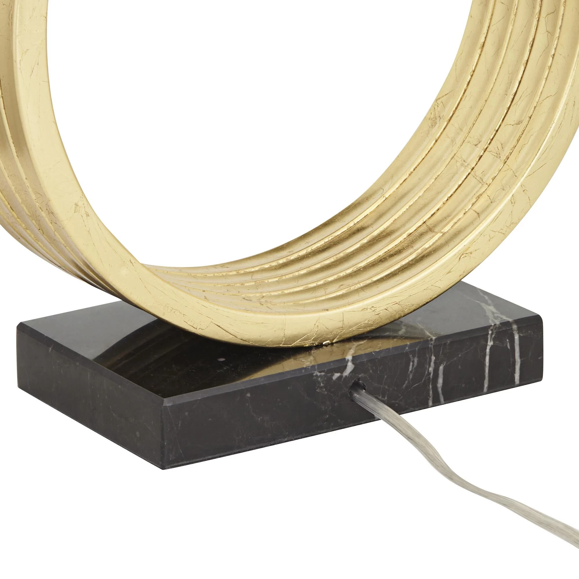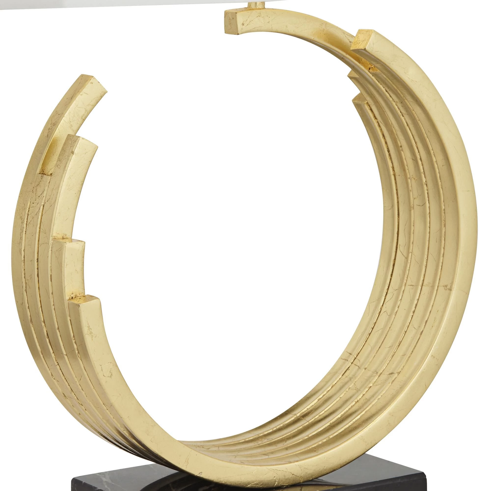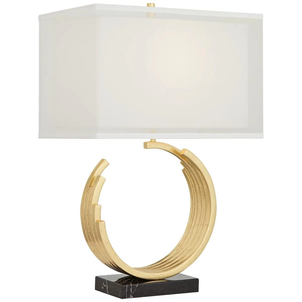 The exquisite look of this table lamp is truly eye-catching. The open circle design with a gold leaf finish is both elegant and modern. The rectangular shade completes the look.
