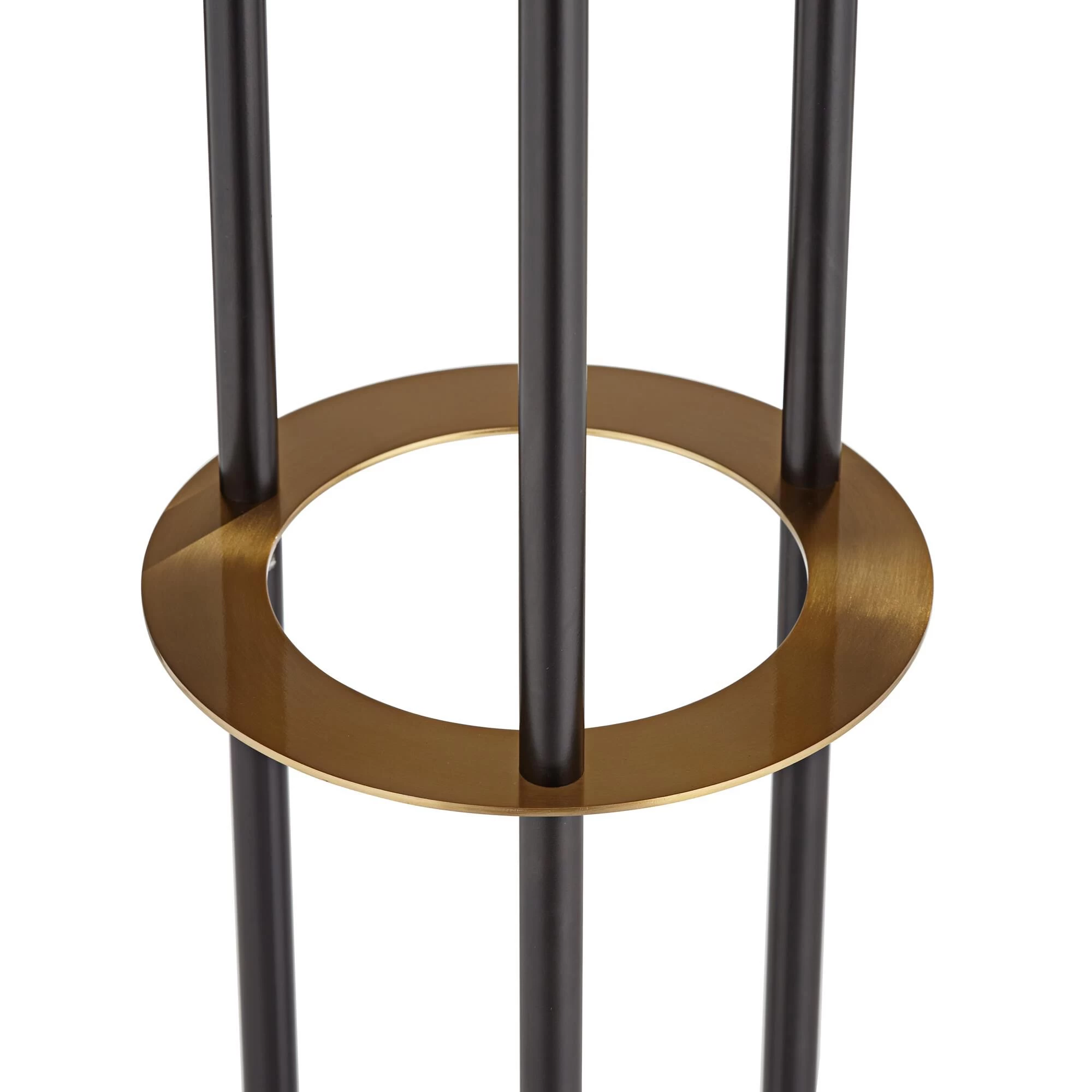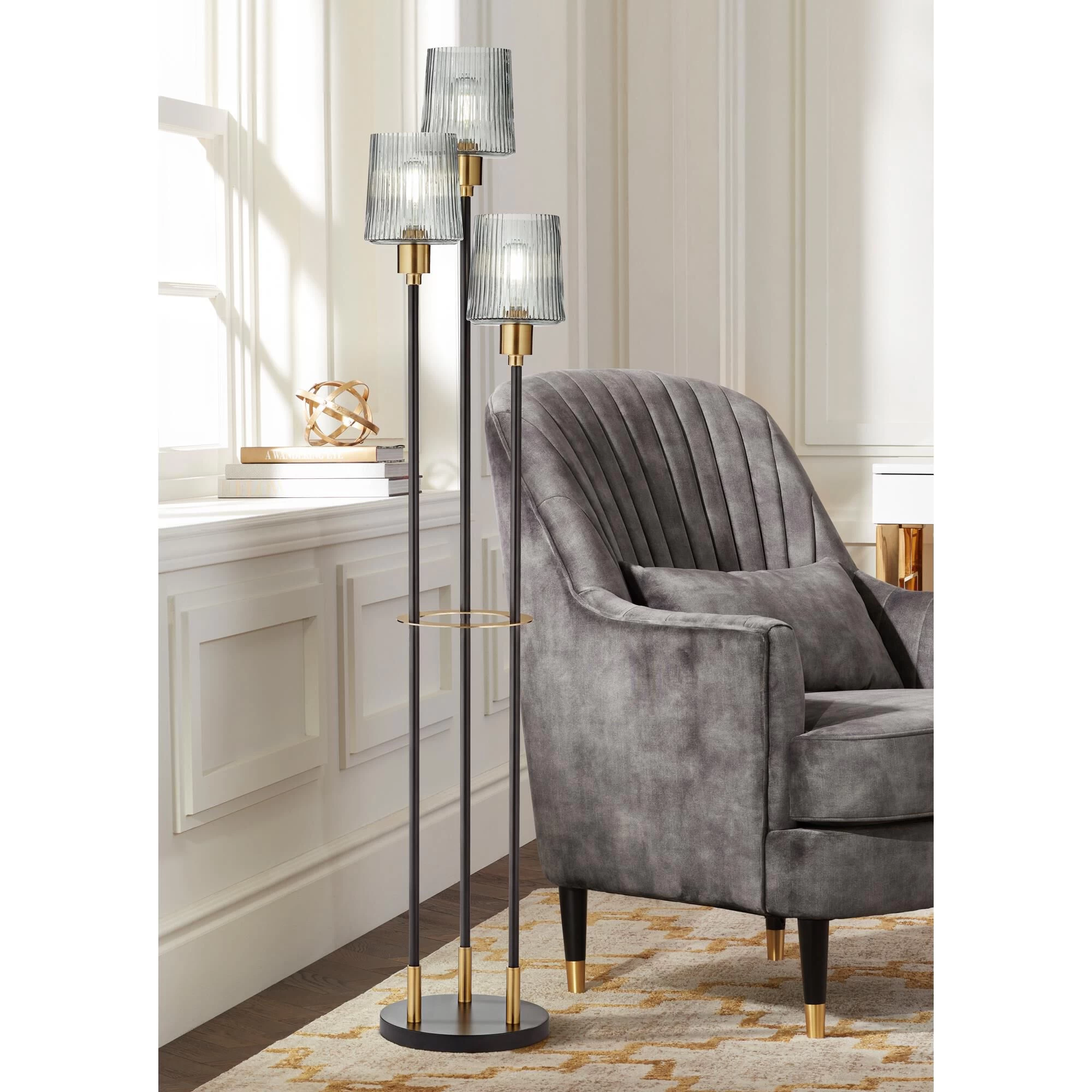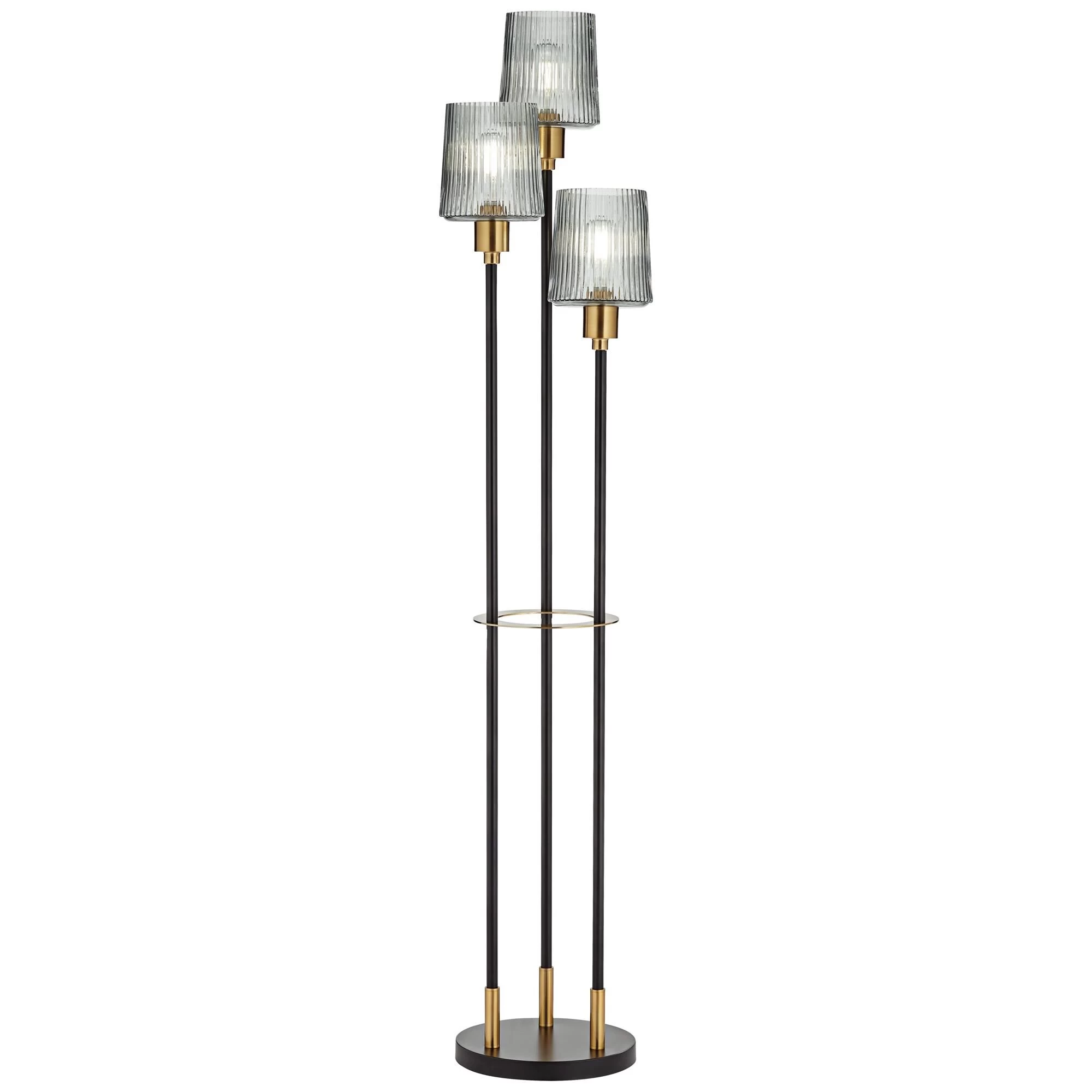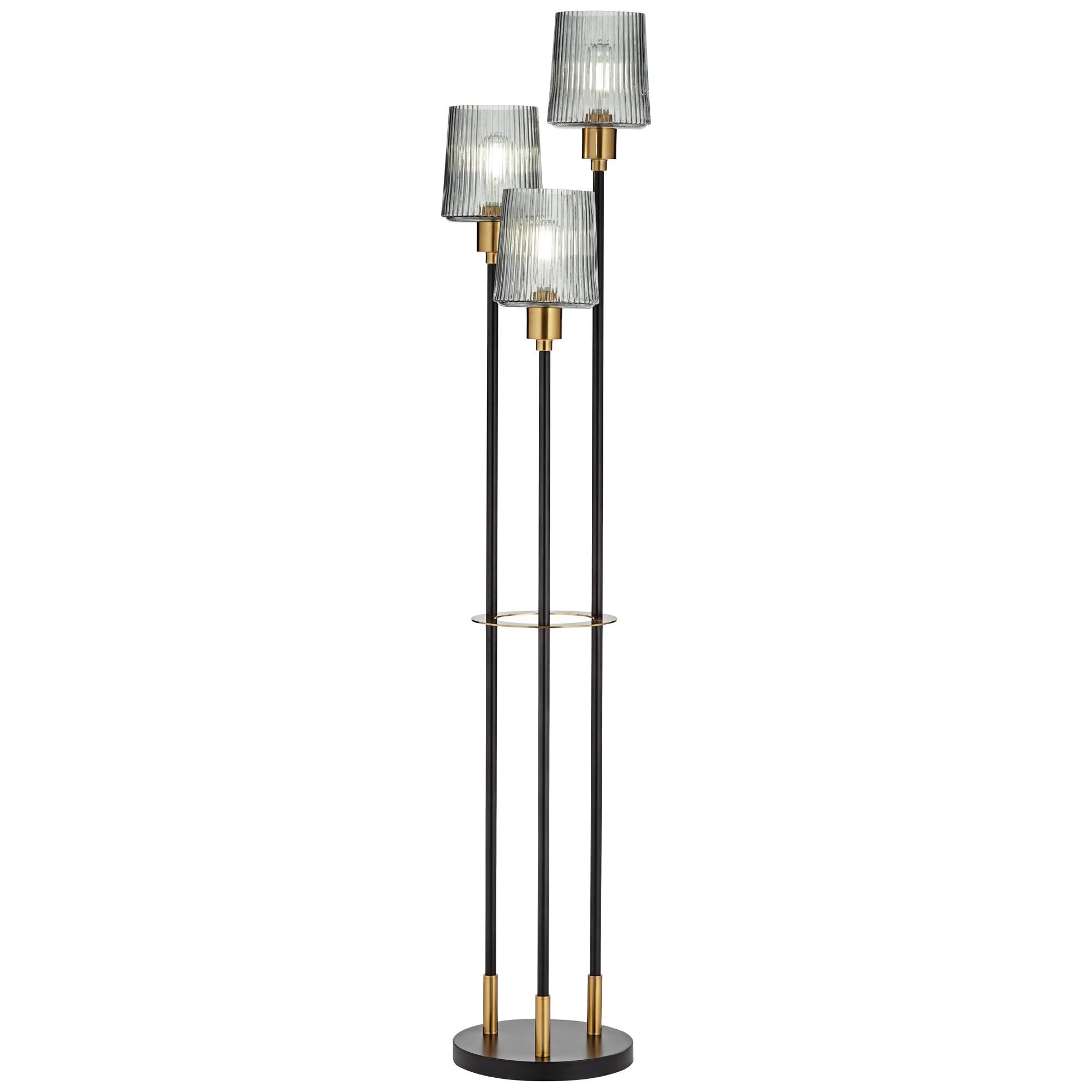 Superb in any living space, this contemporary three-light floor lamp is a spectacular addition. Rich in sophistication, it boasts a trio of slender posts of differing heights, each capped with a shaded light that casts a lovely glow. Its two-tone finish adds richness while maintaining a neutral palette to complement a wide range of spaces.