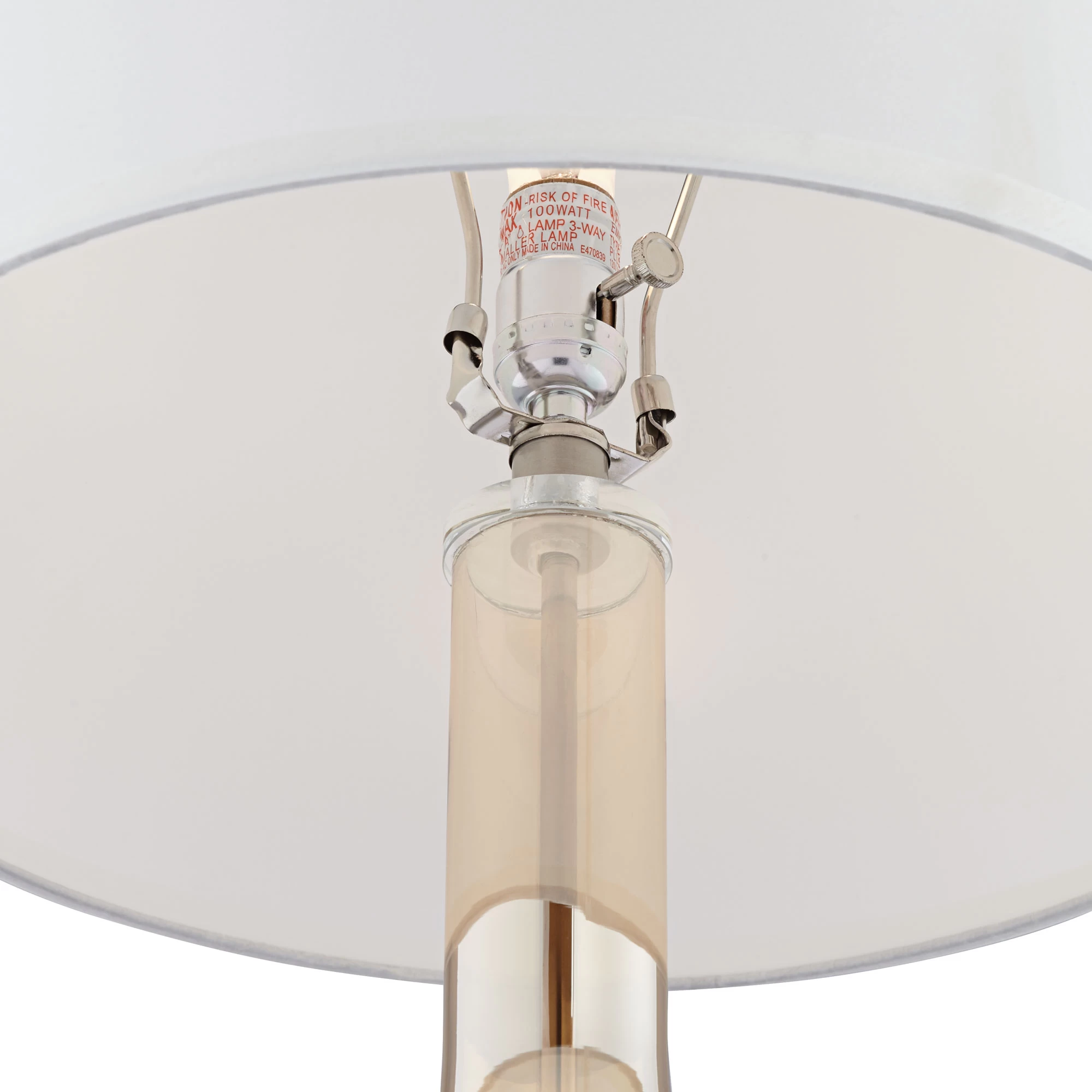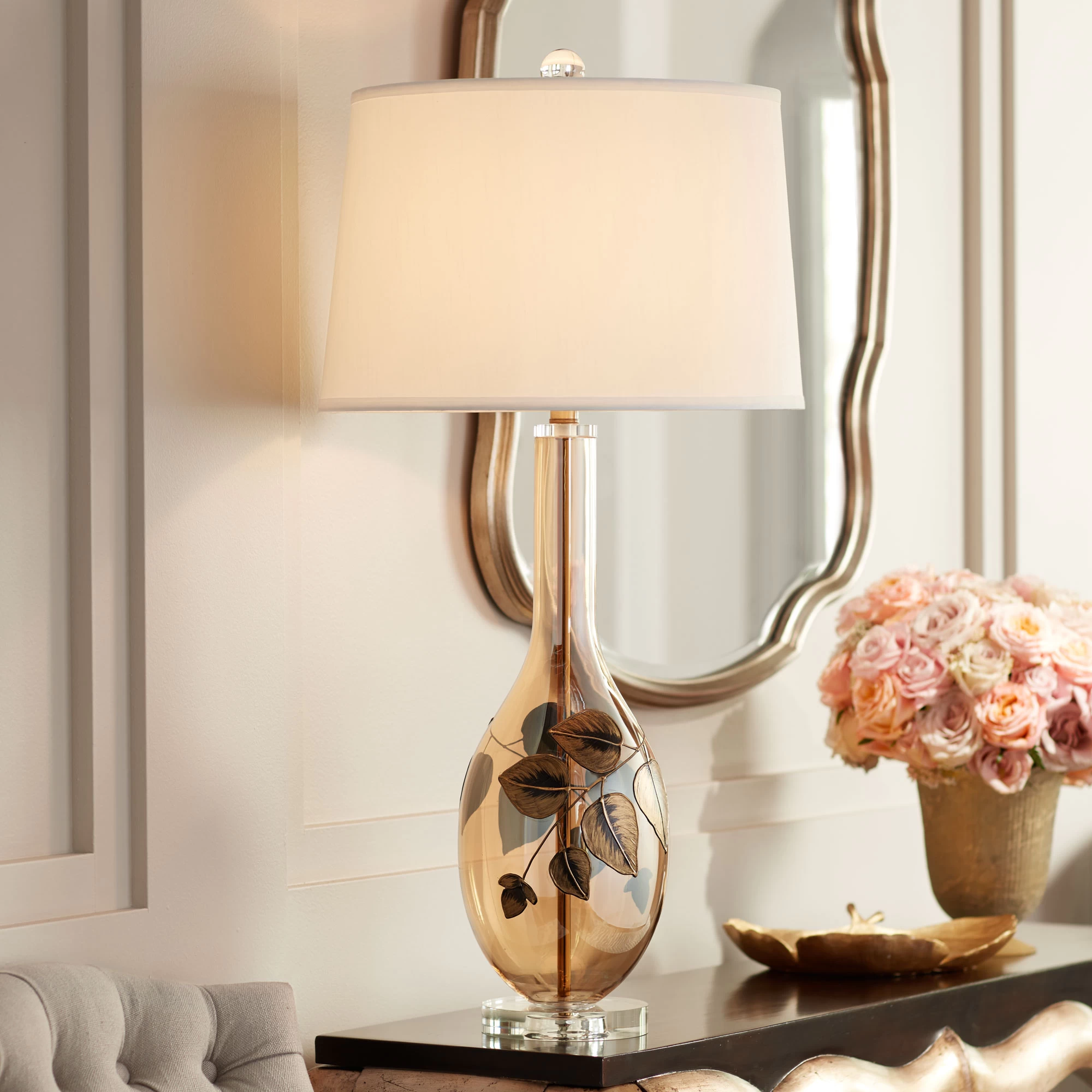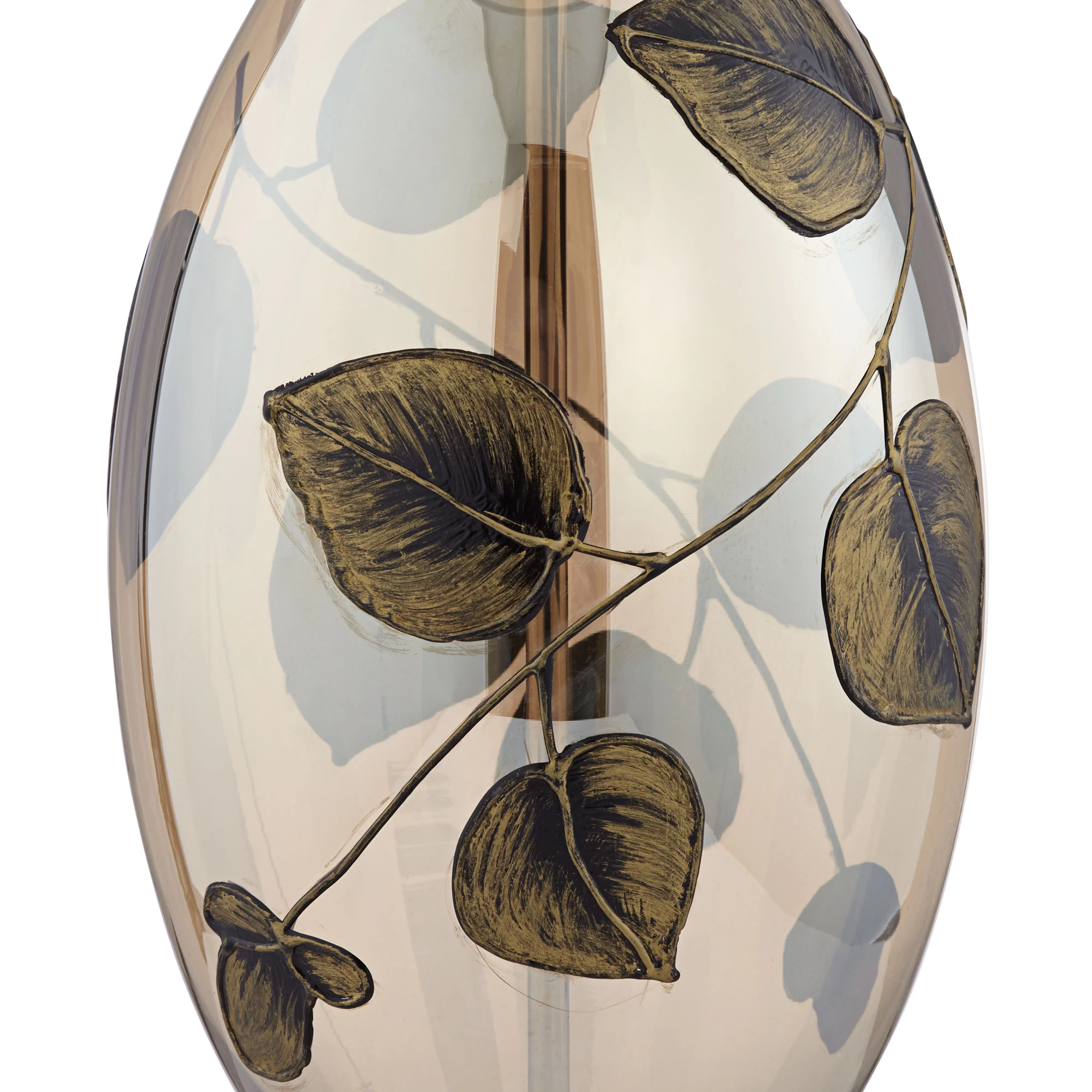 The Rosie Table Lamp brings the beauty of nature indoors with an elegant leaf pattern over its tinted glass base. A crystal foot and faux silk shade add a sophisticated touch to a piece that is sure to stand out. On/off switch located on socket.