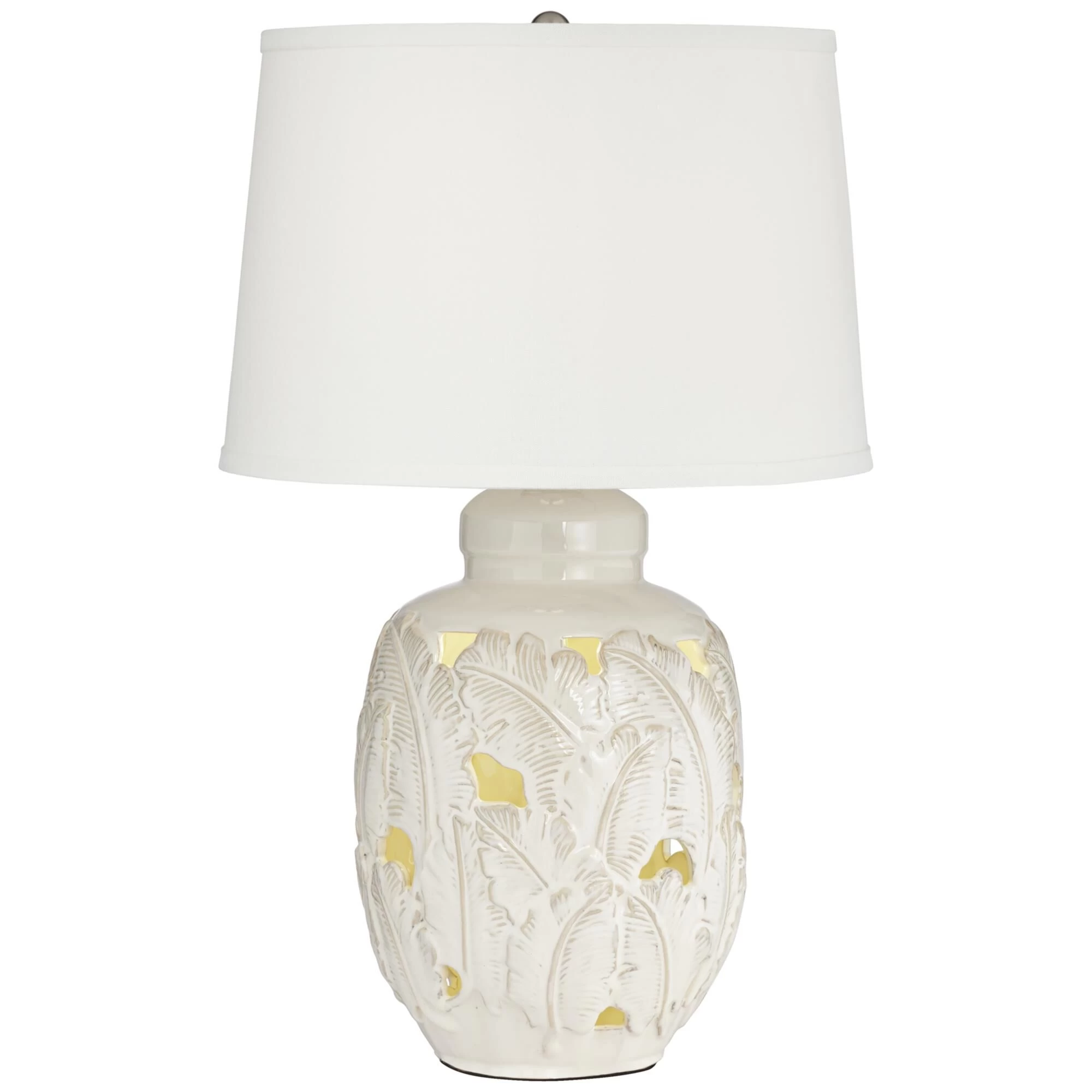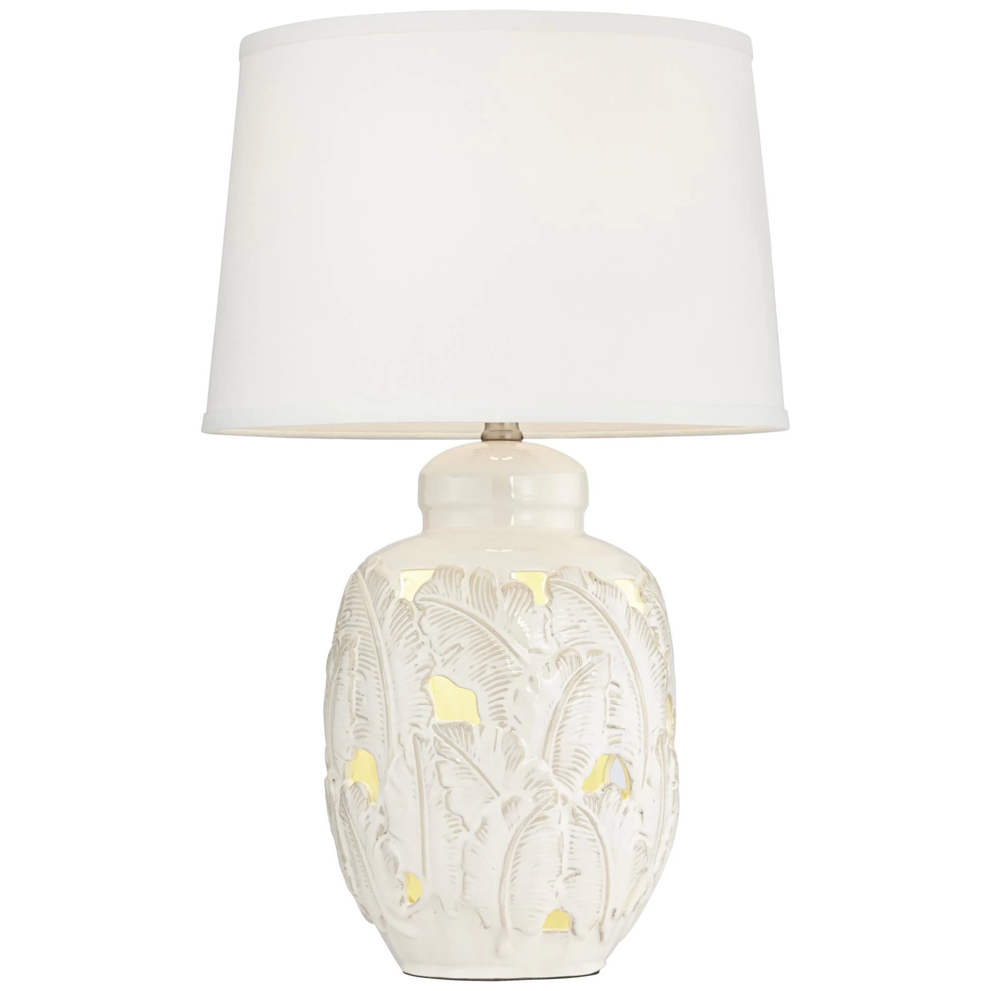 Cutout details punctuate the base of this ceramic table lamp to cast a warm glow. Crafted in ceramic with a beige finish, the lamp sports a tropical foliage motif that brings a sense of peace and relaxation to any living space. Enjoy the diffused illumination of a tapering drum shade to complete this exceptional design.
