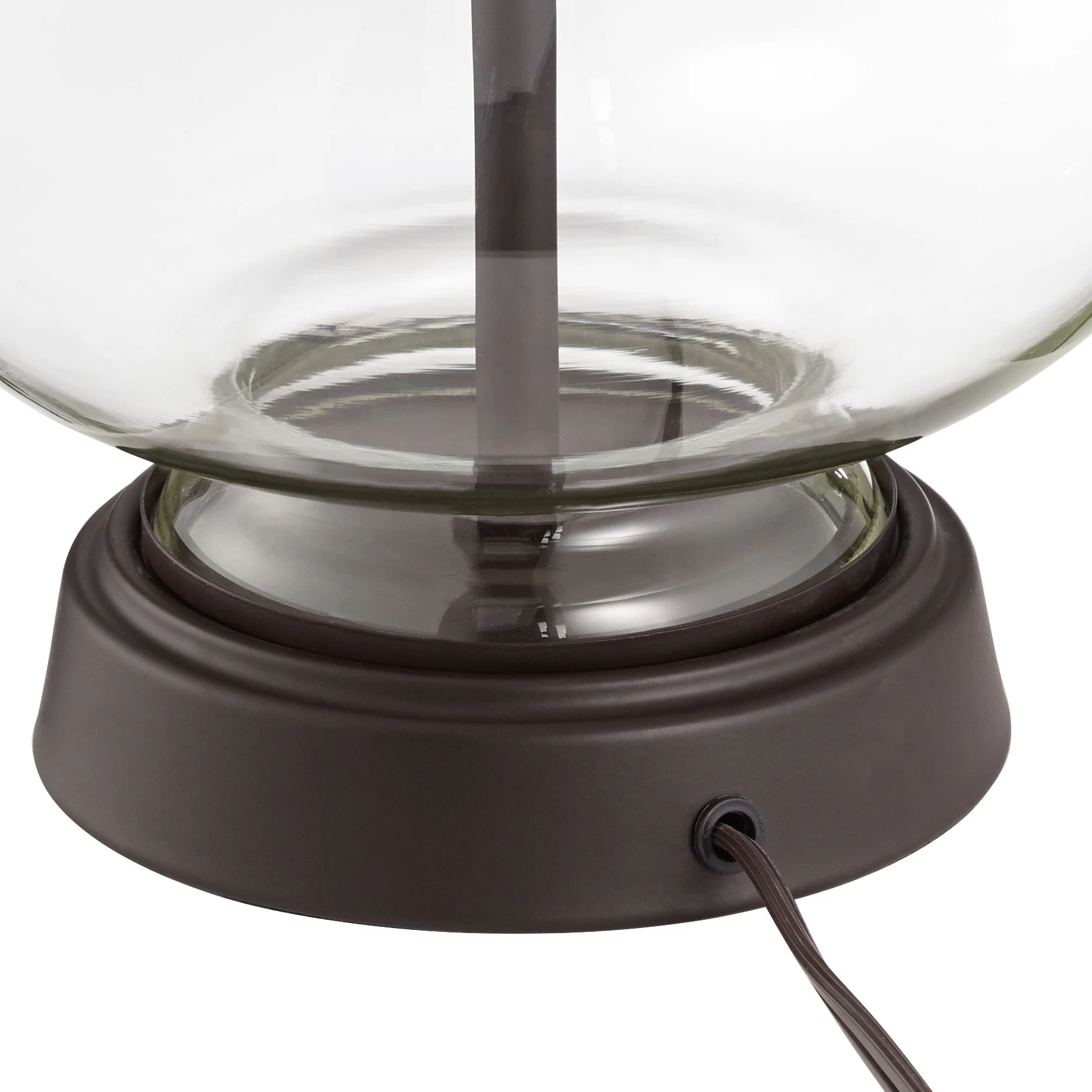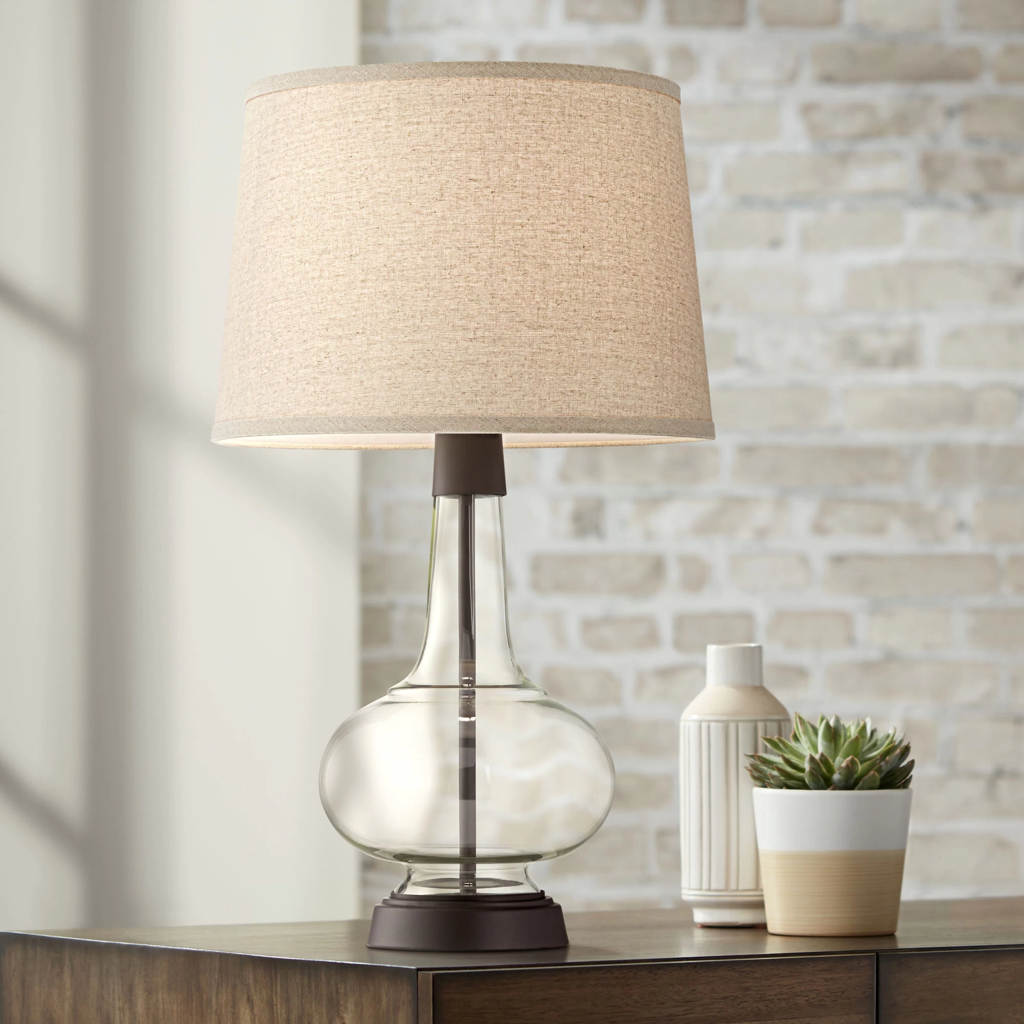 Offering a subtle industrial style, the Silas Table Lamp features a shapely glass silhouette with handsome rubbed bronze finish accents. An earthy burlap shade on top complements this beautiful design. On/off switch located on socket.
