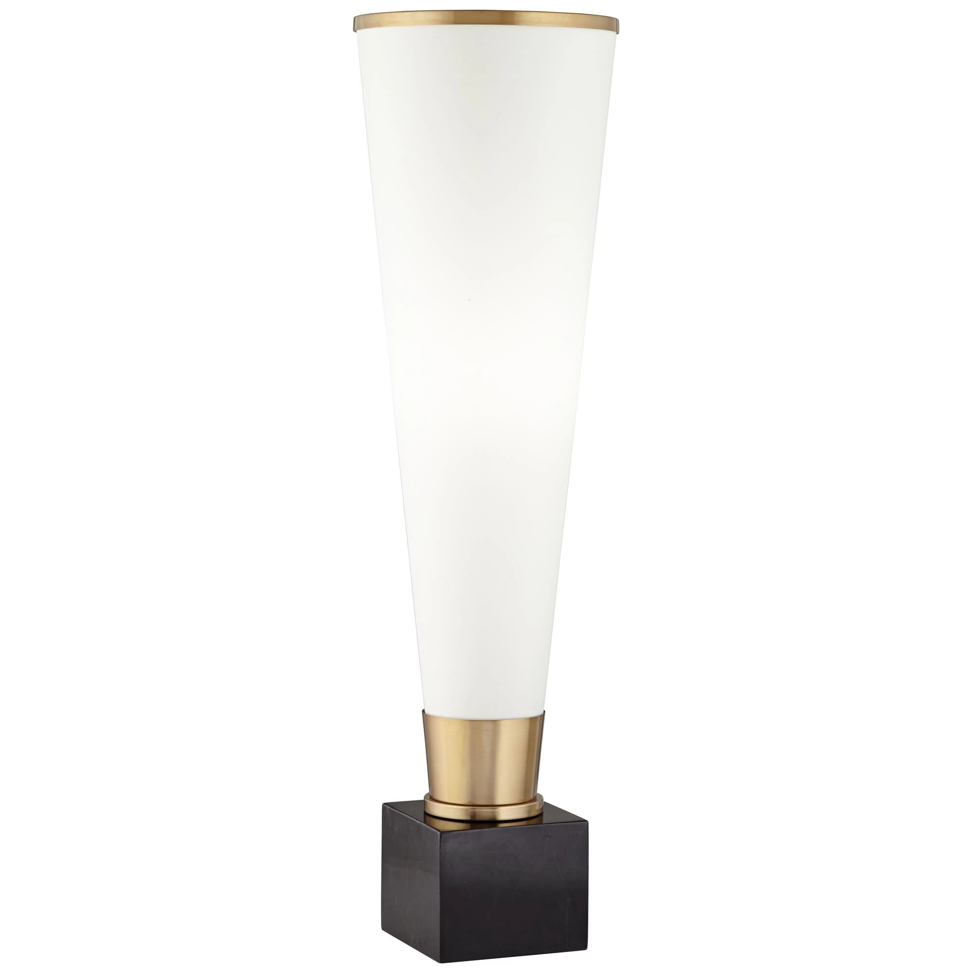 Executive in its design sensibilities, this tri-color table lamp will fill out any modern home decor. The funnel shade directs light upwards through its copper and white design, all firmly planted in a black, square base at the bottom. Ideal placement is anywhere that relishes in sophistication and charisma.