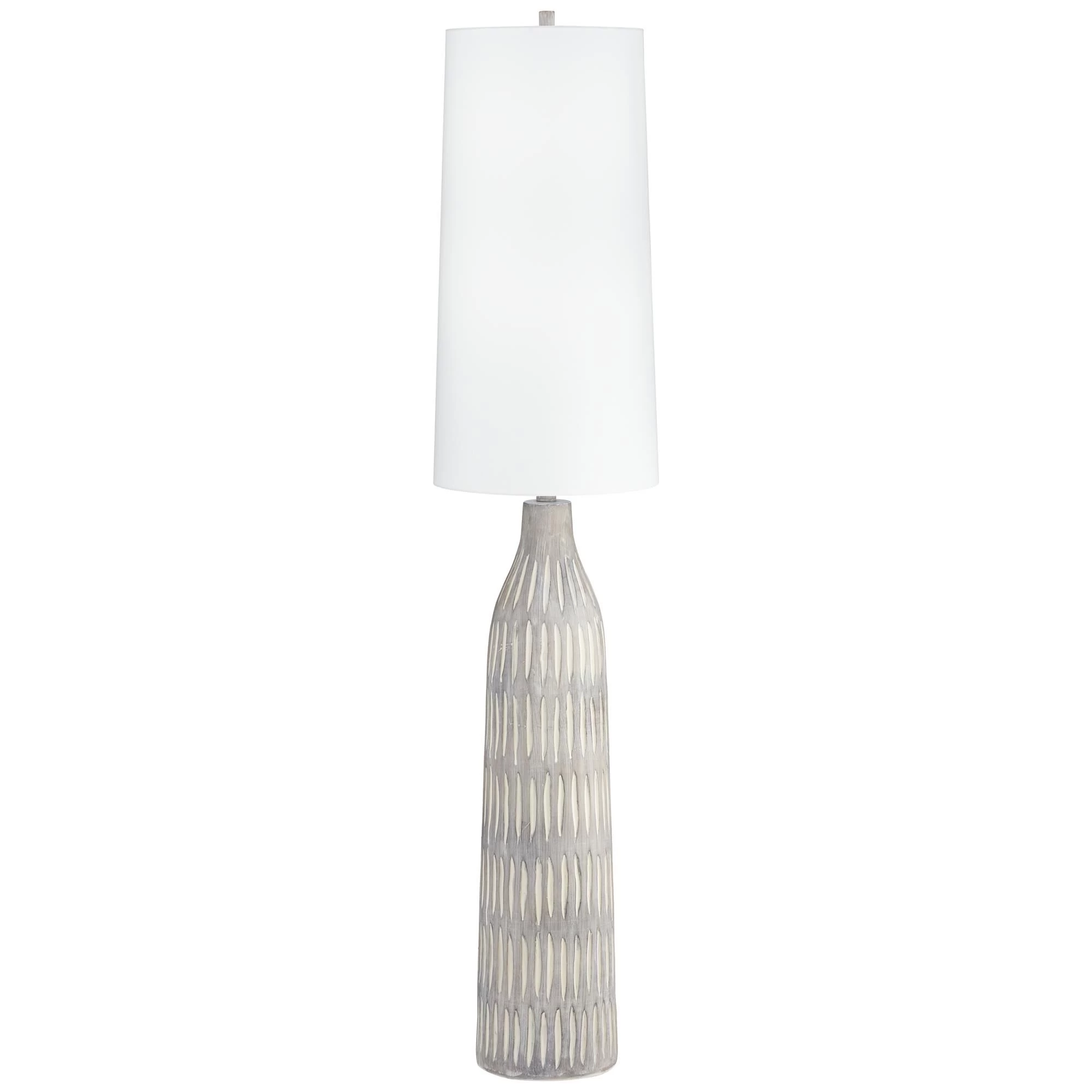 Adding texture and intrigue to design, this floor lamp features a hand carved resin base to emit a natural aesthetic. This floor lamp has a natural powder coat finish and is topped with a cylindrical white linen shade. A contemporary look to fit any space.