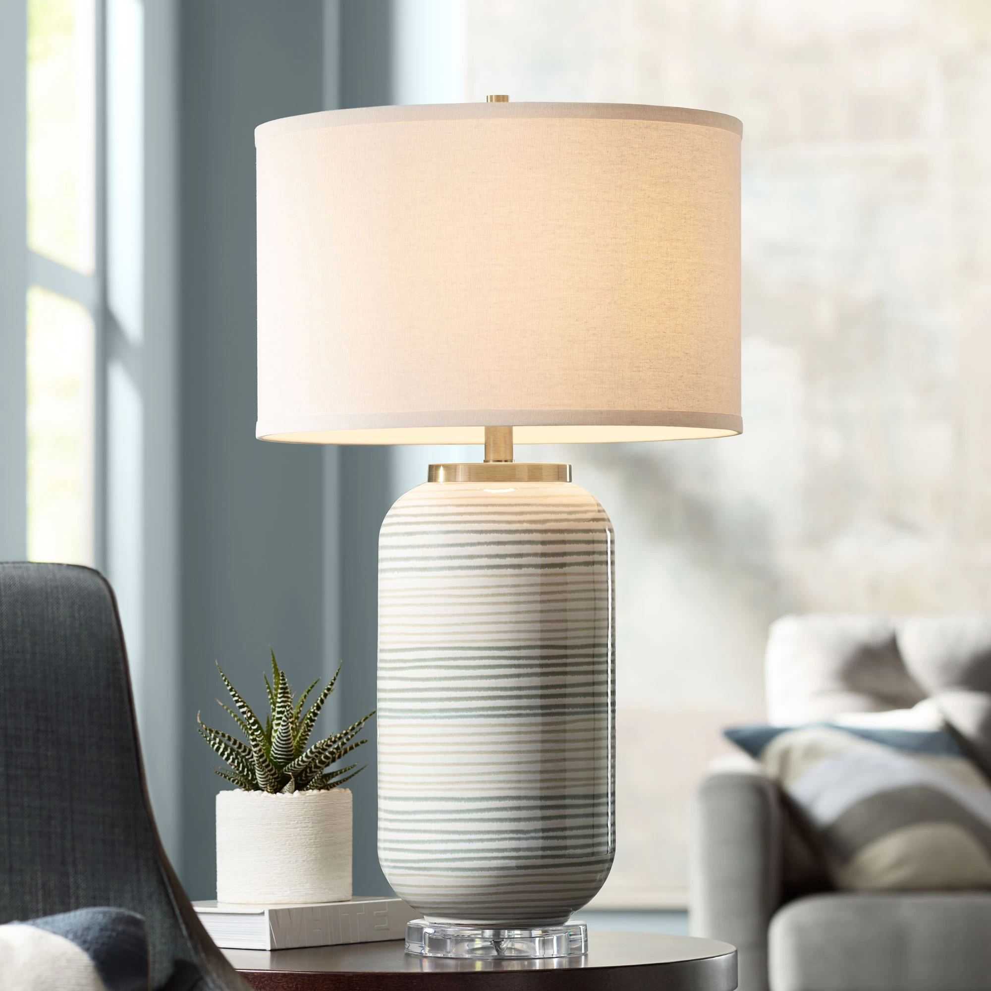 Delicate stripes highlight the capsule-shaped body of the Striped Adler Table Lamp. A clear foot supports the ceramic lamp, which is topped with a linen drum shade for excellent illumination. Multi-colored stripes add a touch of color to the stylish design.