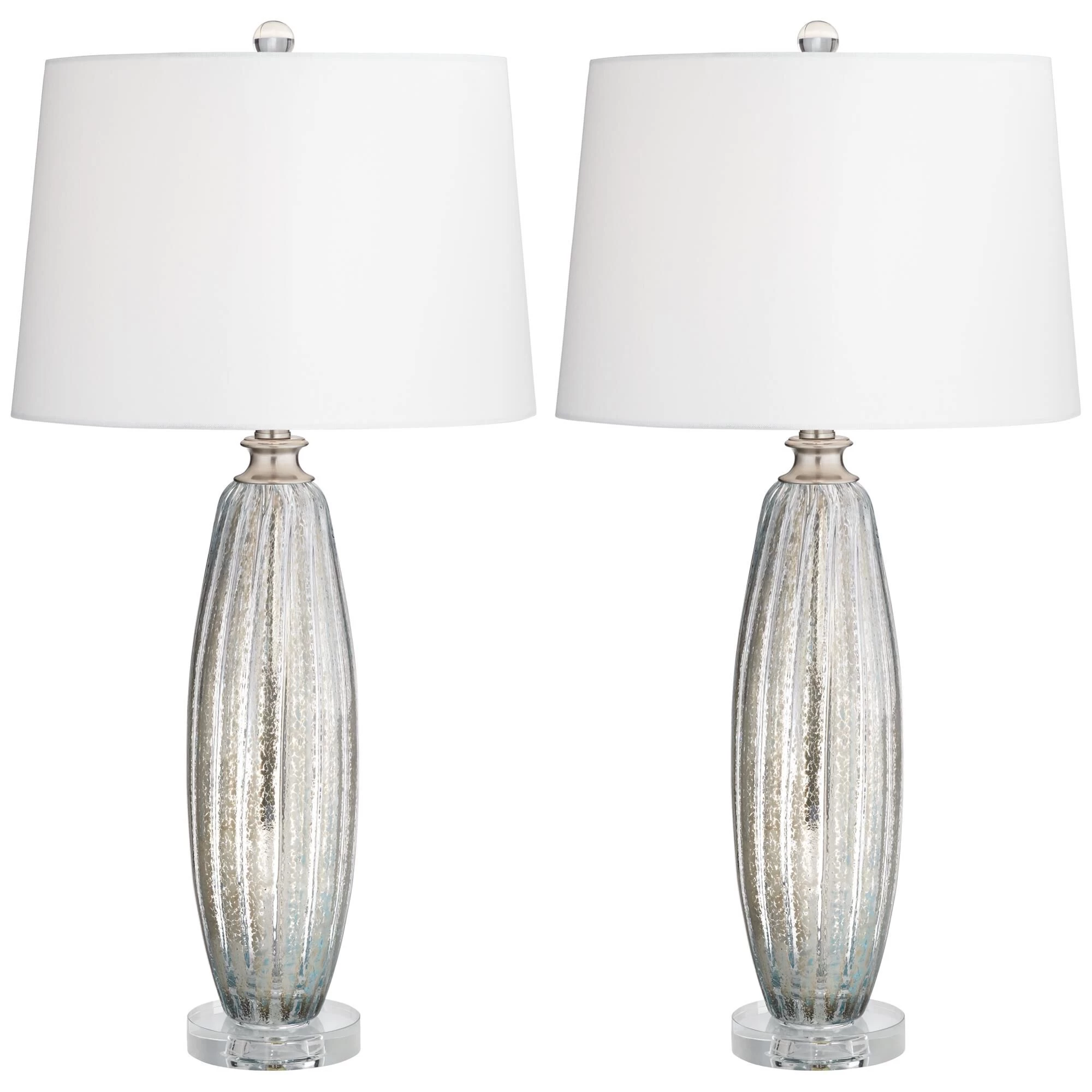 Tall, fluted bodies create a stunning look for this set of two glass table lamp, each with a wonderfully subtle champagne finish. The lamps rest of crystal disc bases and are topped with linen drum shades.