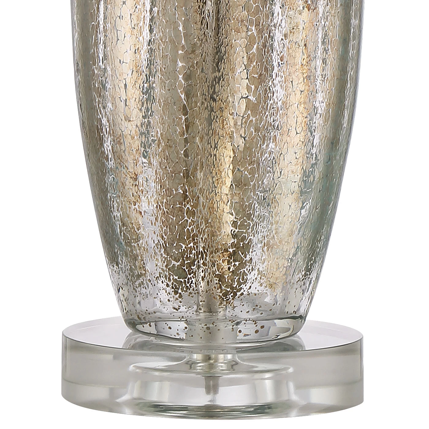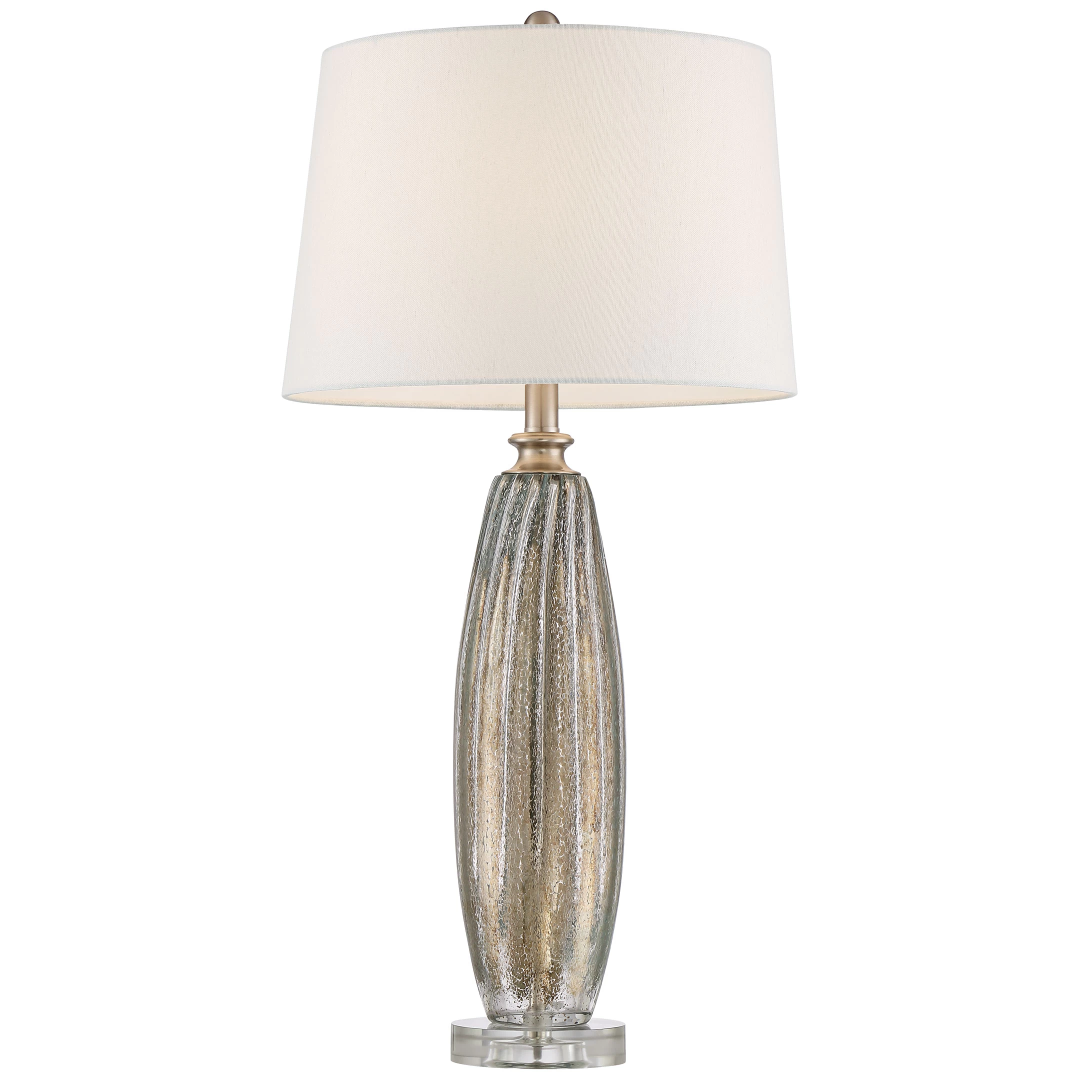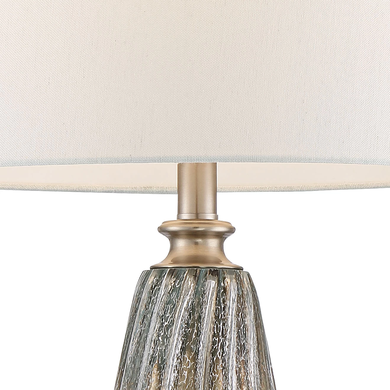 The Suri Table Lamp Set includes a pair of lamps with elegant fluted glass bases. A crackled Champagne finish adds a subtle shine and texture, which is complemented by a crystal disk foot and linen drum shade.