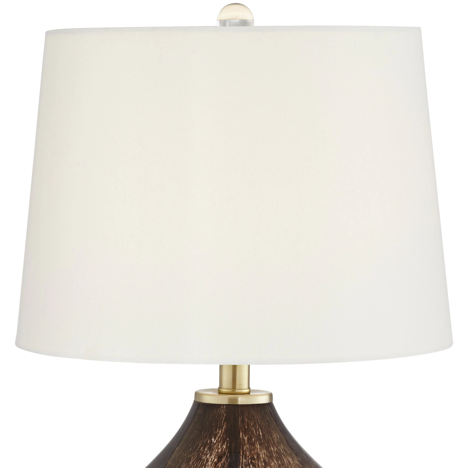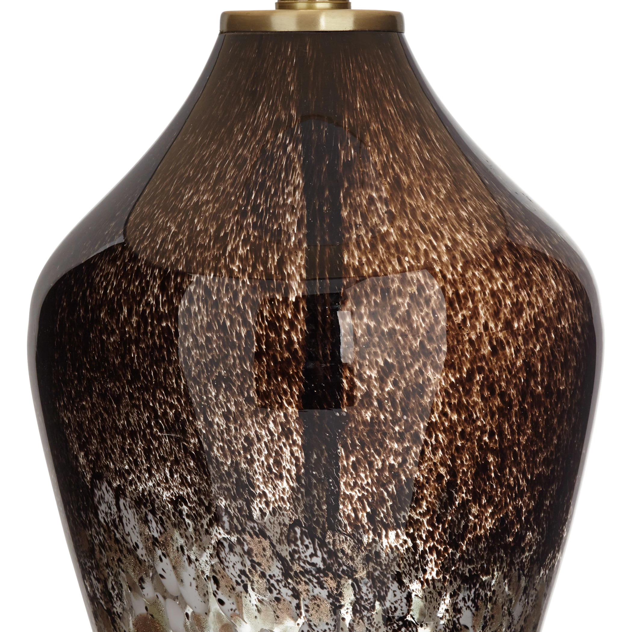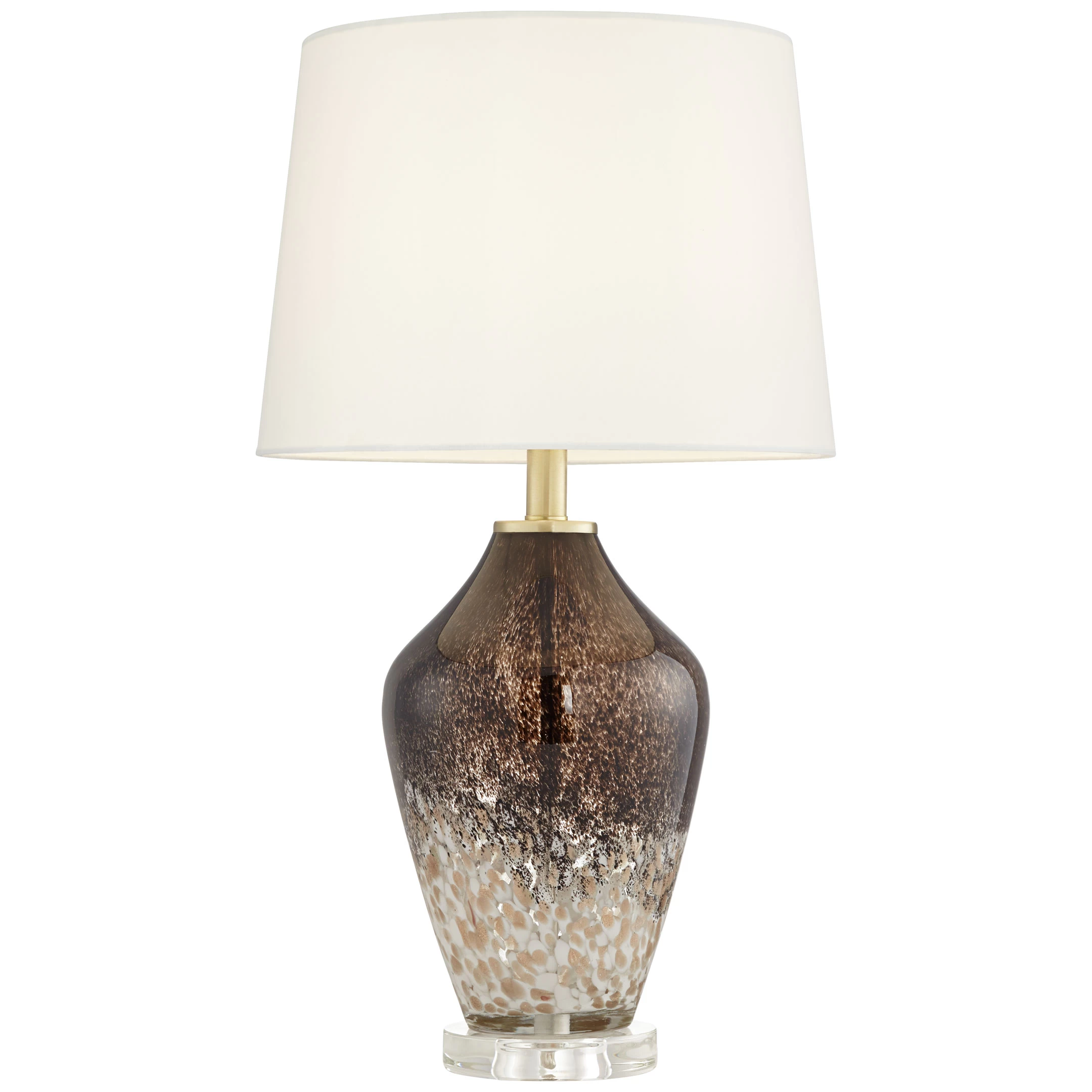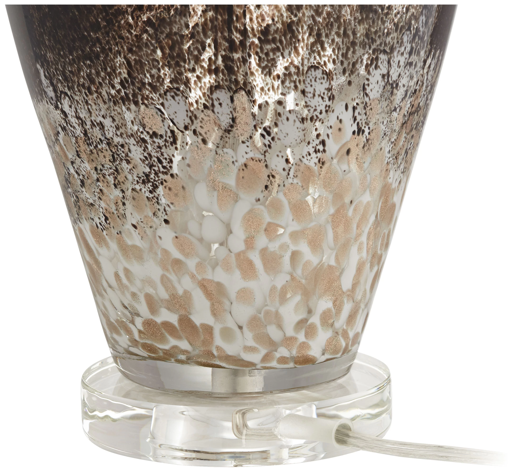 The Tiger Eyes Table Lamp Set features a pair of glass lamps with a speckled ombre finish in a chocolate brown and beige hue. The tapered vase-shaped base sits atop a clear glass disc and is topped with a tapered, faux silk shade for a transitional look that will complement any bedroom or living space. On/off switch located on socket.