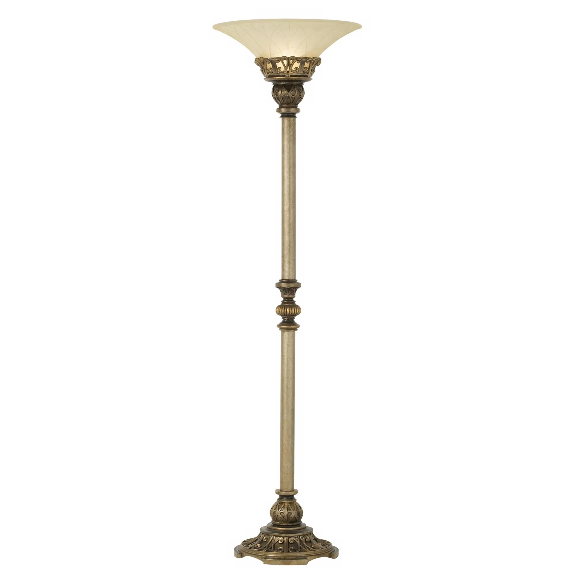 Bring on the elegance with this metal and resin floor lamp. Scrolling embellishments and elaborate detailing lend a look of luxury to this beautiful piece. A textured glass shade tops it off for a rich, regal design that’s sure to draw the eye.