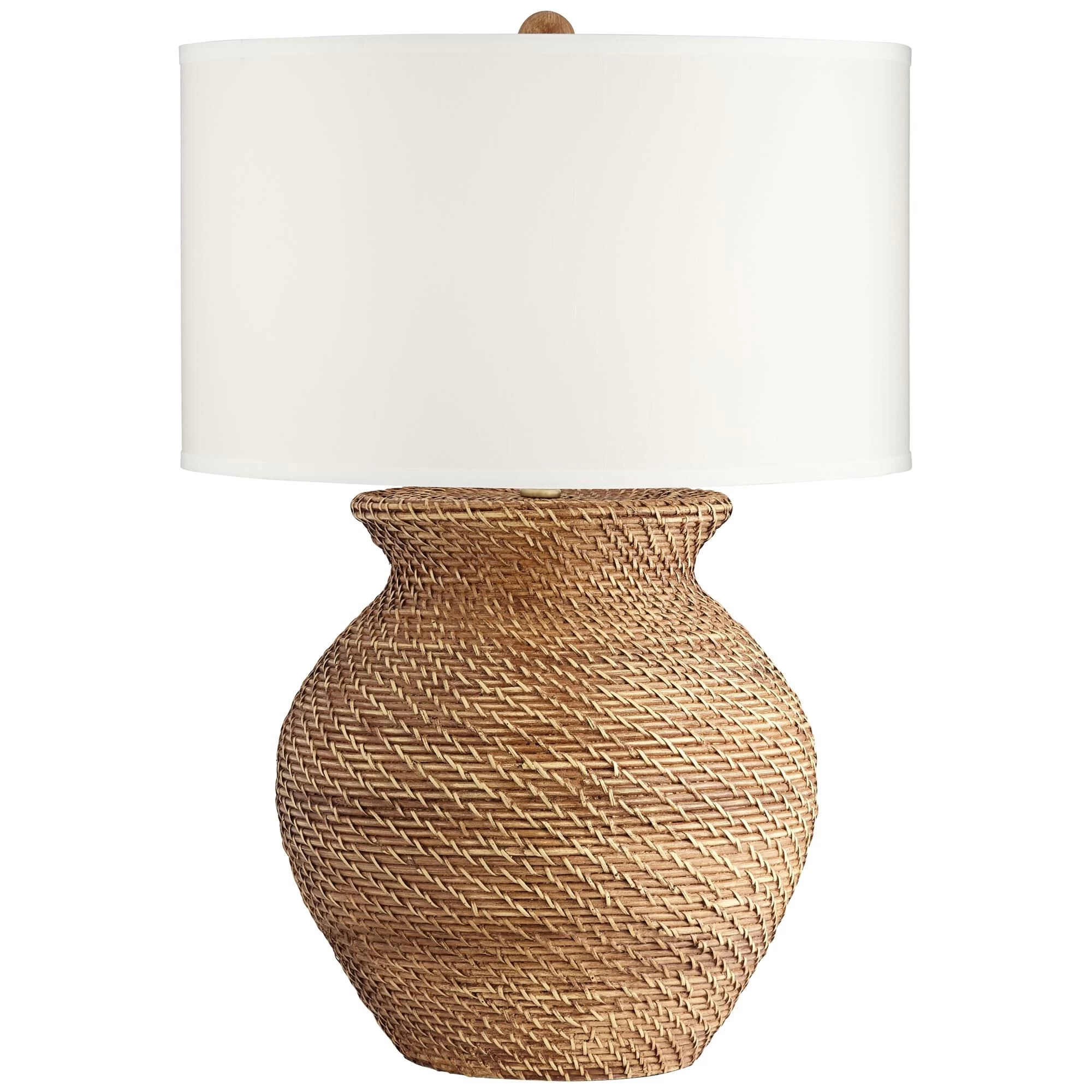 Created from brown weave finish rattan-look materials, the base of this jar table lamp invokes a coastal feel with exotic inspiration. A generous jar silhouette offers expressive charm that embellishes a casual setting in a beach or cabin. Topped with a soft off-white linen drum shade, this tasteful lamp is the perfect choice for a main living space or a freshly styled bedroom.