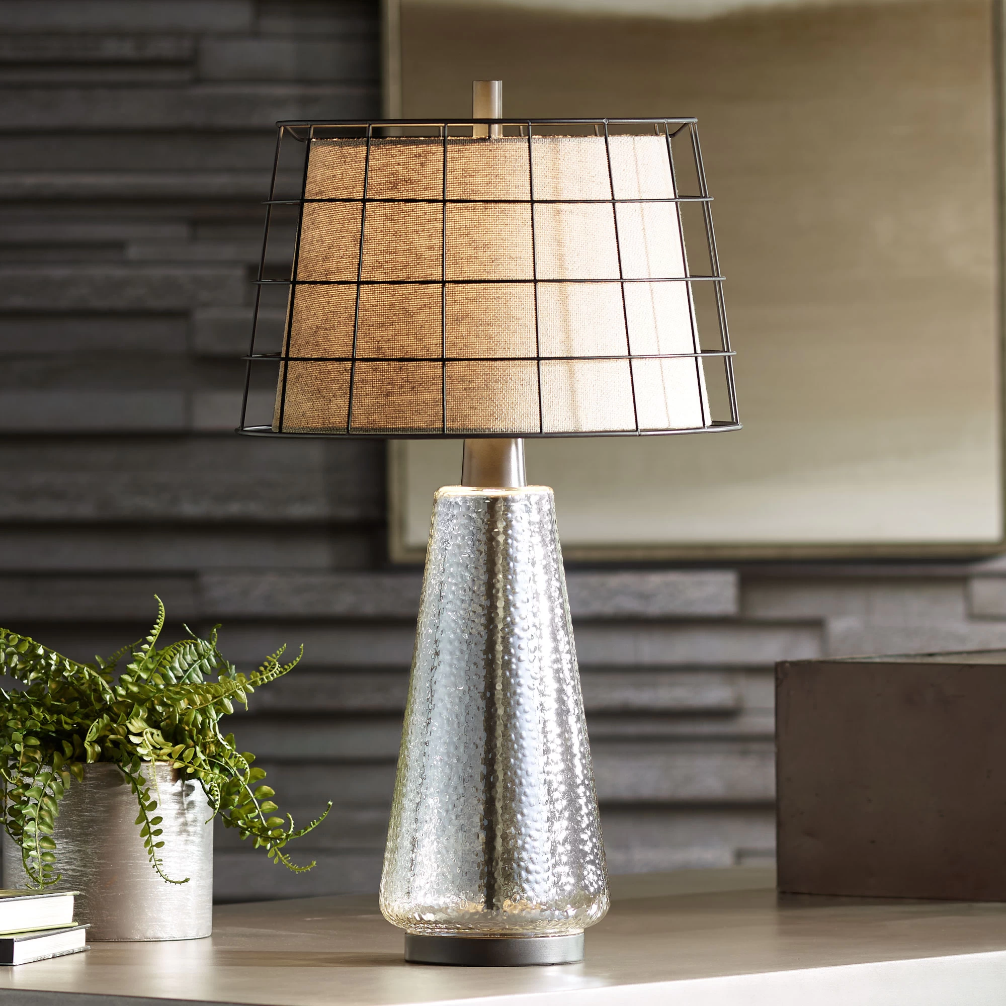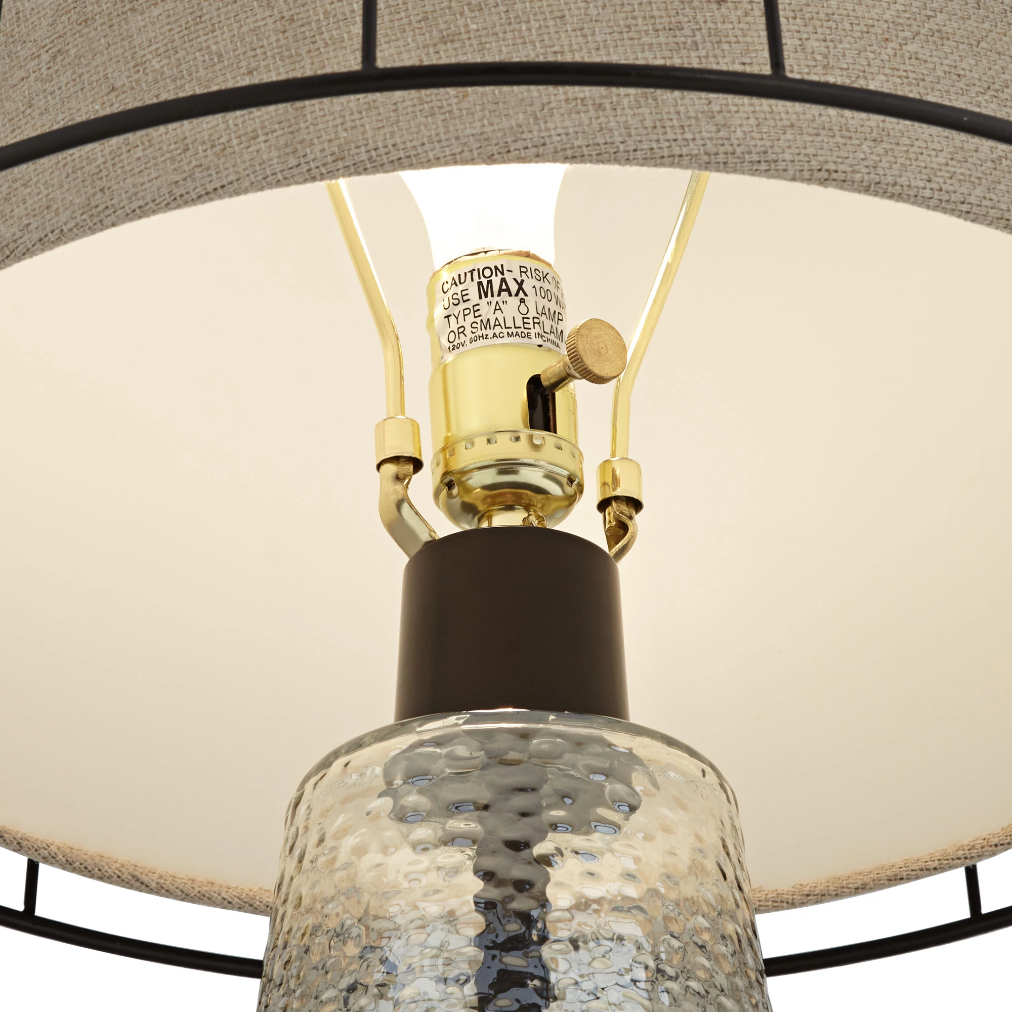 Old and new meet in the middle for the perfect balance with the Tristan Table Lamp. The burlap shade and outer cage give this piece a modern aesthetic on a vintage style frame. The clear seeded glass body adds a distinct touch of texture, and a USB port on the base provides convenient access to power for charging. An on/off rotary switch is installed on the socket.