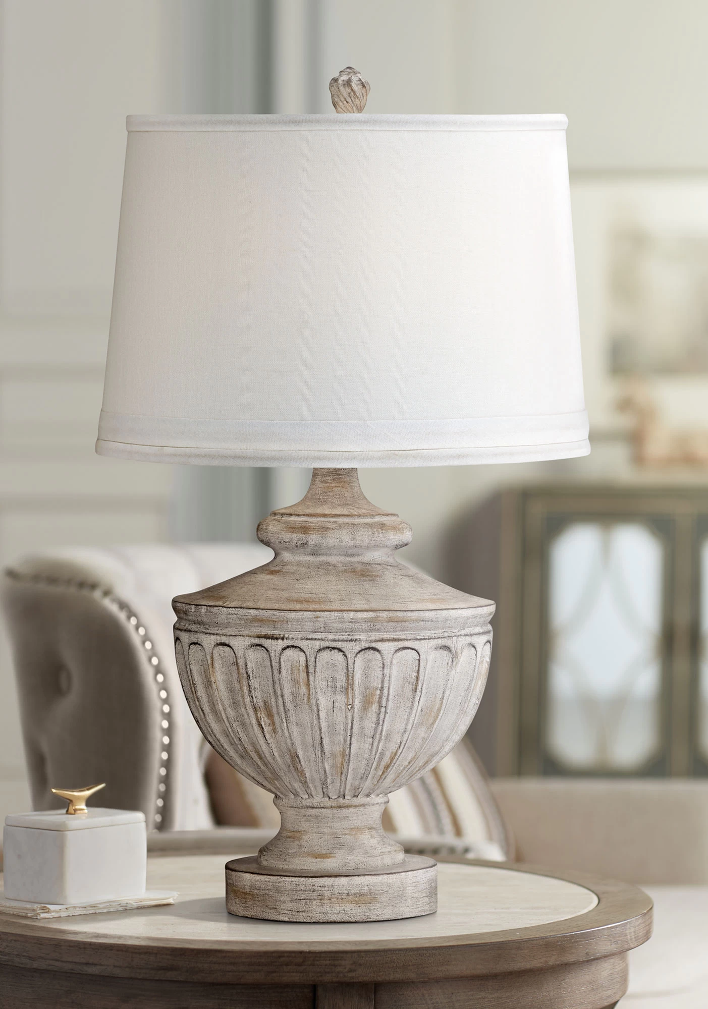 The Villa Pompeii Table Lamp features a classic urn silhouette in a weathered gray and brown finish. The resin base is topped with an oval linen shade for a sophisticated, classic look.