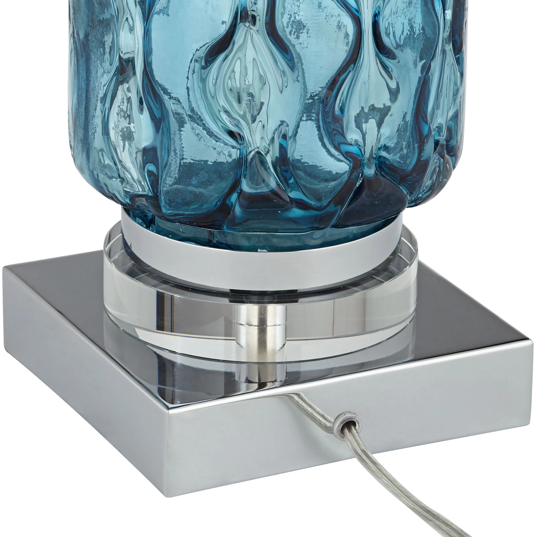 The Waverly Table Lamp features a contemporary, coastal design with a wavy blue glass base that evokes flowing water. A white faux silk shade and Chrome finished metal accents add modern elegance. On/off switch installed on socket.