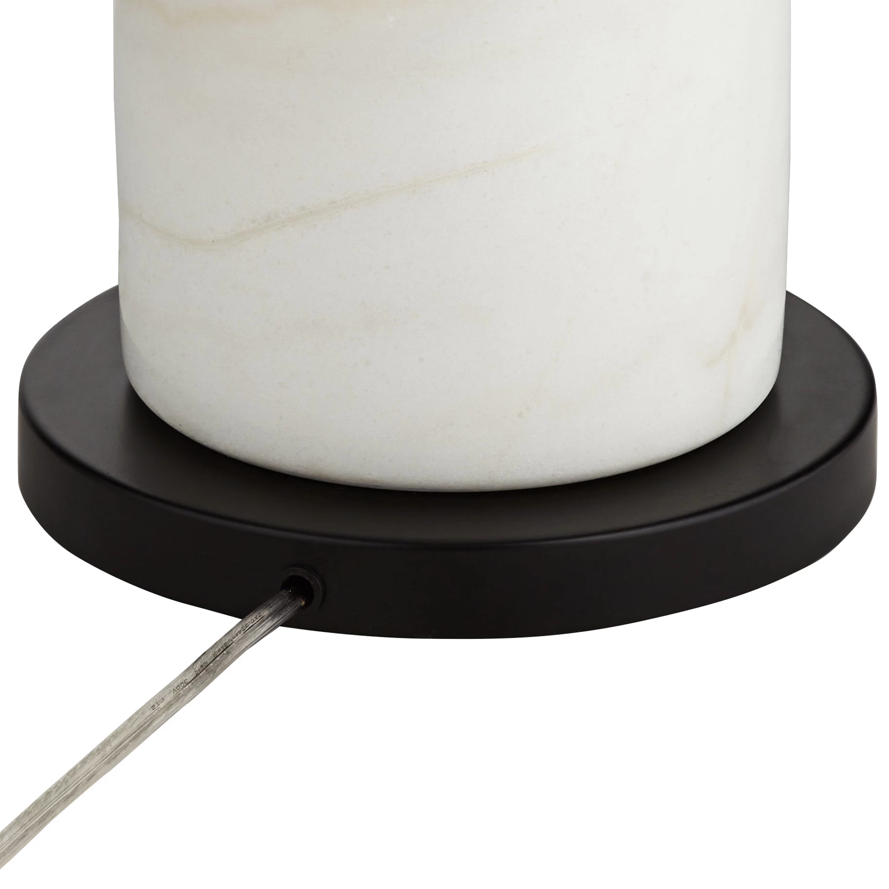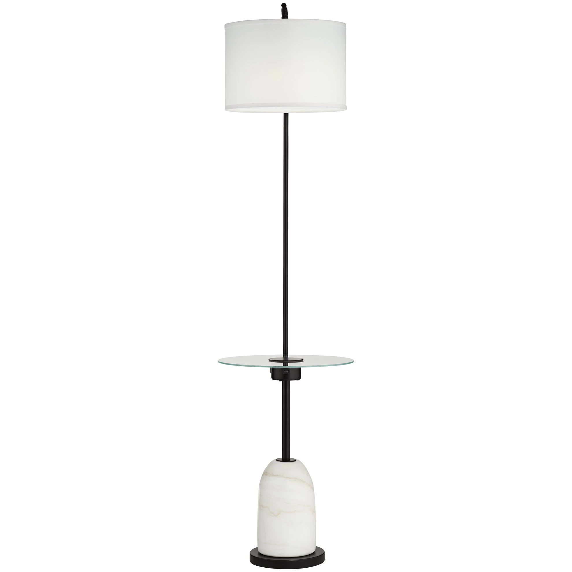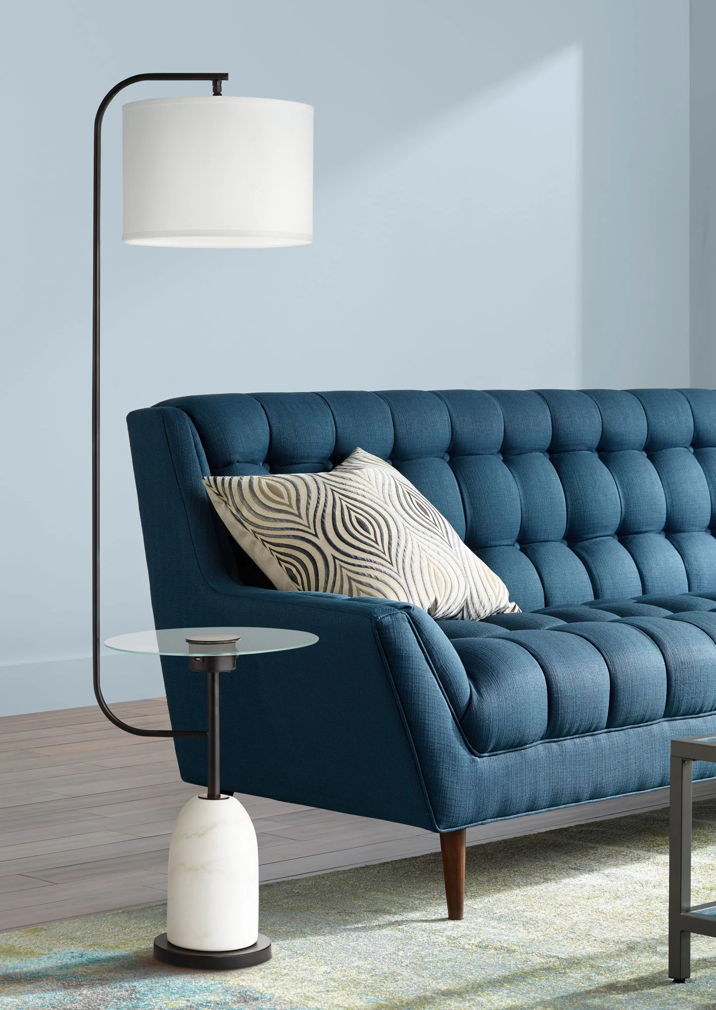 The Wellington Floor Lamp makes an elegant addition to a modern living space with its monochrome color palette. A black metal downbridge frame rises from a tapered white marble base and supports a white linen drum shade. The frame also includes a round glass tray table, making Wellington a perfect fit next to a comfortable seat. A USB charging port and on/off switch are installed beneath the tabletop.