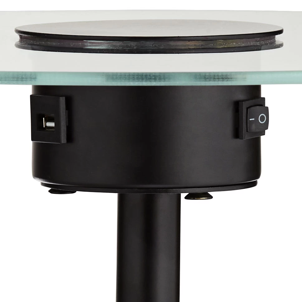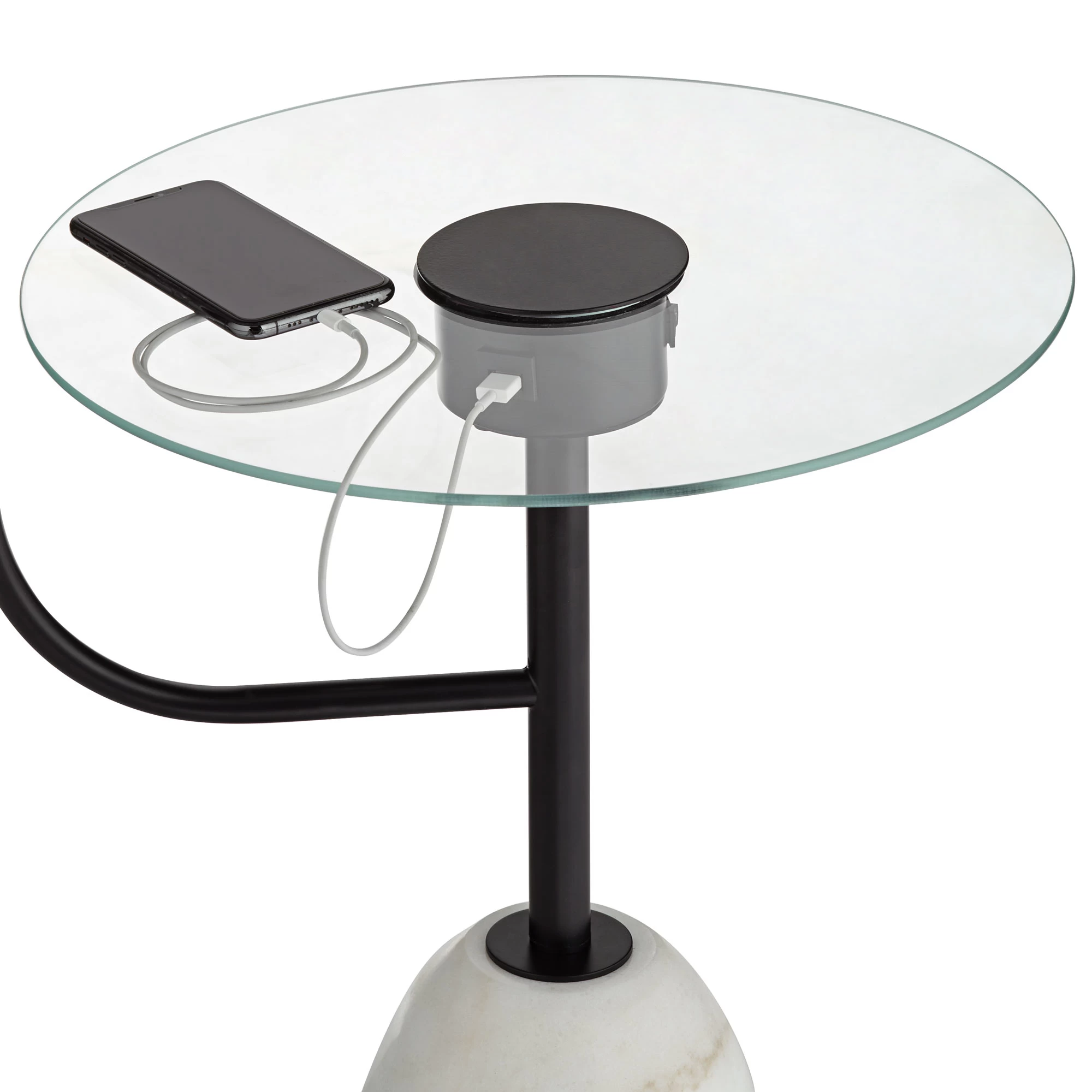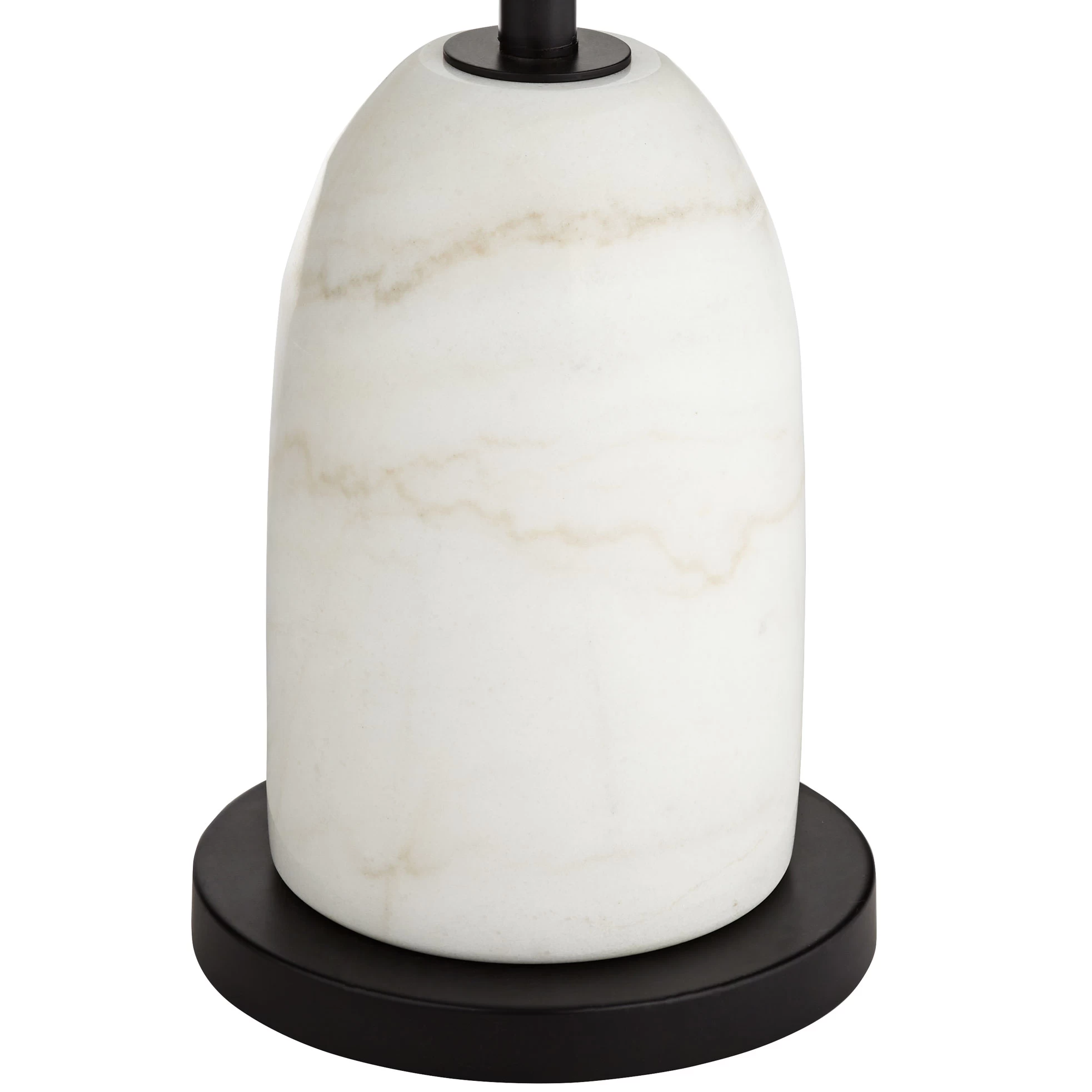 The Wellington Floor Lamp makes an elegant addition to a modern living space with its monochrome color palette. A black metal downbridge frame rises from a tapered white marble base and supports a white linen drum shade. The frame also includes a round glass tray table, making Wellington a perfect fit next to a comfortable seat. A USB charging port and on/off switch are installed beneath the tabletop.