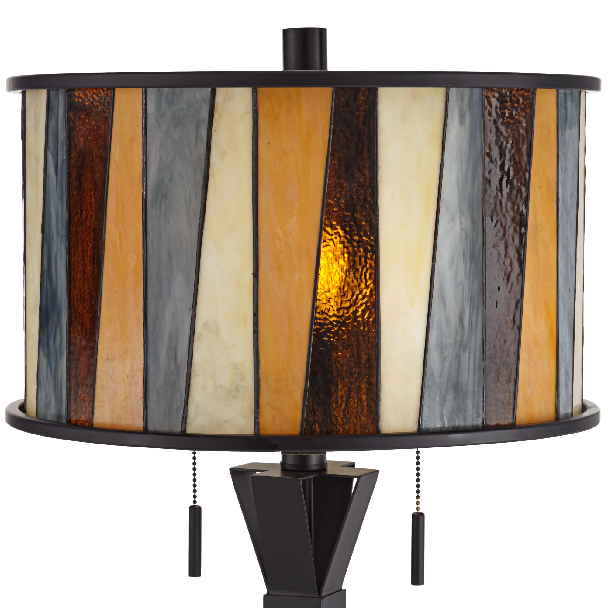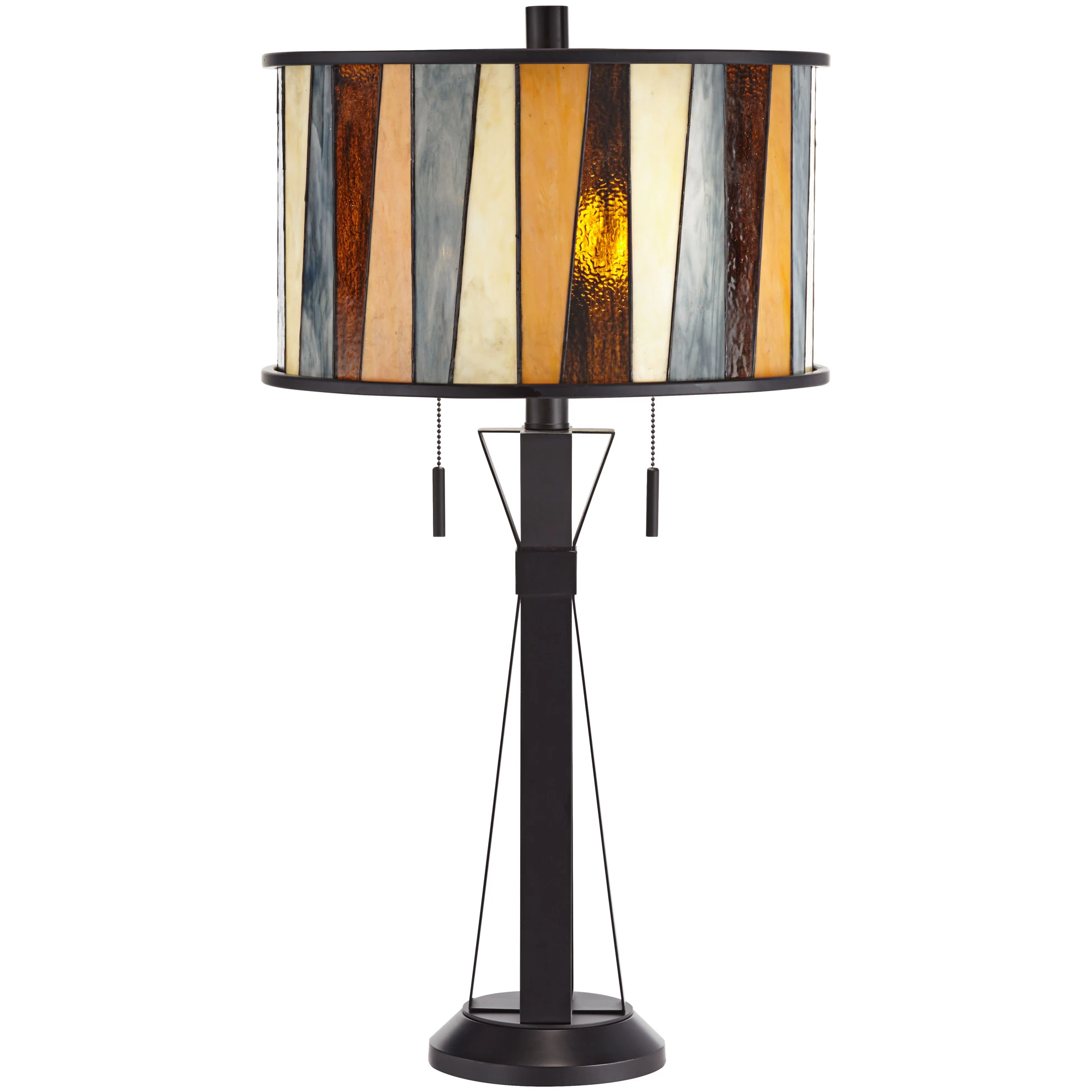 The Westbrook Table Lamp features alternating shards of colorful art glass to create a beautiful, Tiffany-style shade. A powder coated matte black body with an hourglass silhouette makes a bold statement. Two on/off pull chains allow independent control of each bulb.