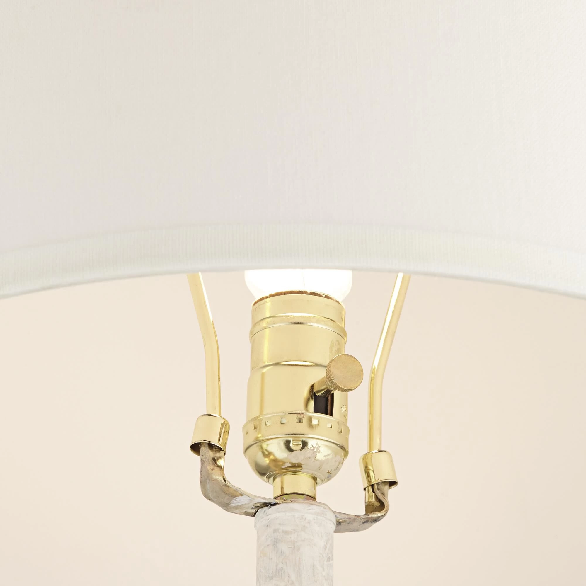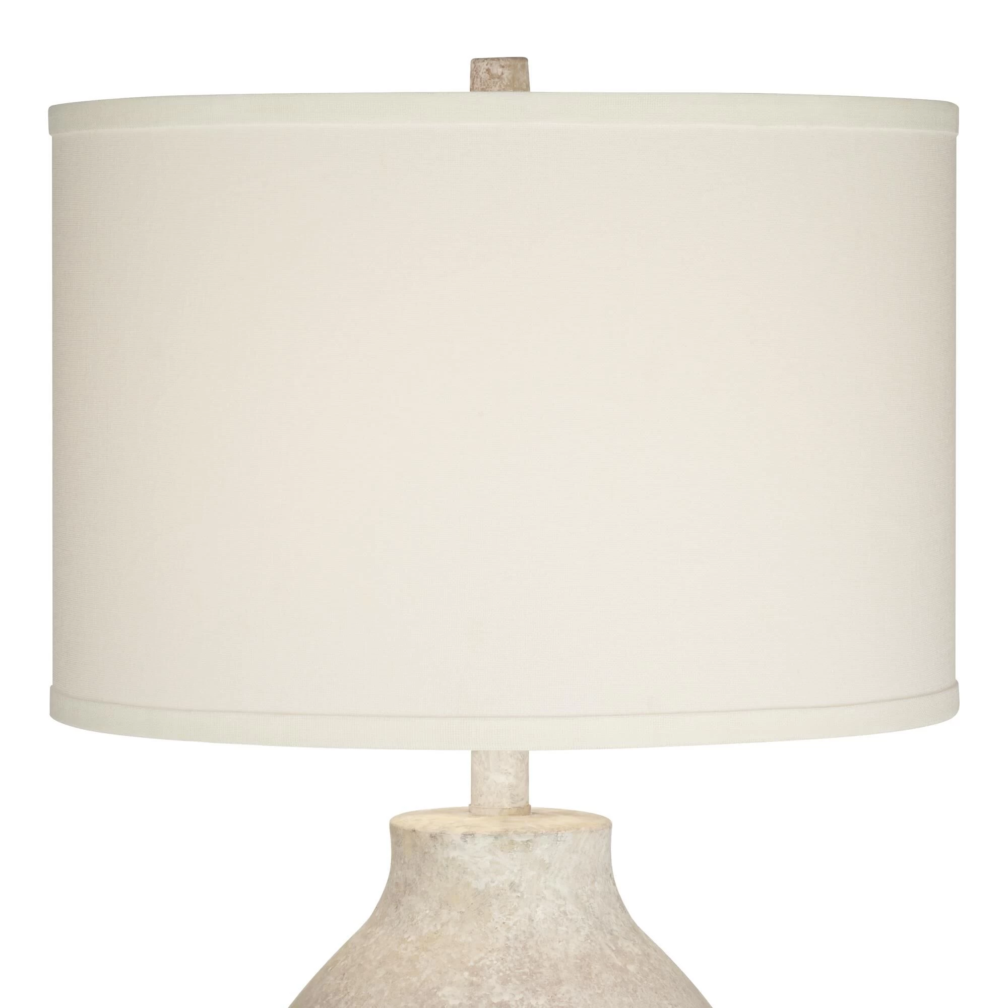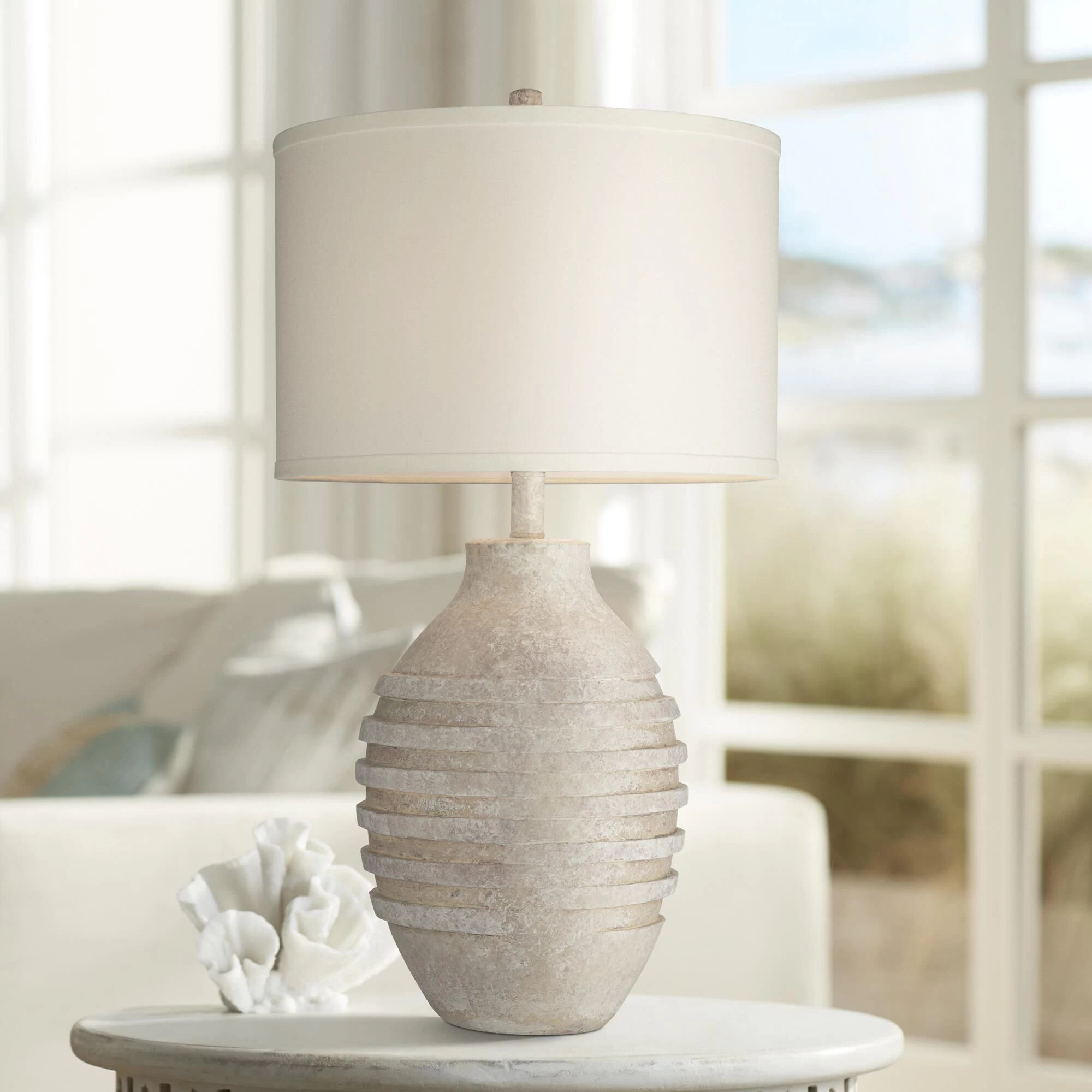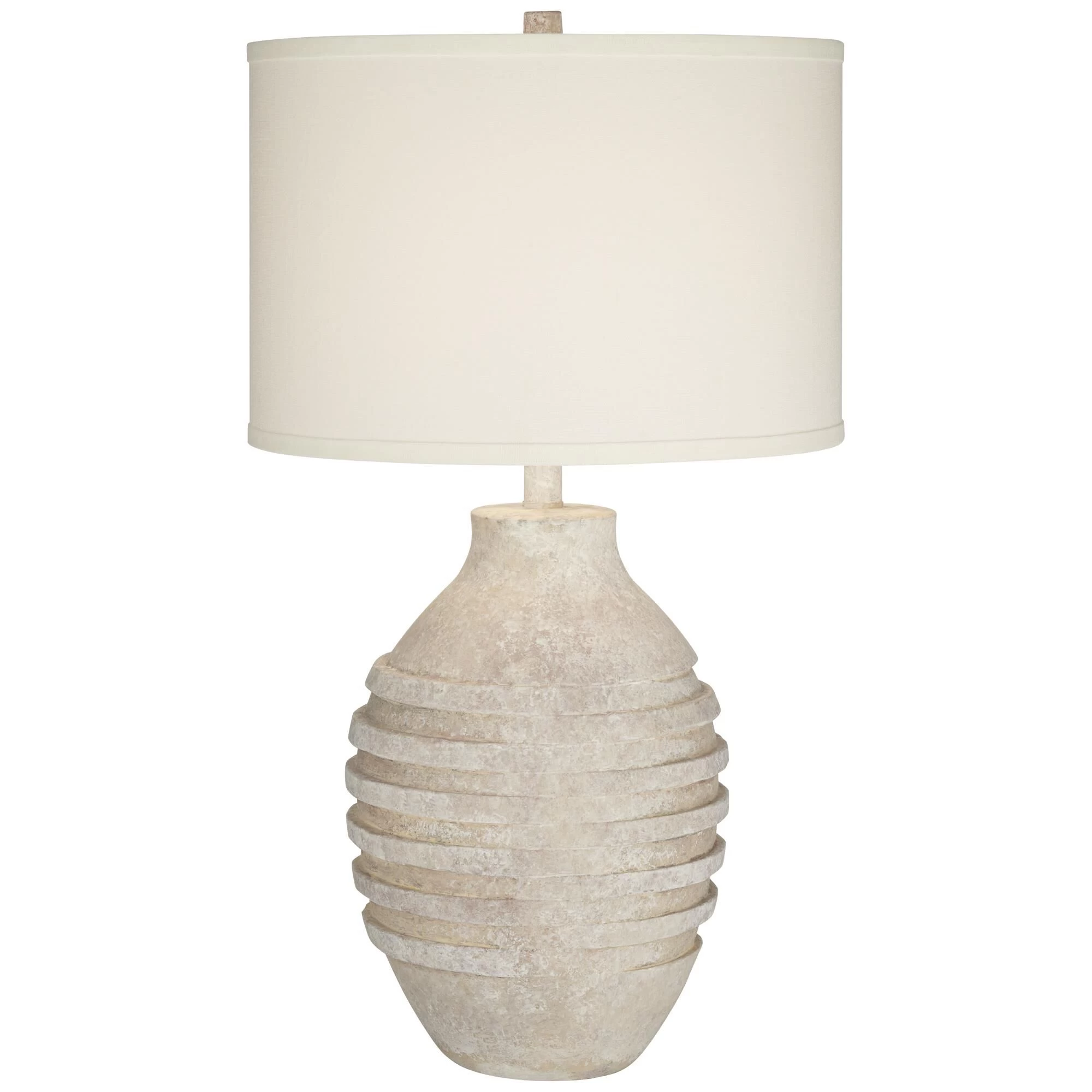Ribs and grooves lend a minimalist elegance and movement to this white jar table lamp. A contoured jar base covered in a weathered-like white finish presents an old-world aesthetic and contemporary artisan look and feel. Perfectly suited for elevated rustic interiors.
