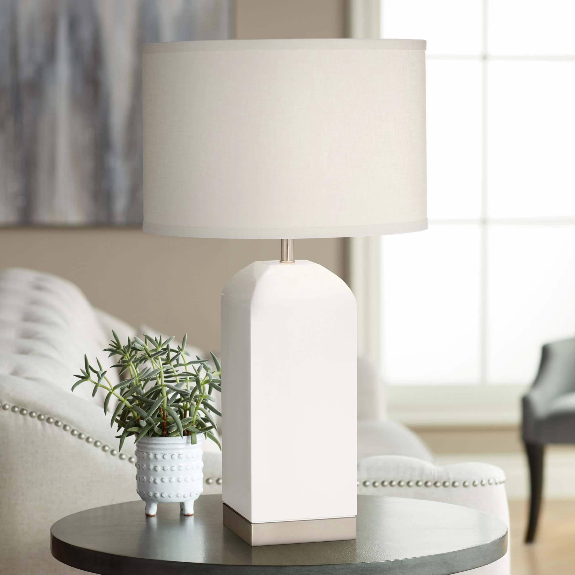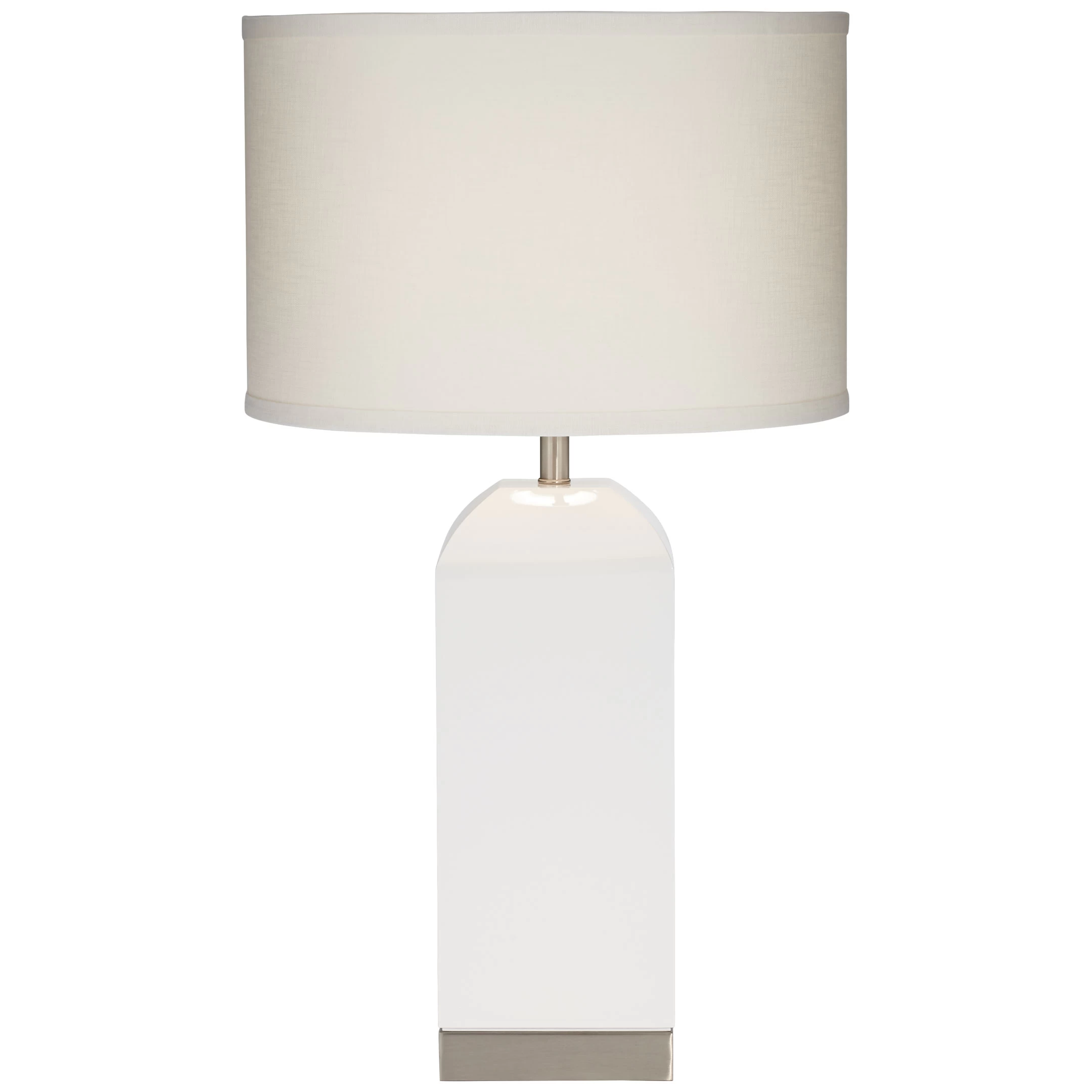 The Willa Table Lamp features a resin base with a shape inspired by a classic milk carton. The base is fittingly finished with a glossy white glaze and topped with a cream linen shade.