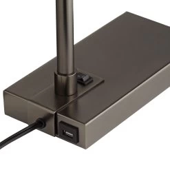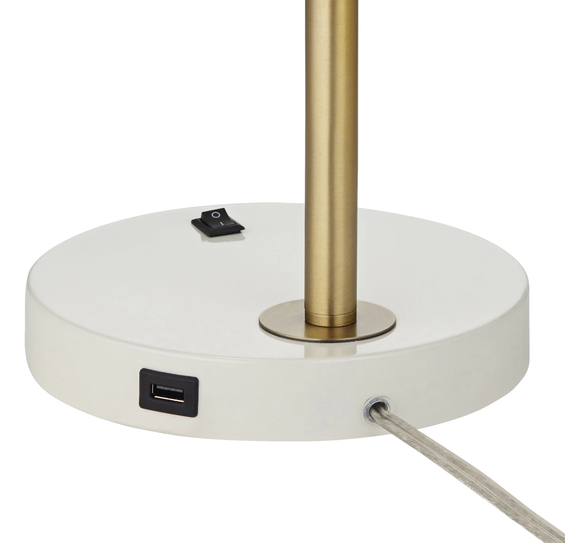 The Windsor Table Lamp features an angled arm topped with an adjustable metal shade that can be angled to direct light precisely where it is needed. The shade is finished in white to complement the stem’s Antique Brass finish. A USB port on the base provides convenient access to power for charging a phone or other device. On/off switch on base.