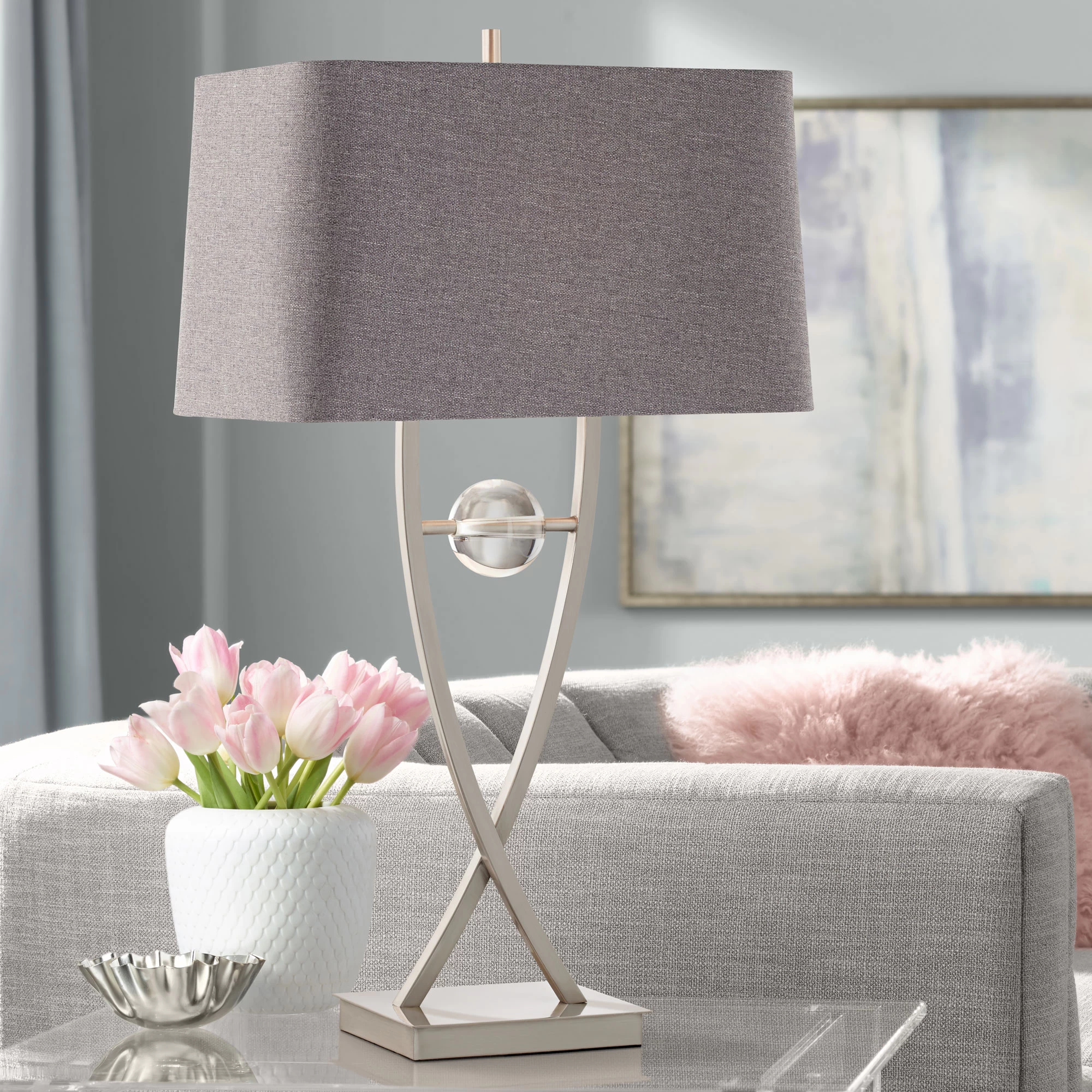 The Wishbone Table Lamp features a frame of two crisscrossing metal arms cross below dark grey linen shade. A glimmering acrylic orb between the arms adds a decorative touch.