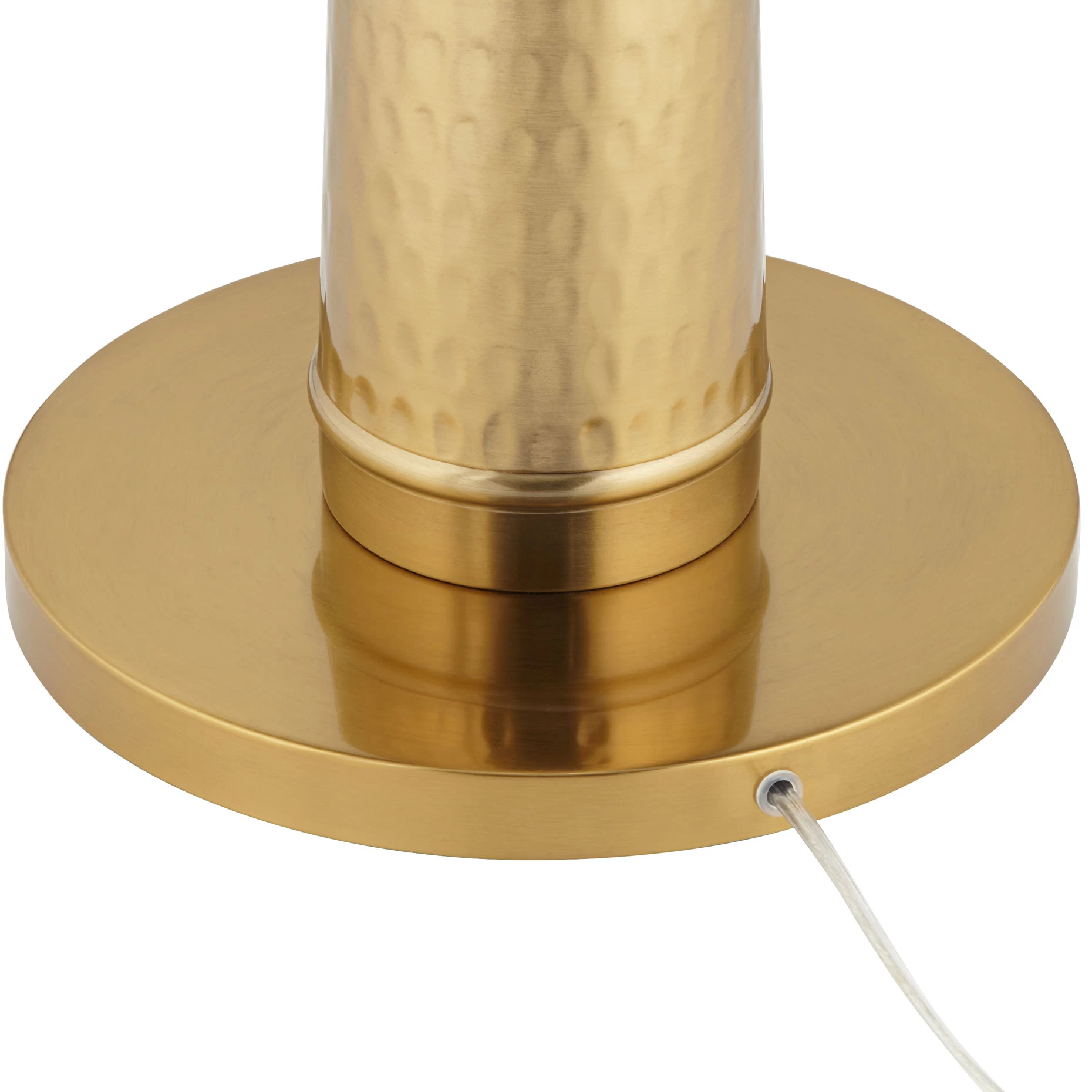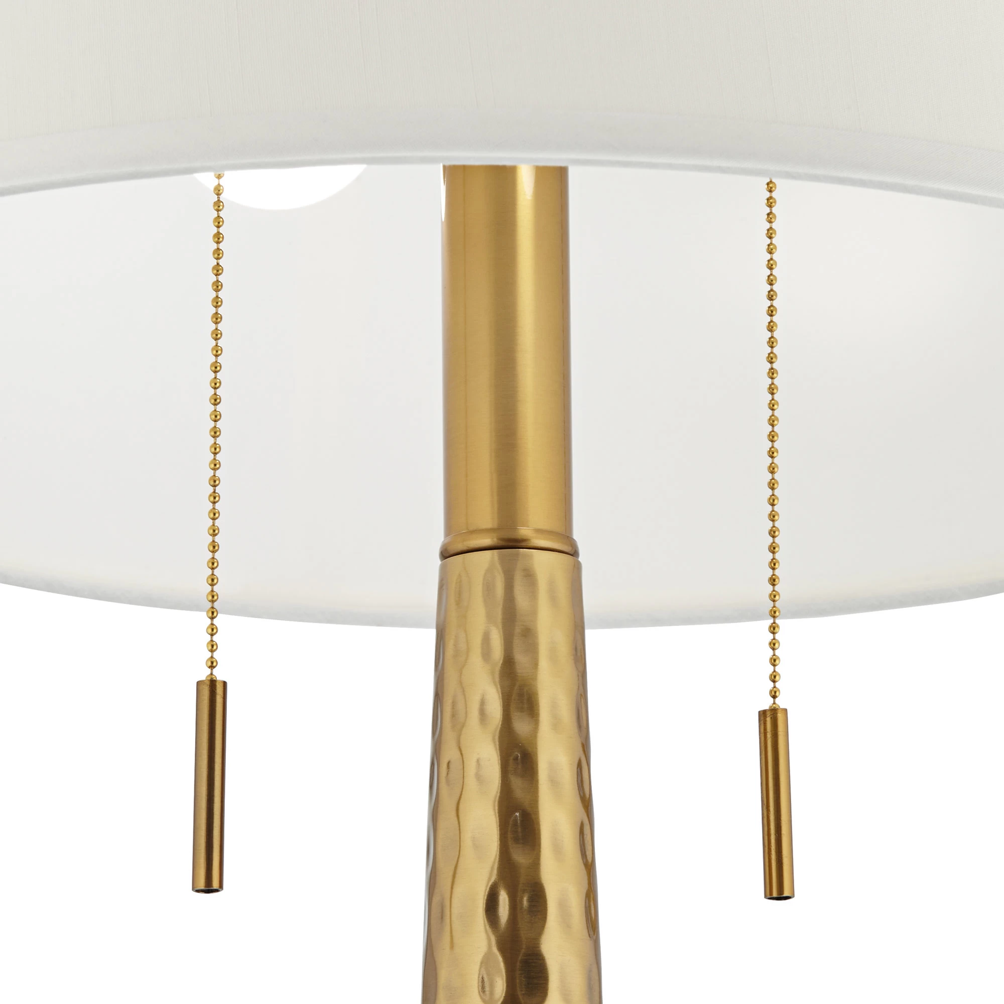 The Zarah Floor Lamp features a telescopic silhouette topped with an off-white tapered shade. Small divots along the base add a touch of texture to the metallic finish. Two on/off pull chains allow each bulb to be operated individually.